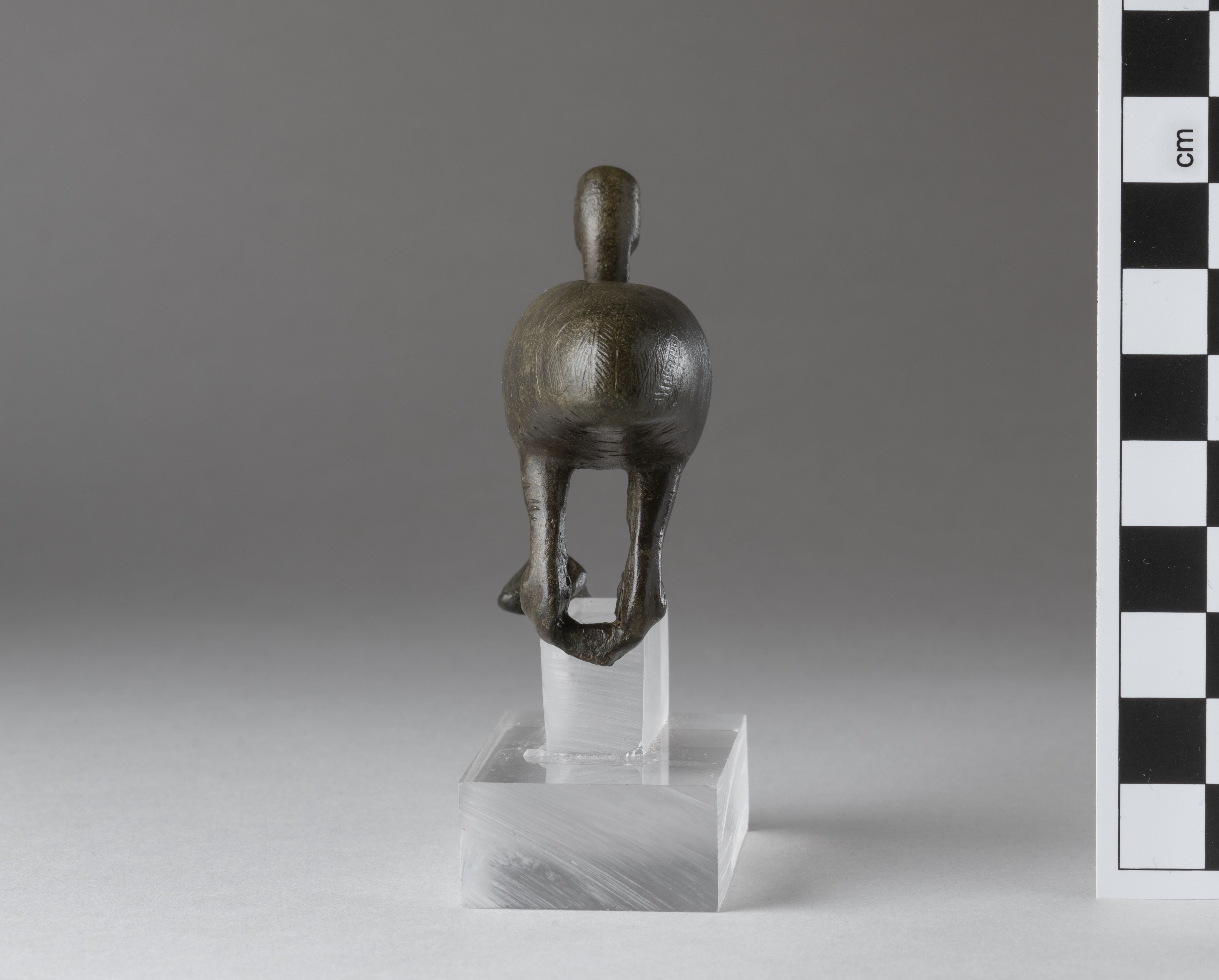 Figure of a squatting ibis. The beak is long, curved downward, and decorated with incised lines. The neck is adorned with a collar composed of two registers. The wings are outlined by a border, while the body is entirely decorated with small incisions. The feather details on the tail are finely executed. The legs are bent; the right leg is broken at the knee, while the left has the central toe fractured. The tenon, now broken, connected the two legs at the knee joints. The figure is mounted on a plexiglass base. The object appears to have been produced using the lost-wax technique for hollow casts.