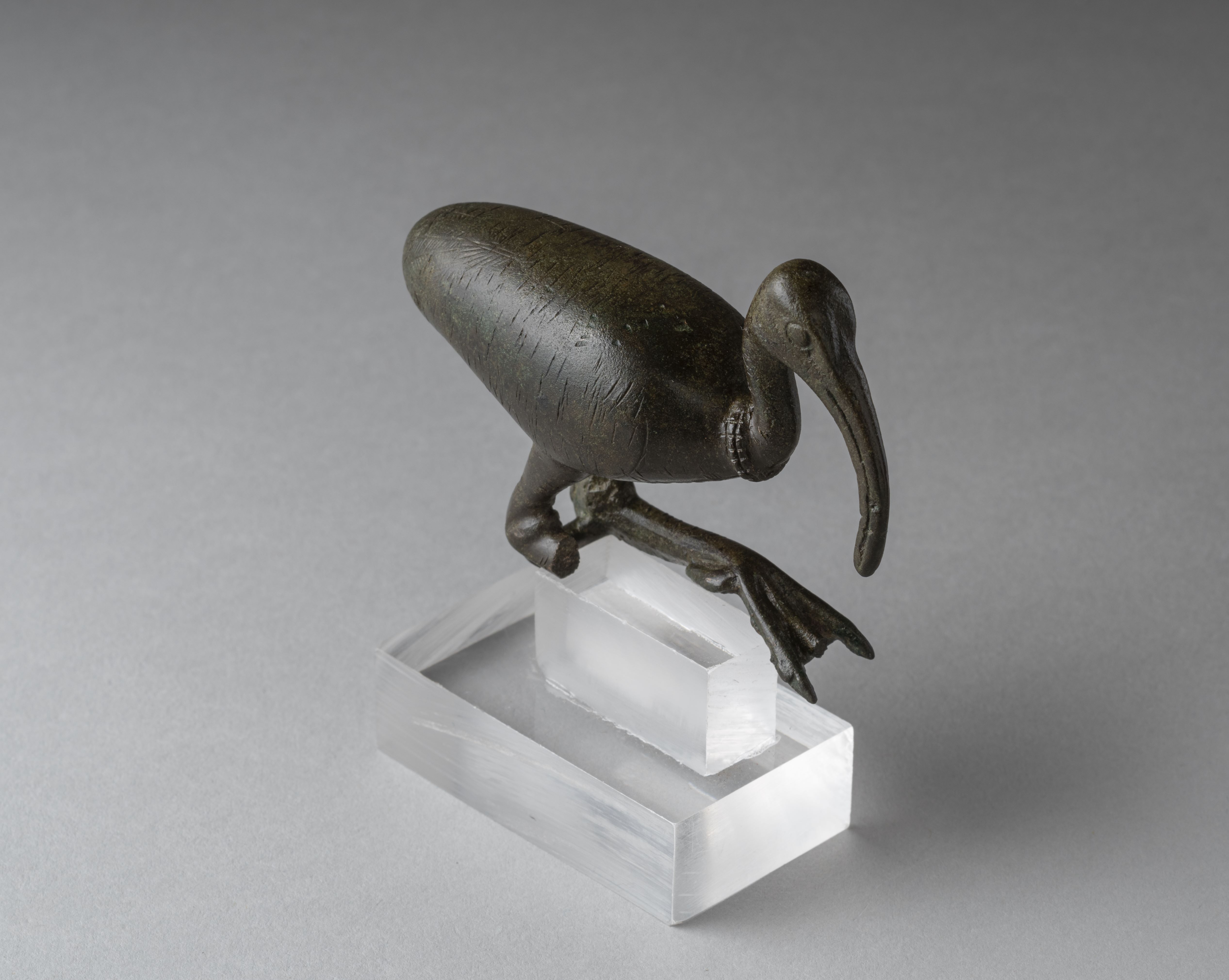 Figure of a squatting ibis. The beak is long, curved downward, and decorated with incised lines. The neck is adorned with a collar composed of two registers. The wings are outlined by a border, while the body is entirely decorated with small incisions. The feather details on the tail are finely executed. The legs are bent; the right leg is broken at the knee, while the left has the central toe fractured. The tenon, now broken, connected the two legs at the knee joints. The figure is mounted on a plexiglass base. The object appears to have been produced using the lost-wax technique for hollow casts.