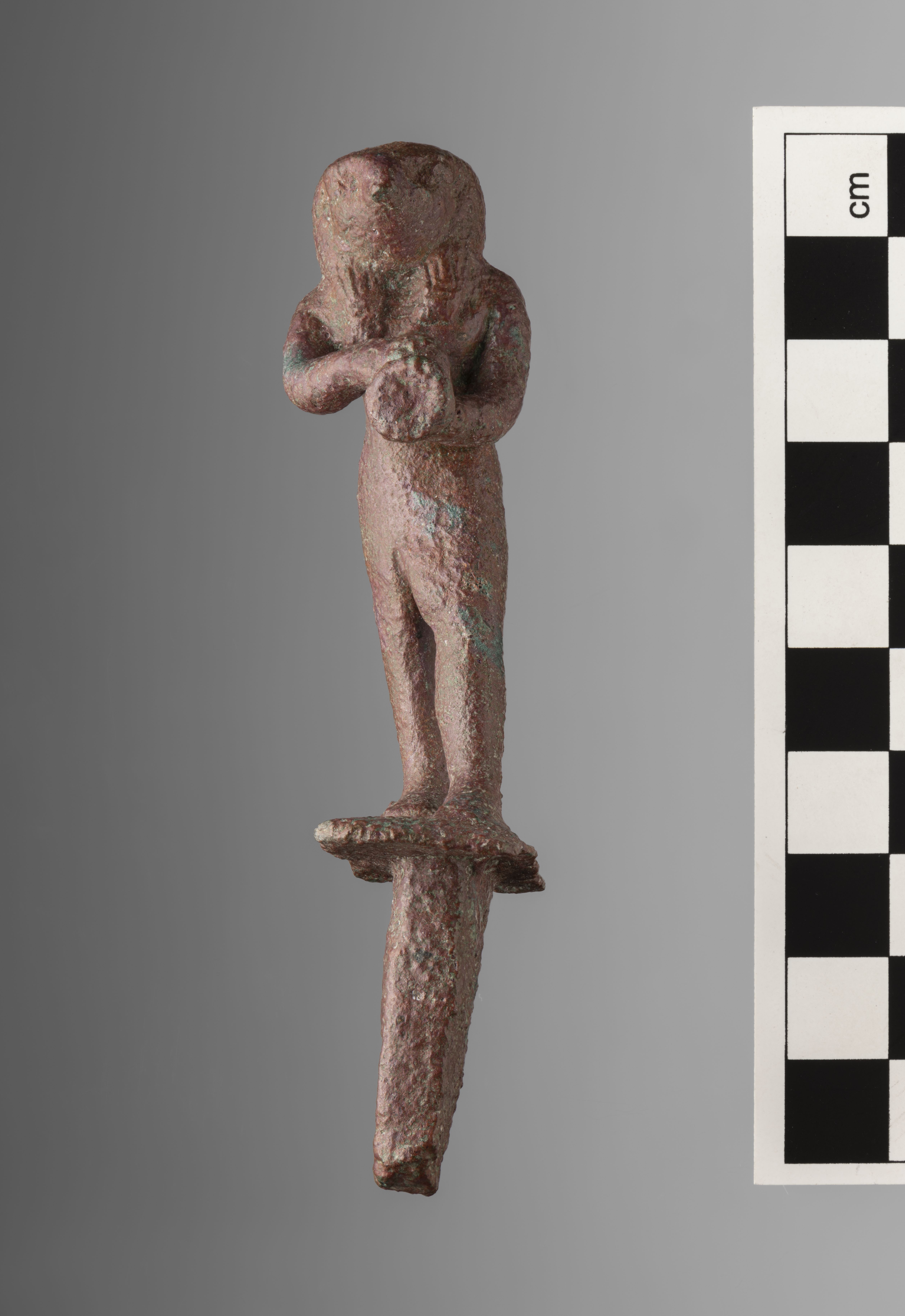 Standing figure of Horus represented as a falcon-headed, anthropomorphic deity, pouring a libation from a hes-vase. The god has a tripartite wig. The forehead forms a flat surface, the head is rather rectangular, the eyes are visible, and the beak is large and protruding. A collar consisting of two horizontal lines is visible between the wig’s lappets. The god pours a libation from a hes-vase which he holds up in front of his torso with both hands. Horus has his left leg advanced. The god has a shendyt-kilt with a central tab hanging down. The feet rest on a rectangular base, from which a thick rectangular tenon projects down. The object is made in the lost-wax technique for solid casts.