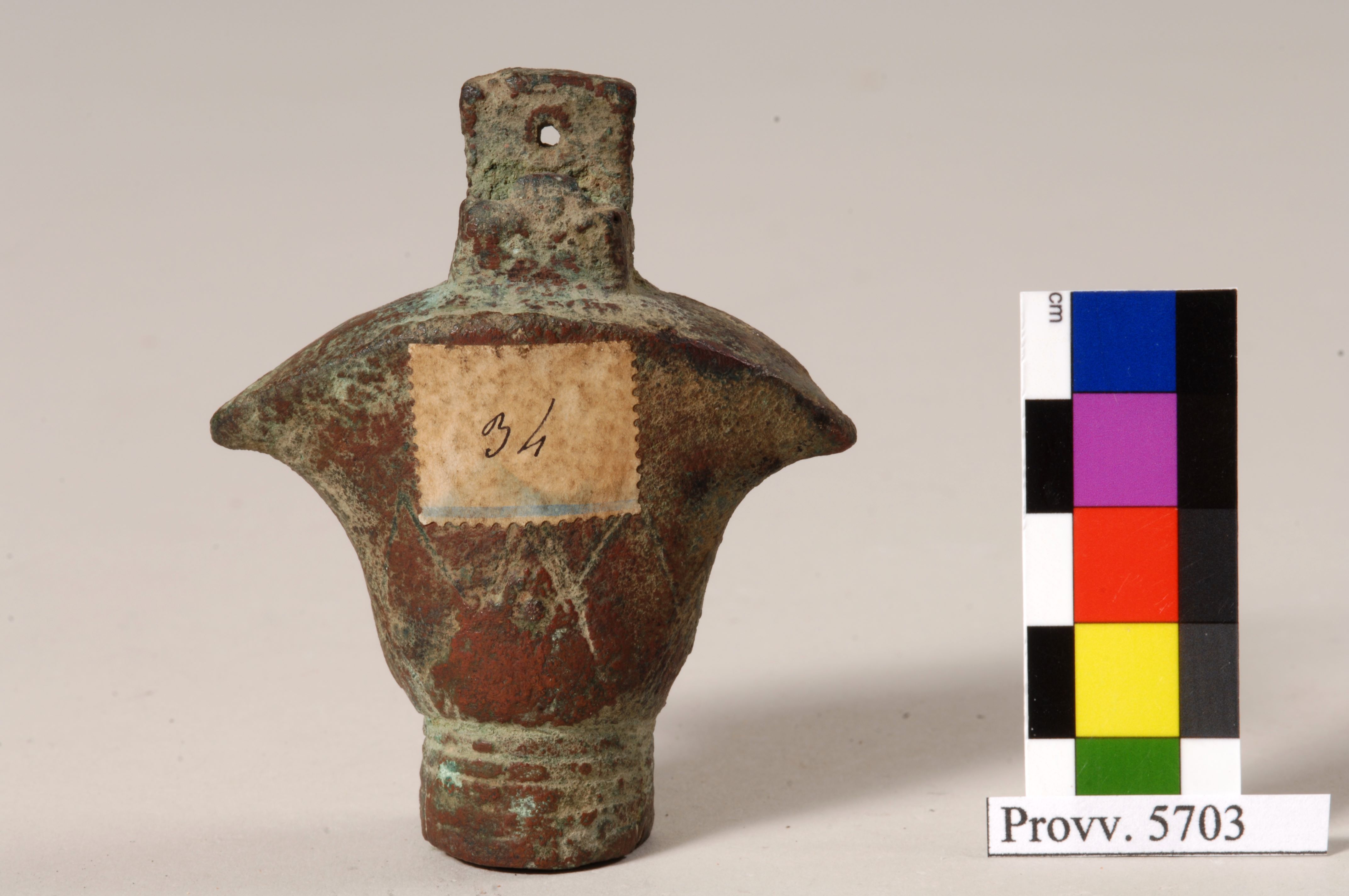 Part of a censer in the form of a papyrus flower. The fragment belongs to the distal part of the censer and is finely decorated to render the sepals. Two rectangular elements project from the top of the flower, one of which is broken, while the other has a hole, probably intended to receive the rivet used to attach the terminal part of the censer. Made in the lost-wax technique, the object is probably a hollow cast.