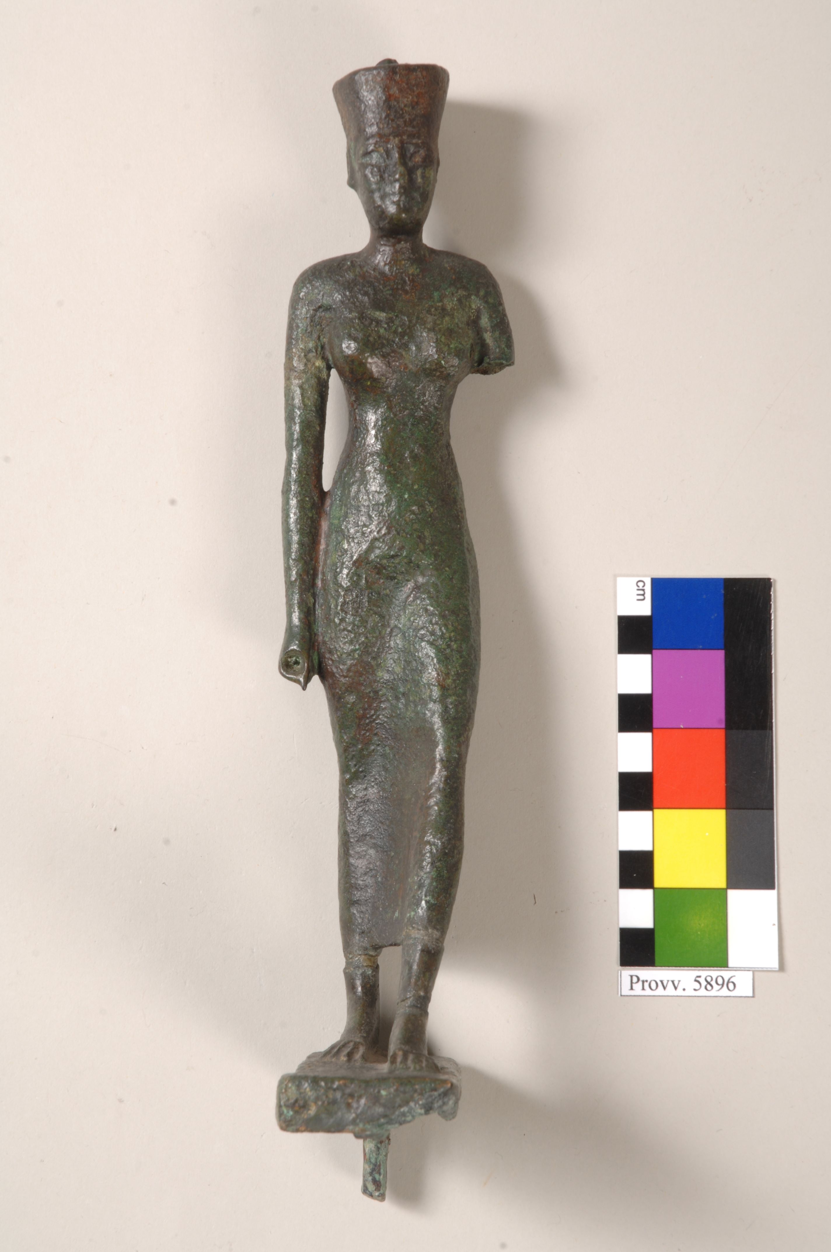 Standing figure of Neith, striding with left leg forward. The goddess is wearing the red crown. The crown has a hole for fitting the lituus, which is broken. The eyebrows and eyes of the goddess are recessed for the now-missing inlays. The goddess is wearing an ankle-length, tight-fitting dress. The right arm is at the side, the hand clenched in a fist has a hole for fitting a now-missing insignia. A fragment of it is still stuck in the hand. The left arm is broken. The statuette broke at the ankles, but it was repaired in modern times. The feet rest on a rectangular hollow base. Two rectangular tenons protrude from underneath the base, connected to the short sides. The object is made in the lost-wax technique for solid casts.