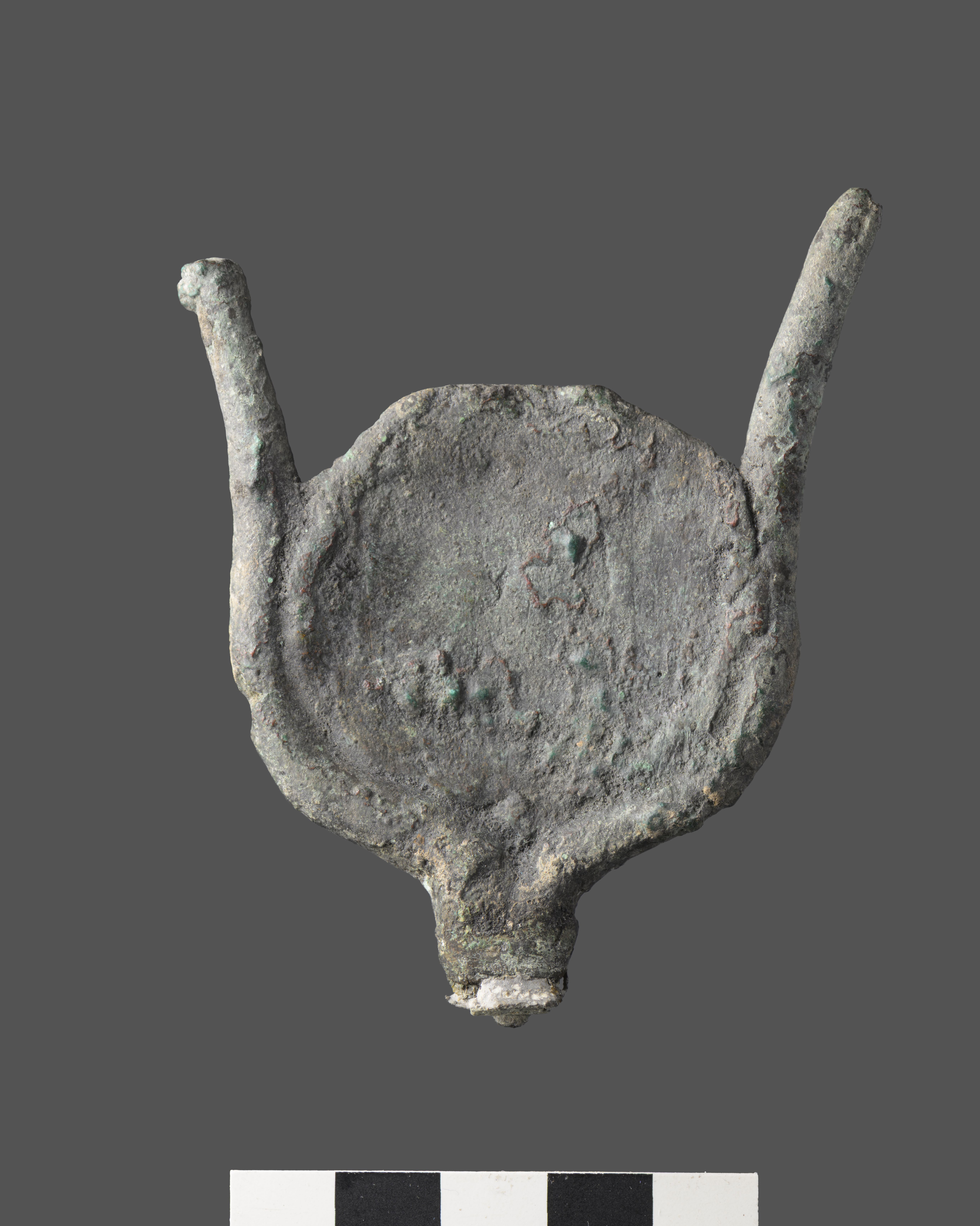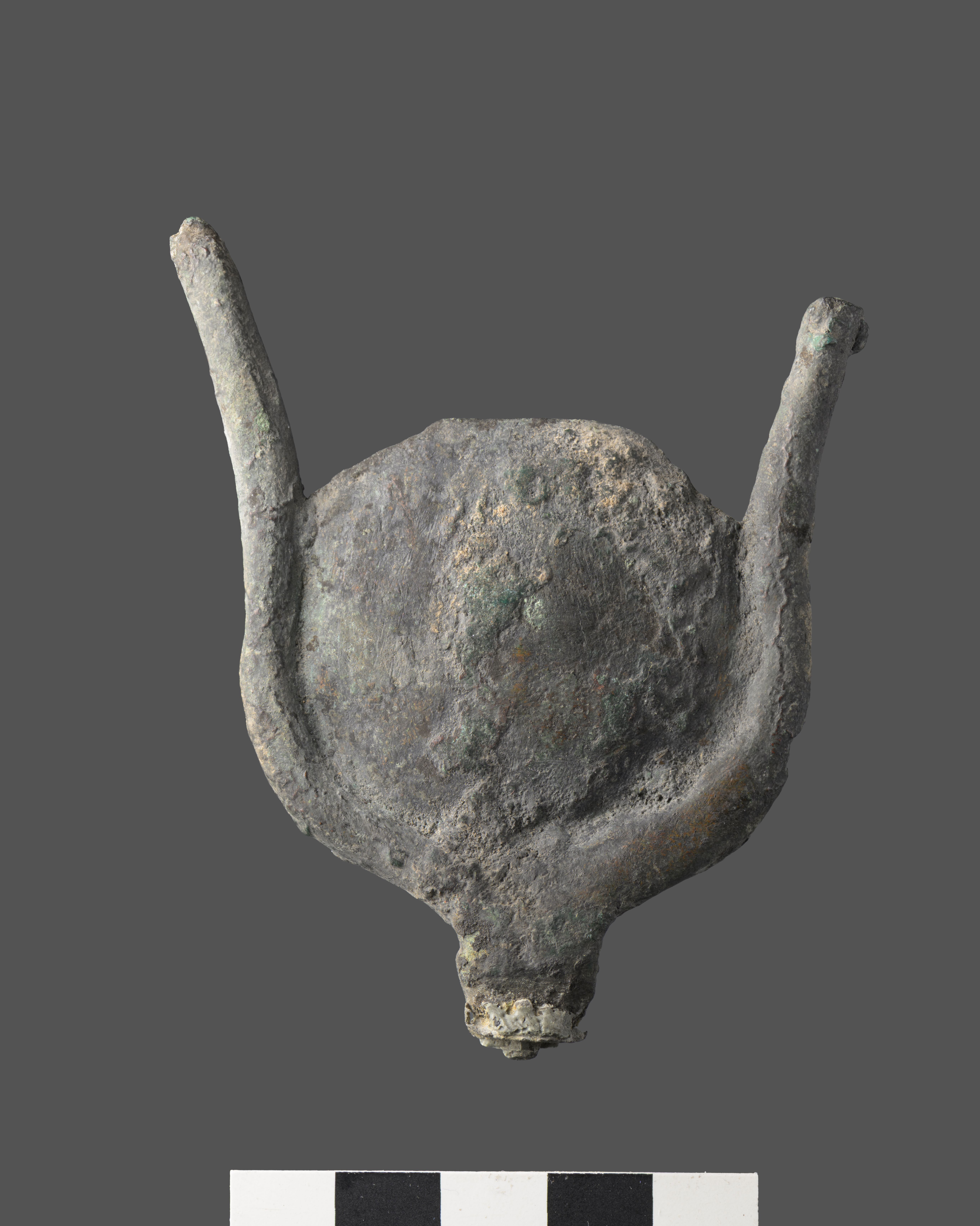 Hathoric crown, probably pertaining to a statuette of Isis. The crown terminates in a tenon which provided the interlocking element. The object is made in the lost-wax technique for solid casts.