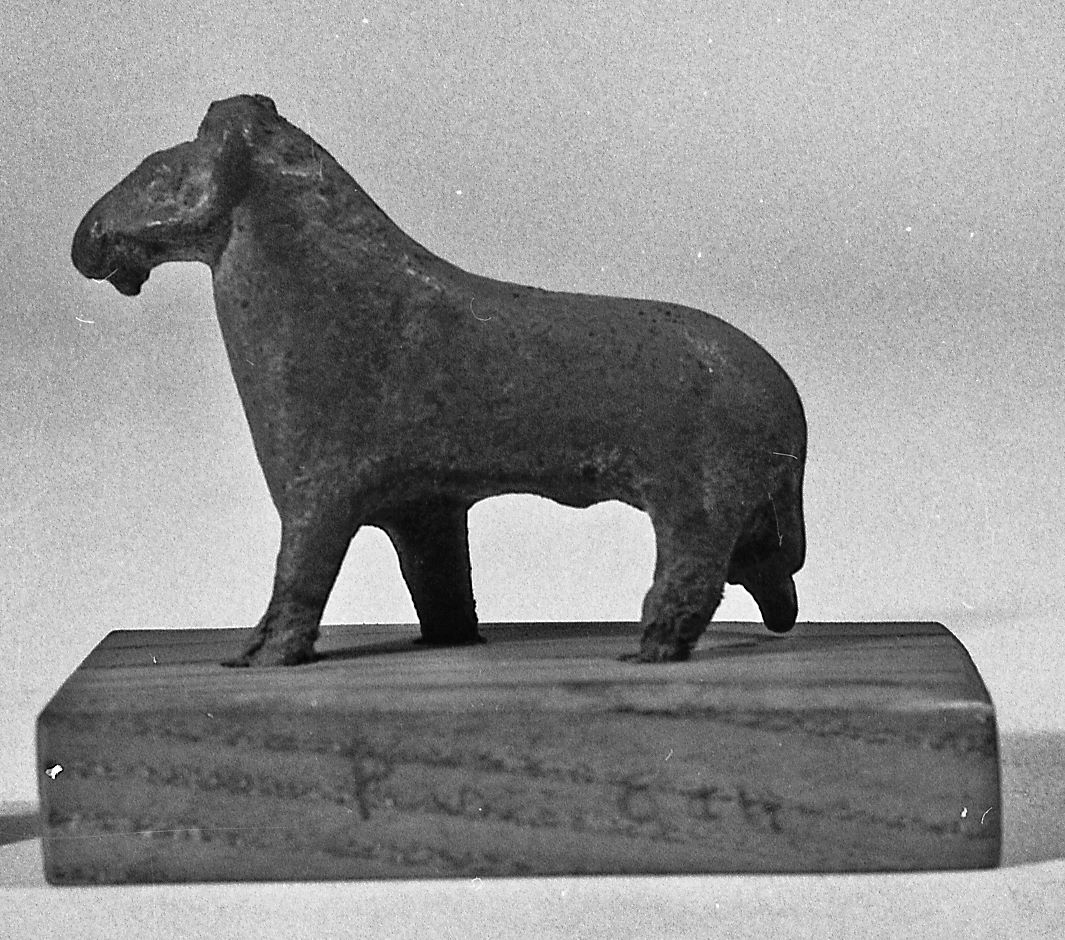 Standing figure of a ram, striding with the left legs forward. The headdress is broken. The horns are curved downwards and attached to the head. A small beard is present. The details of the fur are indicated by incised lines on the right side of the figure. The legs are broken. The tail is short. The object is made in the lost-wax technique for solid casts.