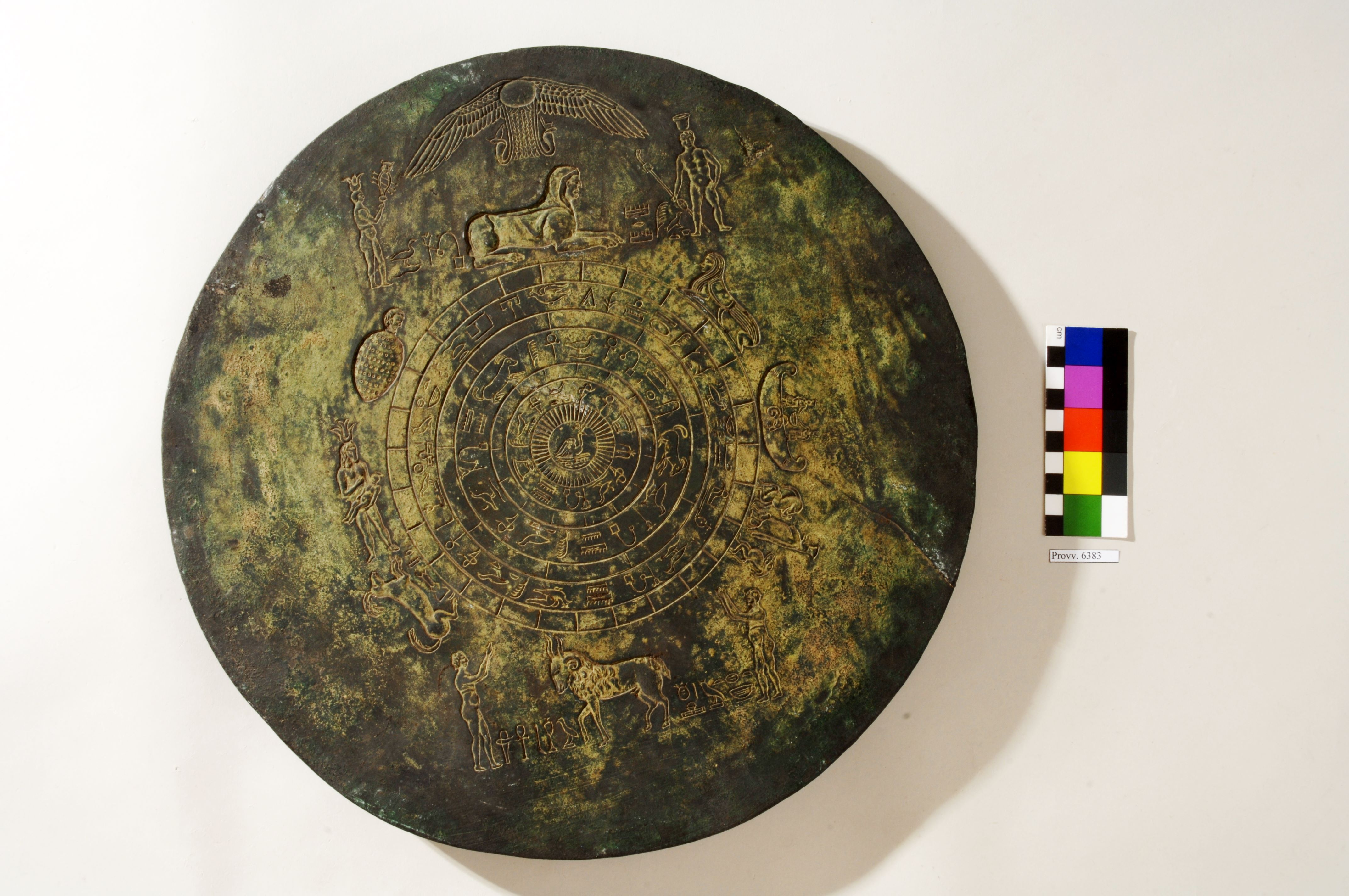 Large decorated bronze disc of modern manufacture. Many motifs and iconographies are misinterpreted. The representation of the boats closely recalls Provv. 8318 and Provv. 8319, as do the texts and the central figure holding a censer (or a similar object). On the reverse is a handwritten sticker reading “Collezione Sossio”. Both sides are decorated with concentric rings, alternating between rings divided into sections and rings bearing hieroglyphs. On one side, the outermost ring is divided into 27 sections, the third into 9, the fifth into 15, and the seventh is decorated with radiating lines; at the centre is depicted a bird with feathers on its head, perhaps identifiable as a peacock. On the outermost band, beyond the rings, are various motifs inspired by Egyptian art: at the top, a winged solar disc with rays and two uraei on either side, one with the red crown and one with the white crown; below, a human-headed sphinx flanked by decorative hieroglyphs and two muscular nude men: the man on the left faces frontally, carries a vessel on his head and holds a composite sceptre in his right hand; his right arm hangs straight down, his left arm runs along the body, slightly bent, with the hand resting on the thigh, and his legs are apart. The other man, shown in profile, has a prominent belly, holds in his right hand a sistrum surmounted by a Bes head, and has a lotus flower on his head. On the opposite side of the disc, the outer ring is divided into 12 sections; the third, fifth, and seventh into 30; the ninth is decorated with radiating lines; the remaining bands are adorned with hieroglyphs. At the centre a ram’s head is shown in profile. Outside the rings, as on the other side, various motifs are represented: for example, at the top, an Ouroboros with hieroglyphs inside and above it, flanked by two birds — on the left, a standing falcon, crowned with a solar disc and holding a sceptre between its wings; on the right, perhaps a squatting vulture wearing the double crown and likewise holding a sceptre. The object may be inspired by the Dendera Zodiac, echoing its circular form and the division into registers, and several zodiacal signs are present, such as Aries, Taurus, Gemini, Scorpio, and the constellation of Draco represented as the goddess Taweret.