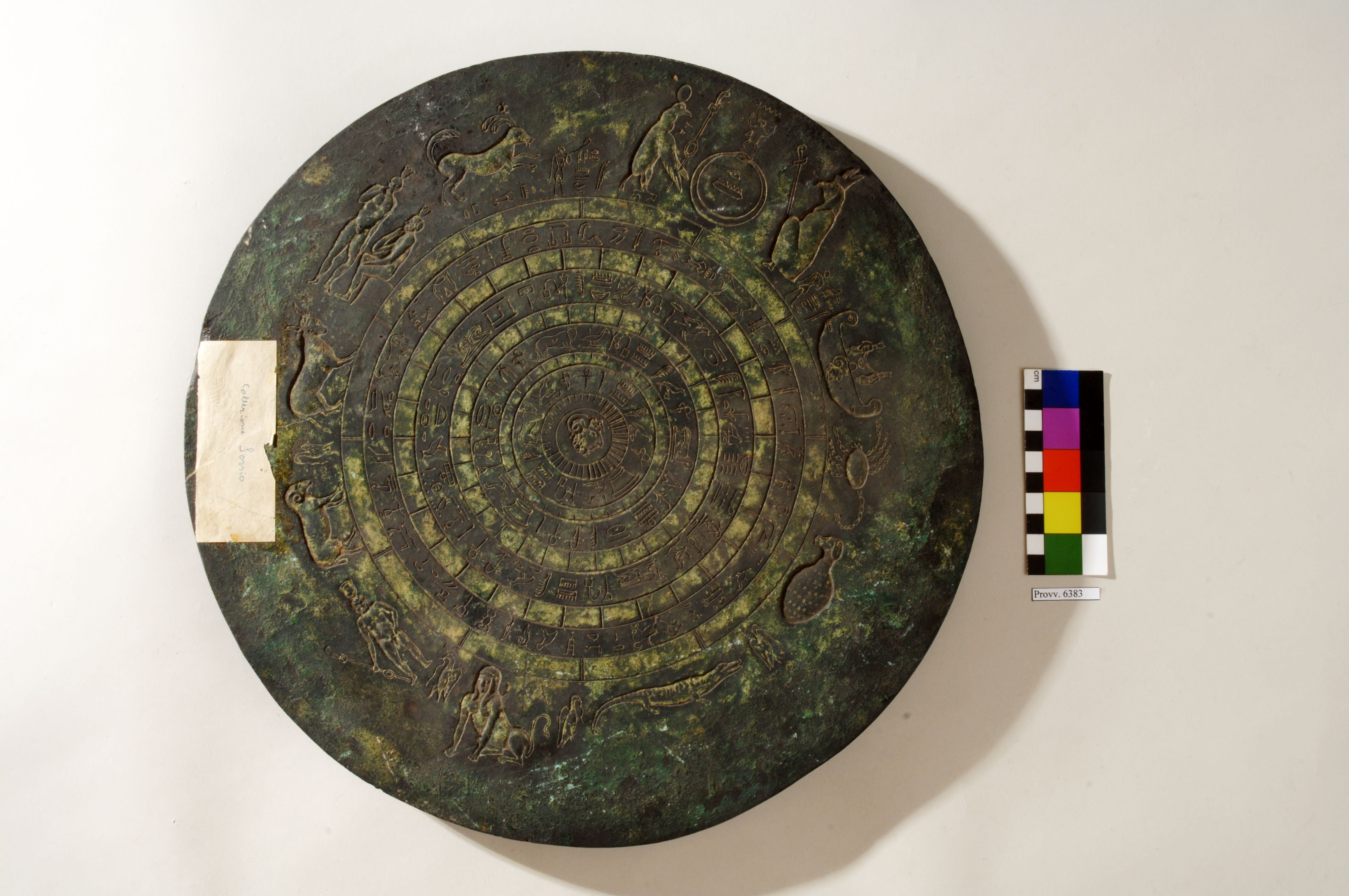 Large decorated bronze disc of modern manufacture. Many motifs and iconographies are misinterpreted. The representation of the boats closely recalls Provv. 8318 and Provv. 8319, as do the texts and the central figure holding a censer (or a similar object). On the reverse is a handwritten sticker reading “Collezione Sossio”. Both sides are decorated with concentric rings, alternating between rings divided into sections and rings bearing hieroglyphs. On one side, the outermost ring is divided into 27 sections, the third into 9, the fifth into 15, and the seventh is decorated with radiating lines; at the centre is depicted a bird with feathers on its head, perhaps identifiable as a peacock. On the outermost band, beyond the rings, are various motifs inspired by Egyptian art: at the top, a winged solar disc with rays and two uraei on either side, one with the red crown and one with the white crown; below, a human-headed sphinx flanked by decorative hieroglyphs and two muscular nude men: the man on the left faces frontally, carries a vessel on his head and holds a composite sceptre in his right hand; his right arm hangs straight down, his left arm runs along the body, slightly bent, with the hand resting on the thigh, and his legs are apart. The other man, shown in profile, has a prominent belly, holds in his right hand a sistrum surmounted by a Bes head, and has a lotus flower on his head. On the opposite side of the disc, the outer ring is divided into 12 sections; the third, fifth, and seventh into 30; the ninth is decorated with radiating lines; the remaining bands are adorned with hieroglyphs. At the centre a ram’s head is shown in profile. Outside the rings, as on the other side, various motifs are represented: for example, at the top, an Ouroboros with hieroglyphs inside and above it, flanked by two birds — on the left, a standing falcon, crowned with a solar disc and holding a sceptre between its wings; on the right, perhaps a squatting vulture wearing the double crown and likewise holding a sceptre. The object may be inspired by the Dendera Zodiac, echoing its circular form and the division into registers, and several zodiacal signs are present, such as Aries, Taurus, Gemini, Scorpio, and the constellation of Draco represented as the goddess Taweret.