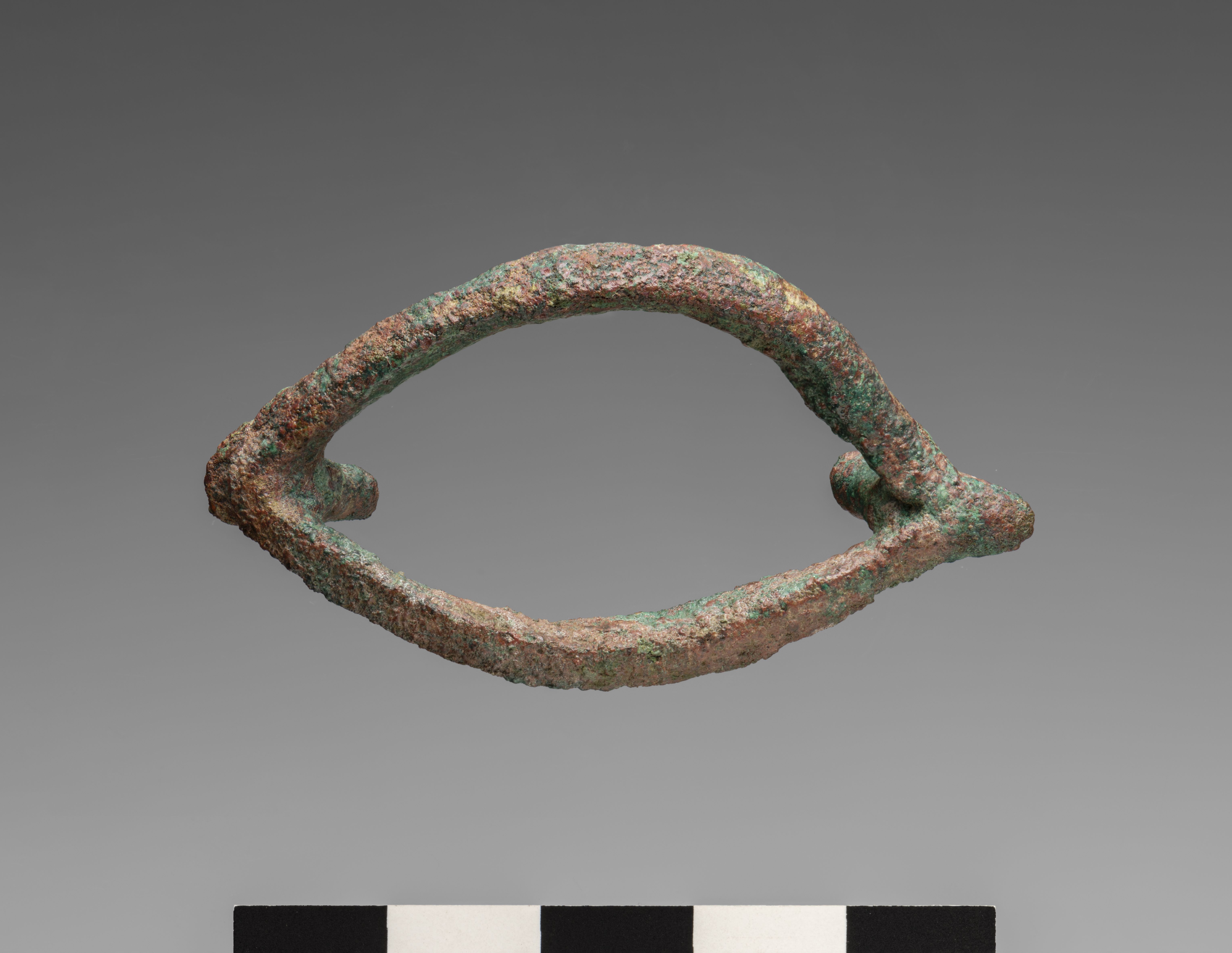 Inlay for the left eye of an anthropoid coffin or a statue. The eye is round in shape. From the two corners of the eye, two thin bronze elements, probably intended for fixing, project backwards. The object is made in the lost-wax technique for solid casts.