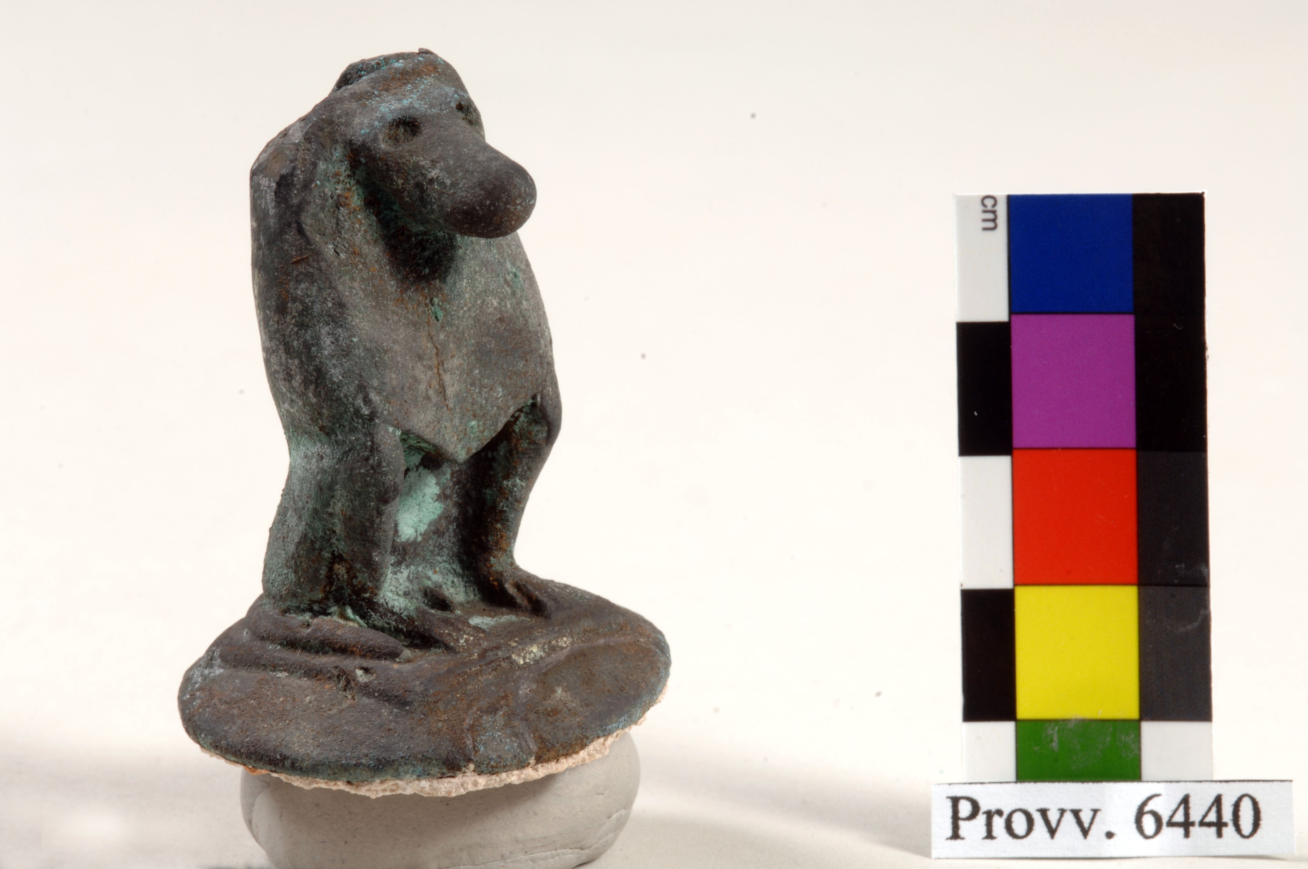 Figure of a squatting baboon resting on a dome-shaped base. The headdress is missing. The final part of the mantle forms a V on the front. The baboon is seated with the legs bent in front of him, the front paws placed on the knees. The tail is curled along the right side. The figure rests on a square base, which stands on a dome-shaped base. The base is filled with a white, inorganic material of modern origin, and a tenon protrudes from it. The tenon is square and looks bifurcated at the tip. The object is made in the lost-wax technique for solid casts.