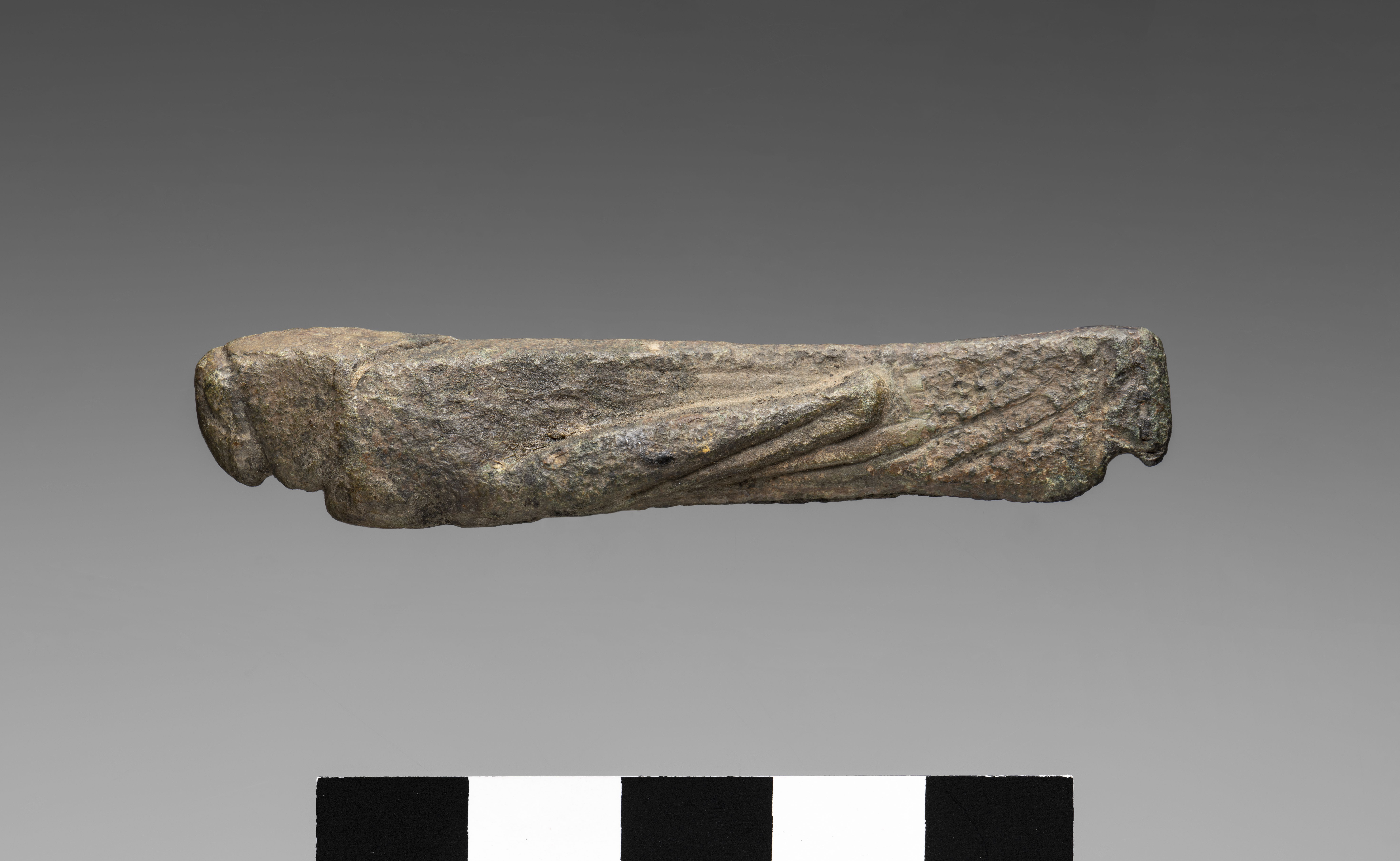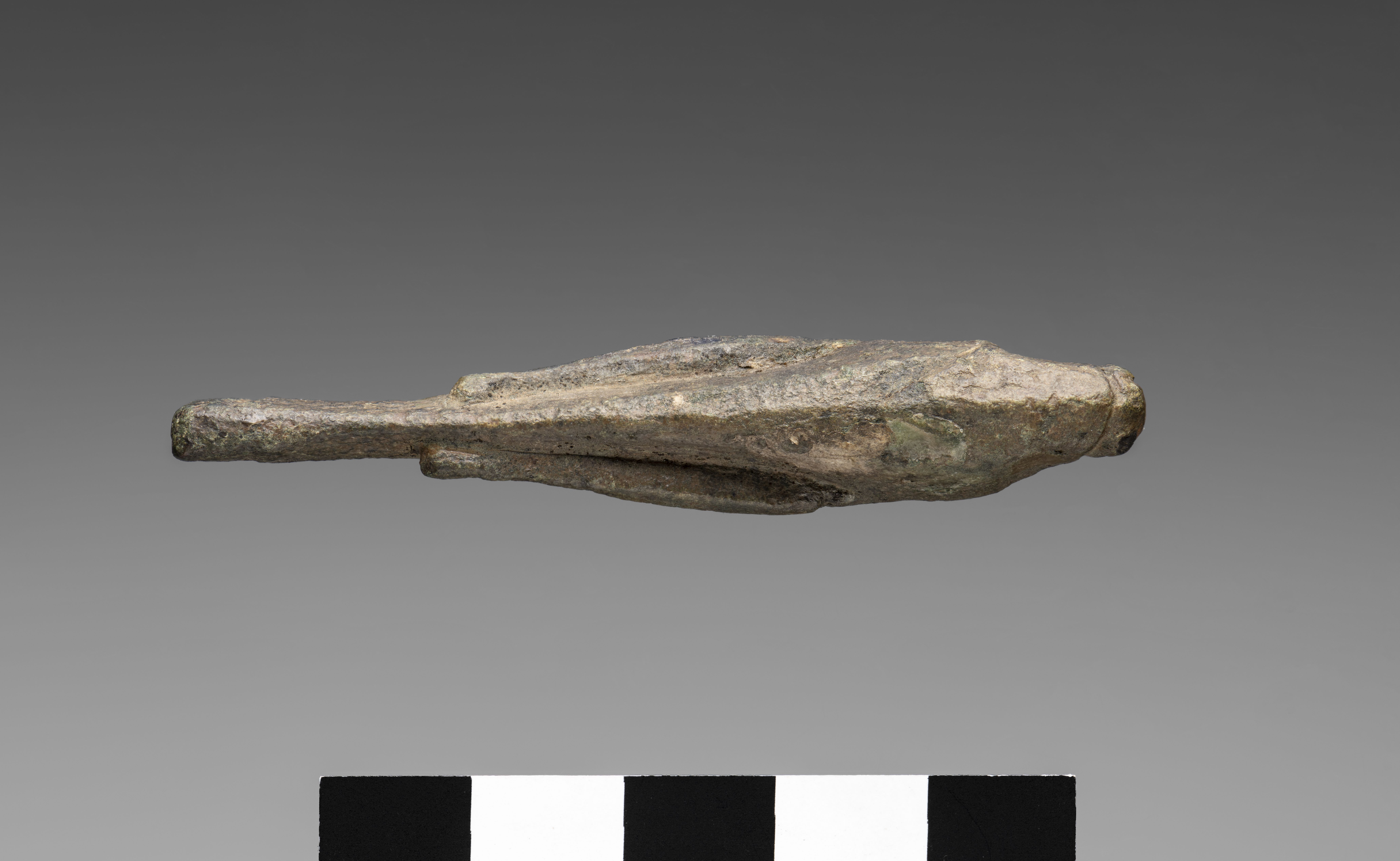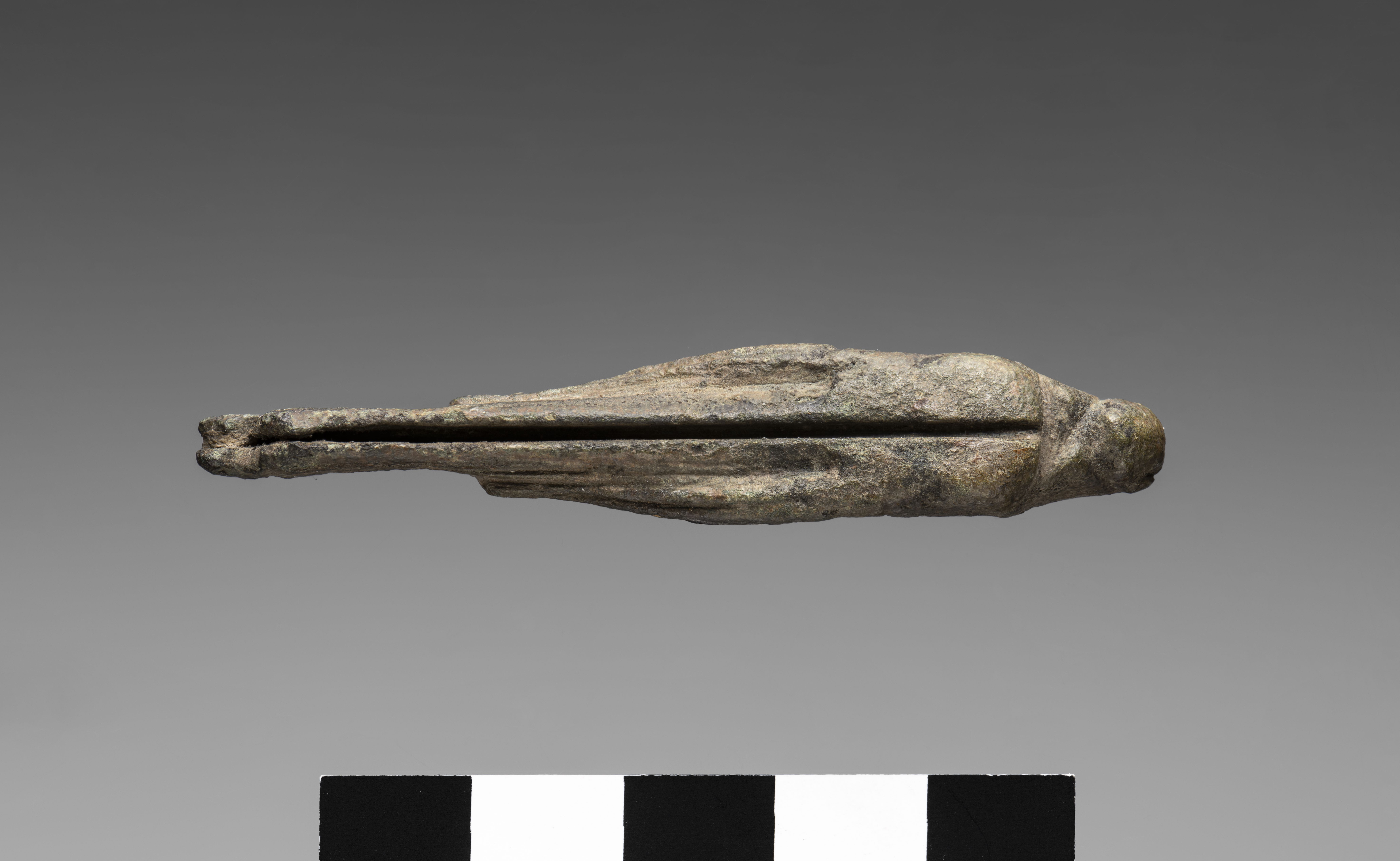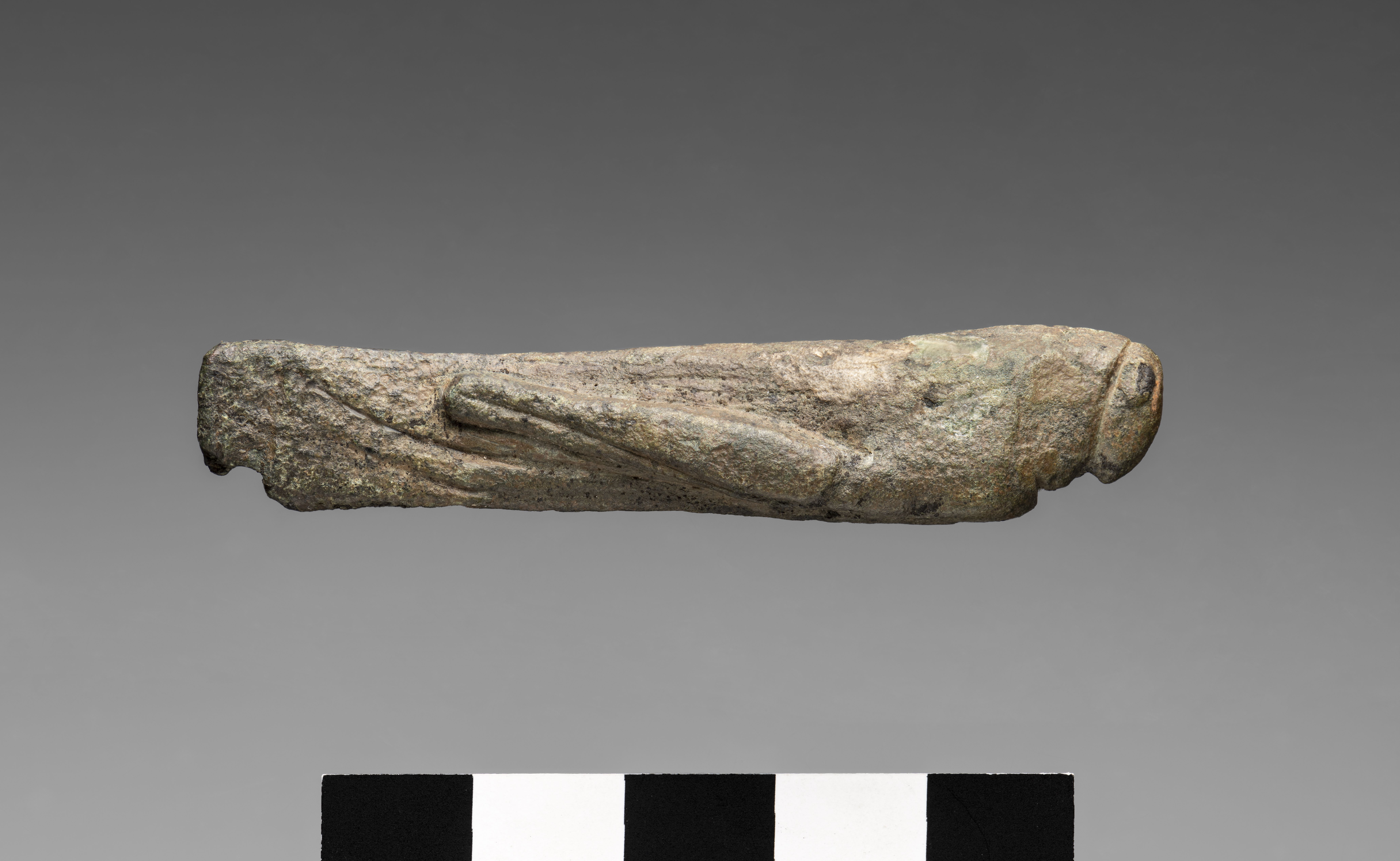 Figure of a locust. The head is oval, the eyes are visible, and the legs are folded against the body. Two incised, curved lines run towards the tail. Under the figure, there is a thin groove measuring 5 cm, which runs almost all the way through it, except for the head. The object is made in the lost-wax technique for solid casts.