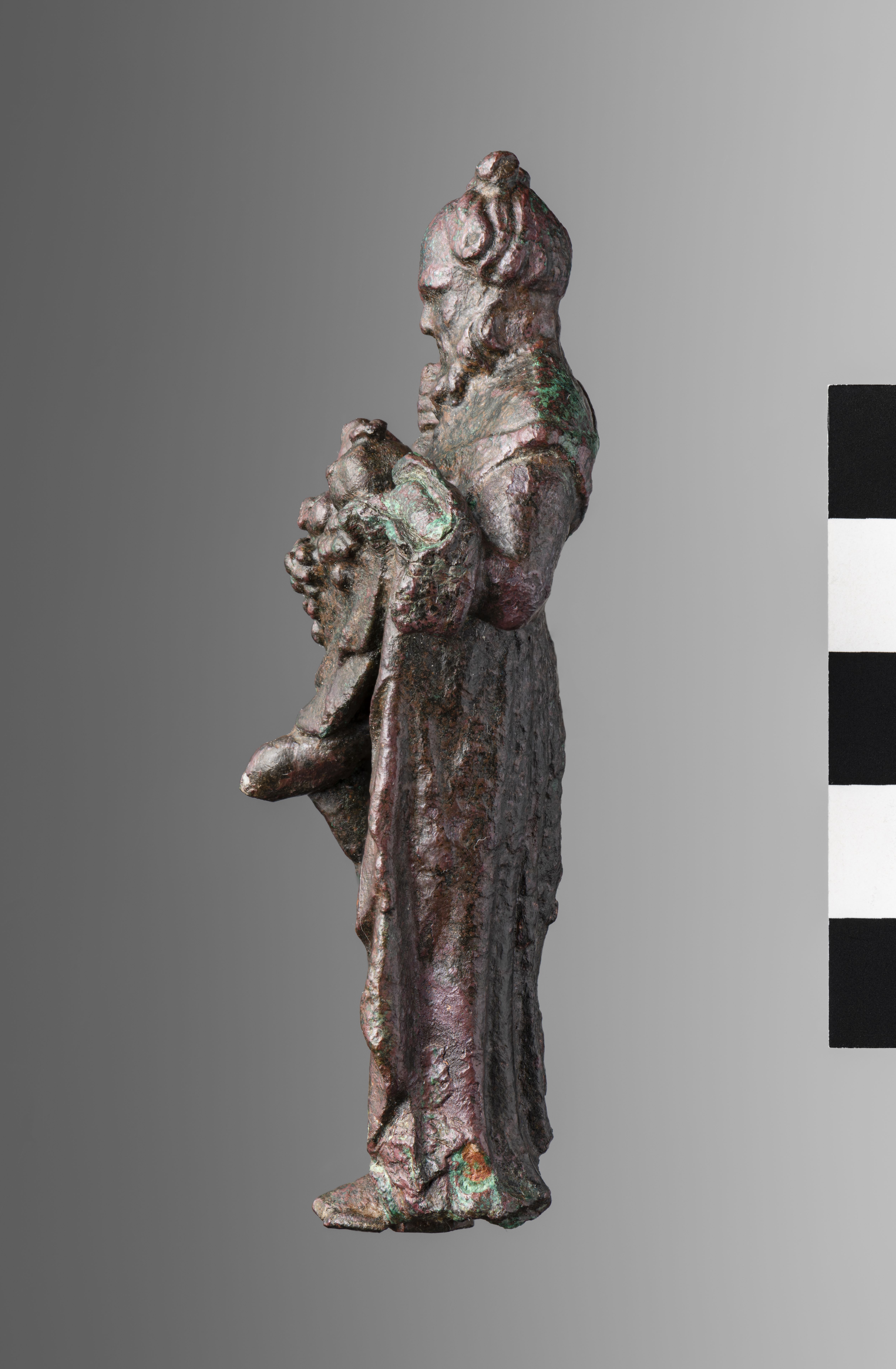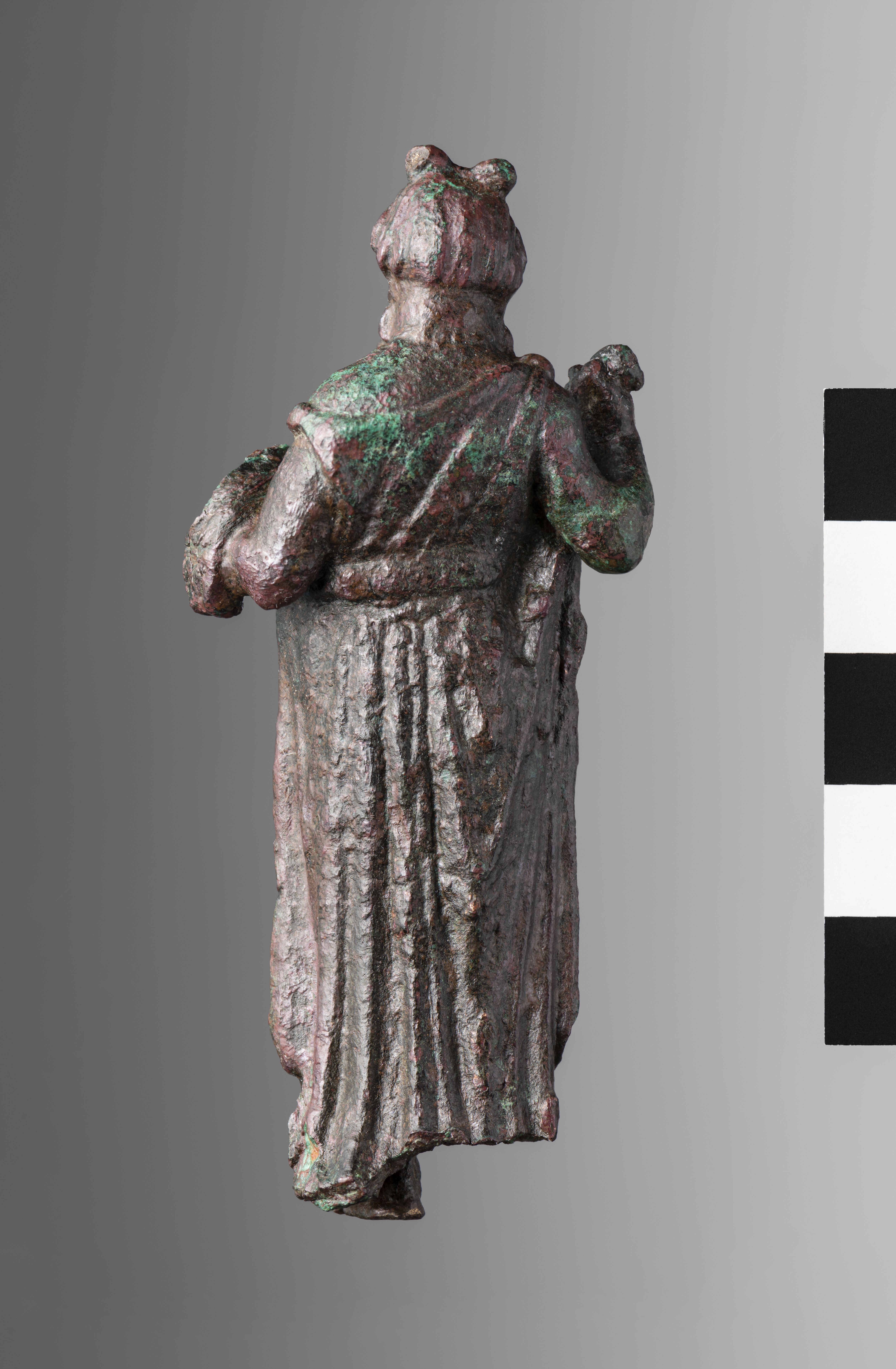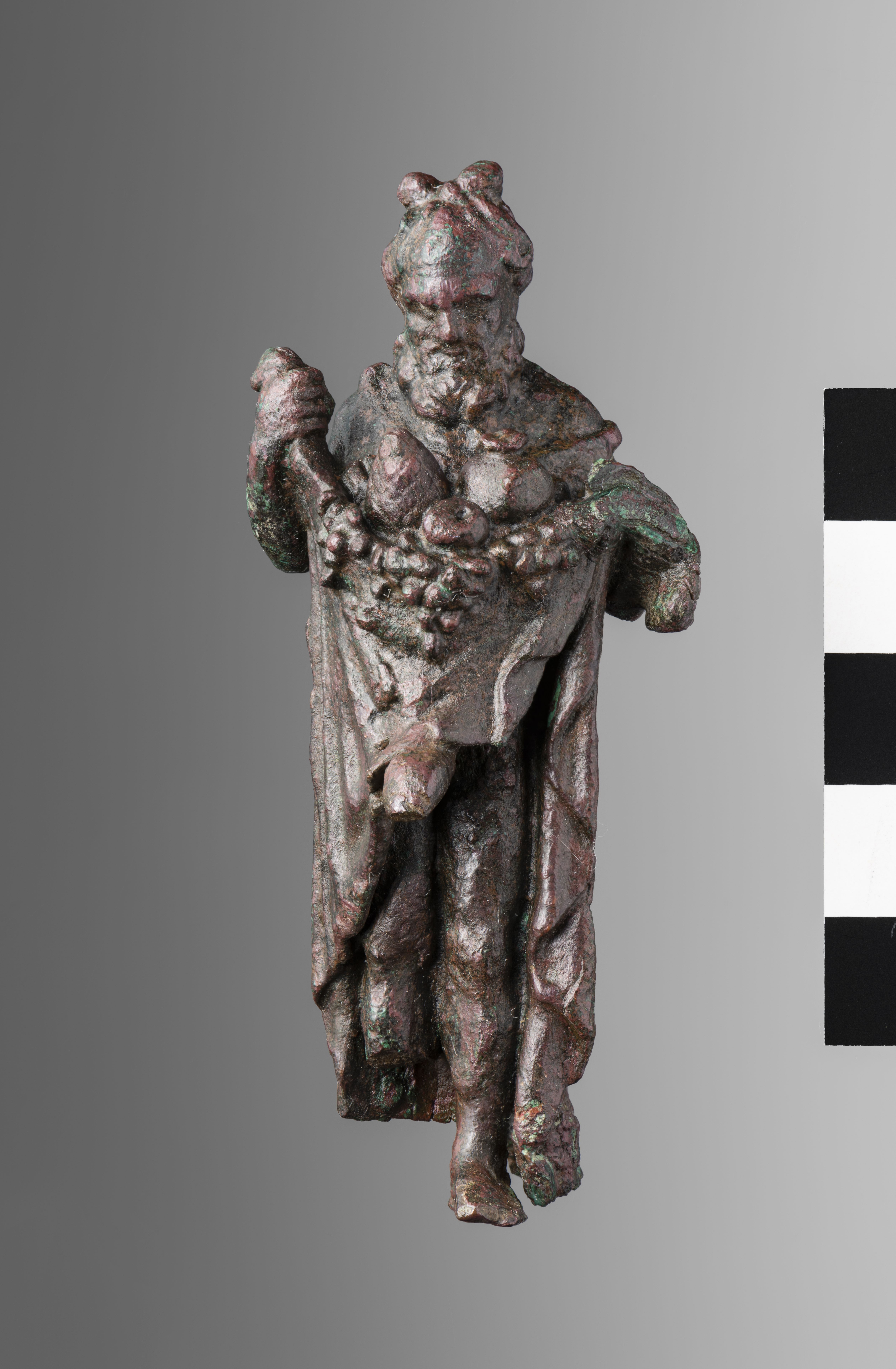 Standing figure of Priapus. The god is depicted with two small Silenus horns, his hairline is receding, and he has a long curly beard. The god wears a long, draped robe that he holds up at the front, showing the phallus. In the robe he carries fruits including grapes, a pomegranate and two other fruits. The object is made in the lost-wax technique for solid casts.