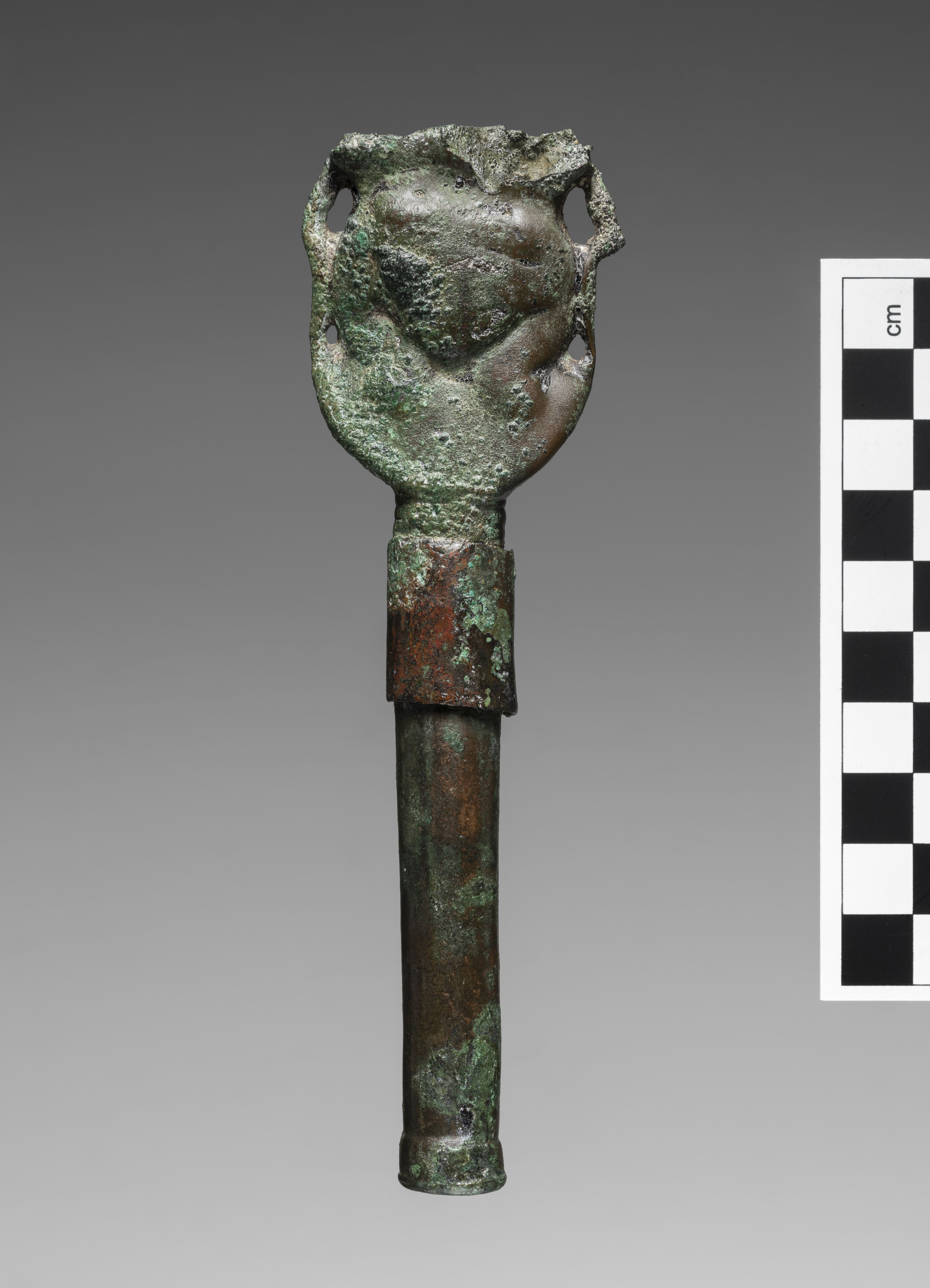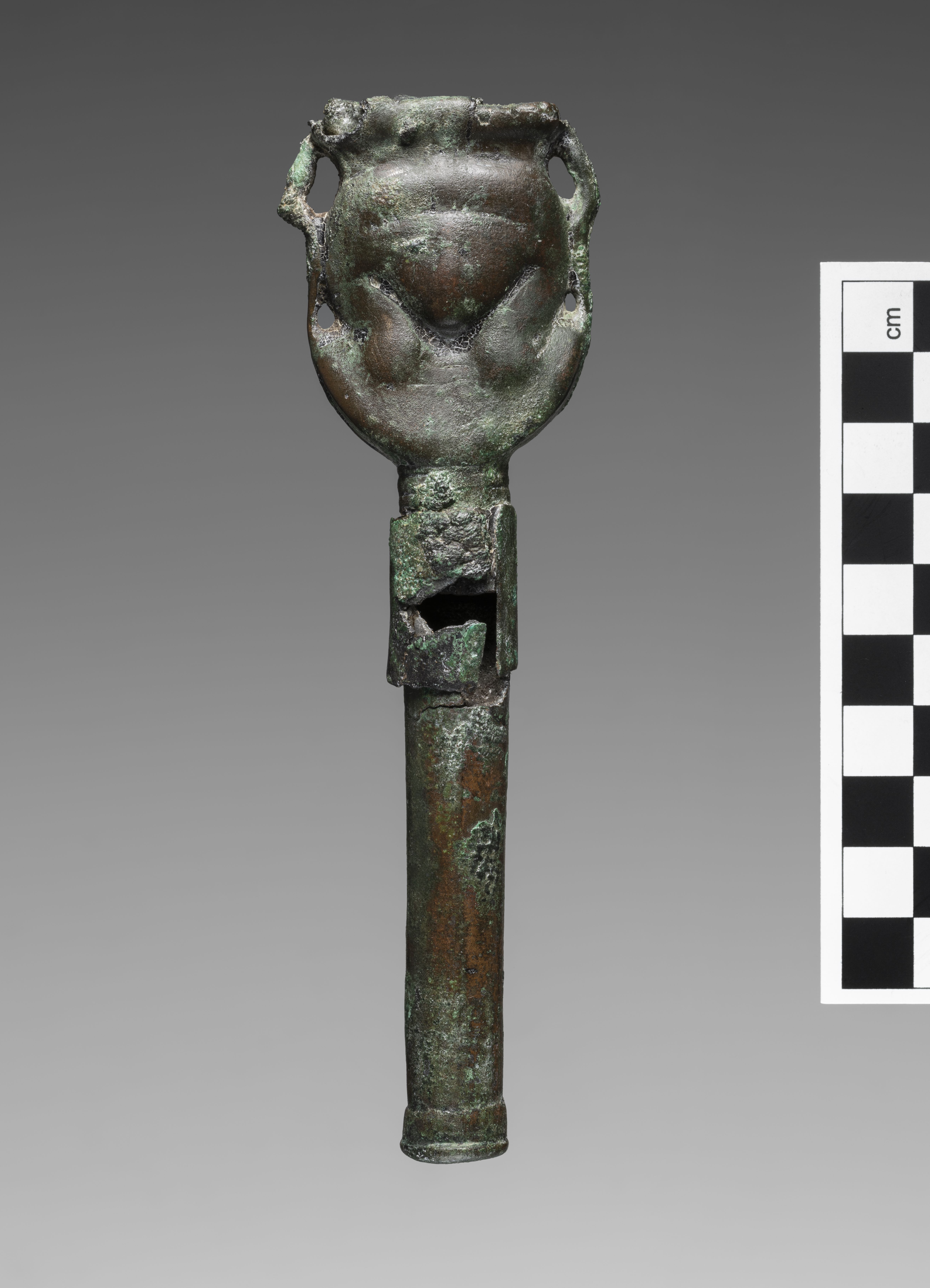 Arched sistrum handle. Hathoric protomes are present on both sides of the object, each crowned by a bell-shaped capital. The protomes wear wigs ending in two curls; the triangular faces show no visible details and appear worn. Below each protome is a plain collar, while on either side two uraei, bearing the white crown, connect the collar, protome, and capital. bands. The smooth handle terminates in a button. The upper part of the handle is broken and has been repaired using the cast-on technique, through the addition of a bronze collar. Possible impressions from fabric are visible on the handle. The object is made in the lost-wax technique for hollow casts.