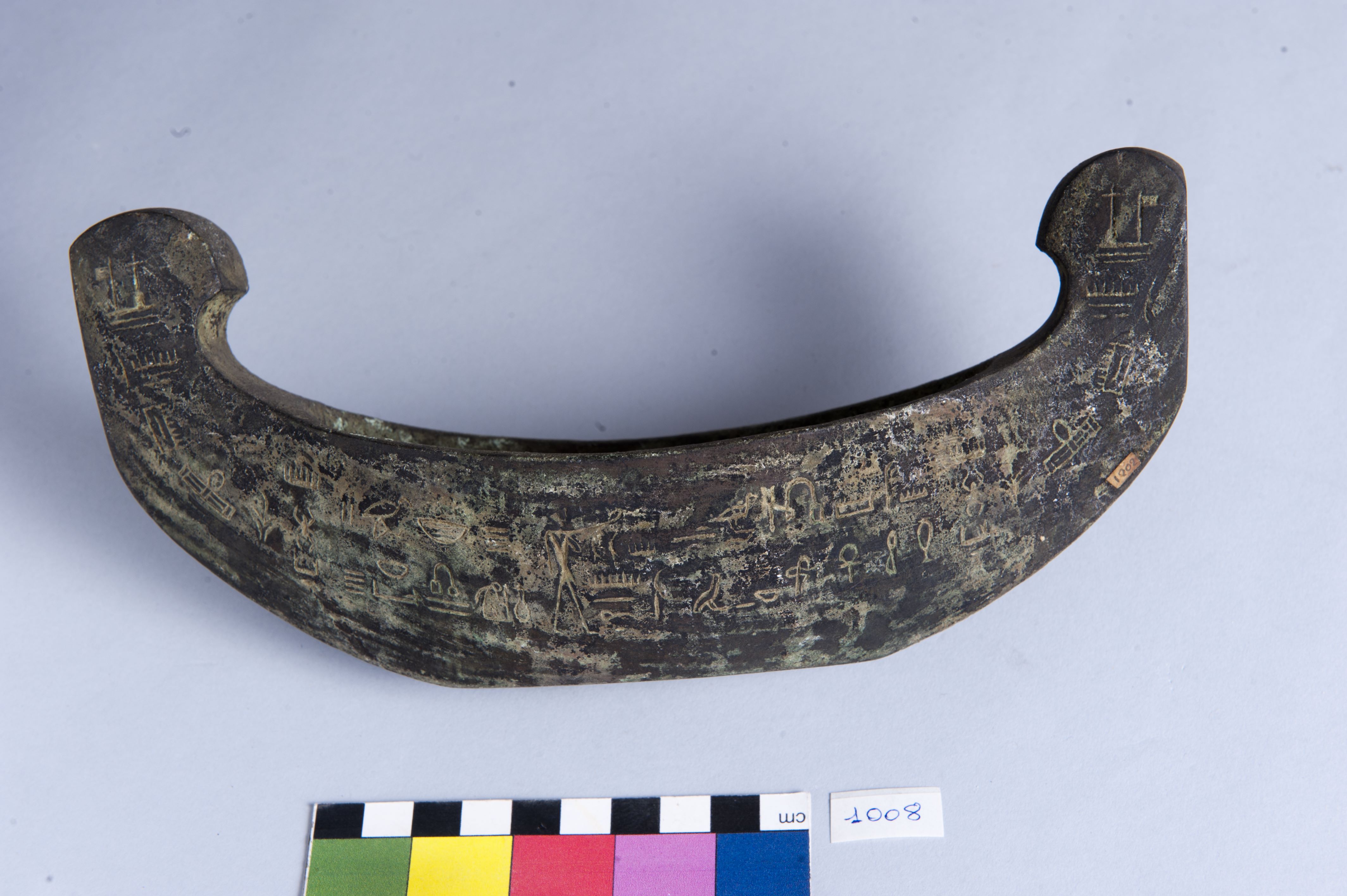 Model of a boat, probably of modern manufacture. The sides are decorated with ornamental hieroglyphs, identical on both sides. At the prow and stern appear, respectively, a ram’s head above the sign mn and other unidentifiable elements, and on the opposite end, a squatting child seated on a lotus flower. The bottom is flat and the interior hollow. On one side, at the centre, there is a small male figure with the left arm raised and the left leg advanced. The object closely resembles Provv. 8319, and the inscriptions on both pieces are similar to those on Provv. 6383. The object is made in the lost-wax technique for solid casts.