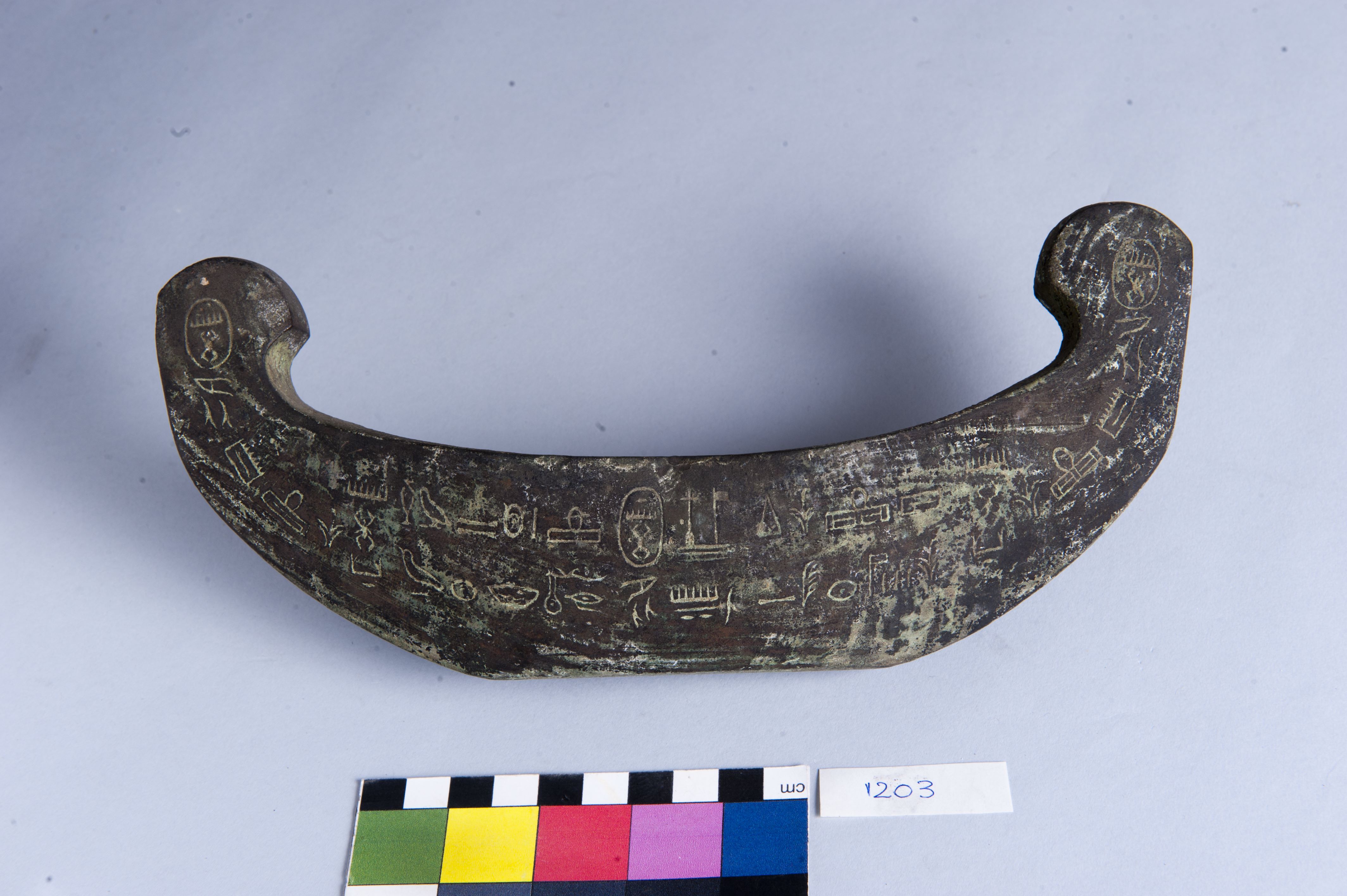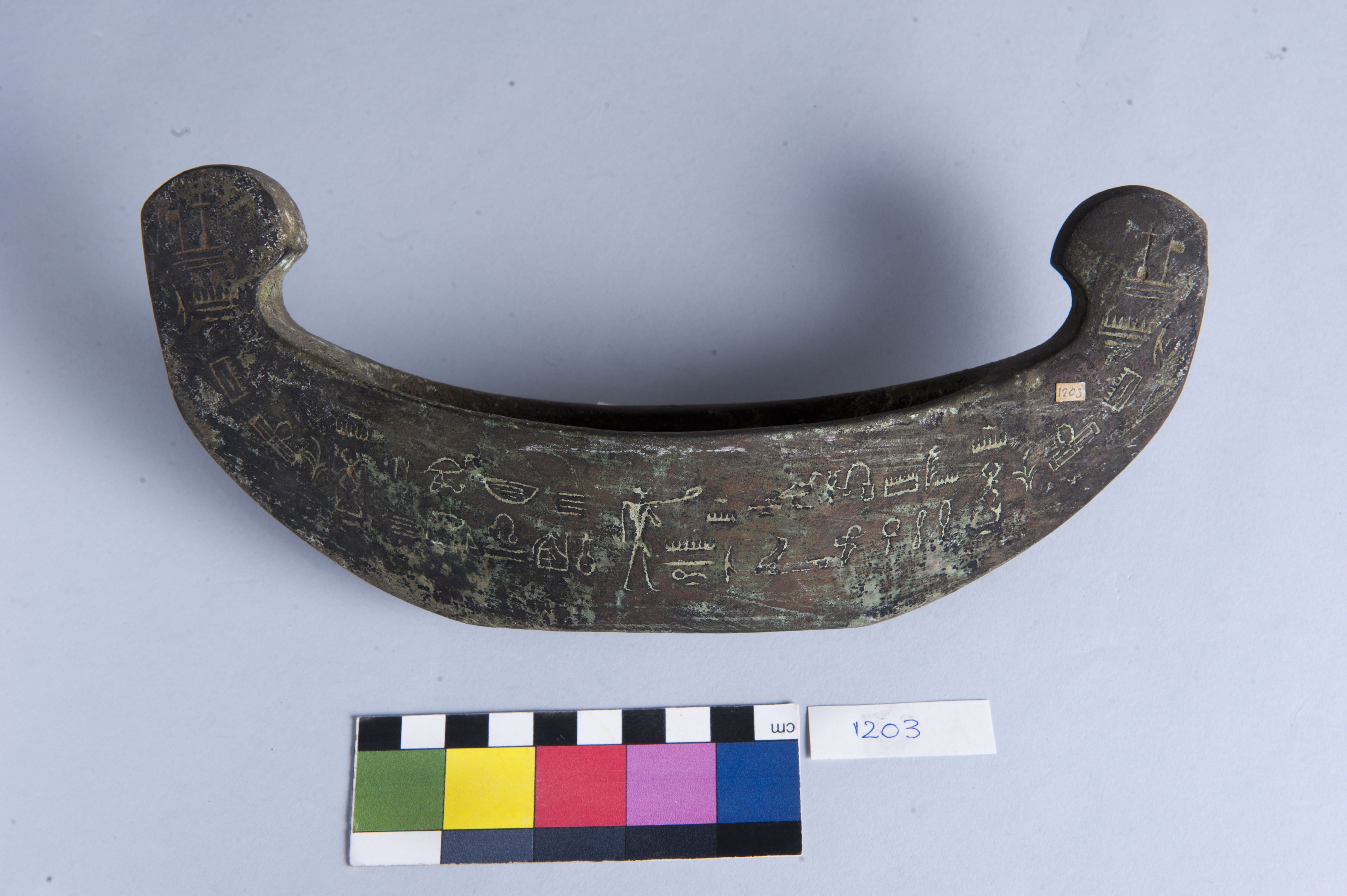 Model of a boat of modern manufacture. The sides are decorated with ornamental hieroglyphs, identical on both sides. At the prow and stern appear, respectively, a ram’s head above the sign mn and other unidentifiable elements, and on the opposite end, a squatting child seated on a lotus flower. The bottom is flat and the interior hollow. On one side, at the centre, there is a small male figure with the left arm raised and the left leg advanced. The object is very similar to Provv. 8319, and the inscriptions on both pieces resemble those on Provv. 6383. The object is made in the lost-wax technique for solid casts.