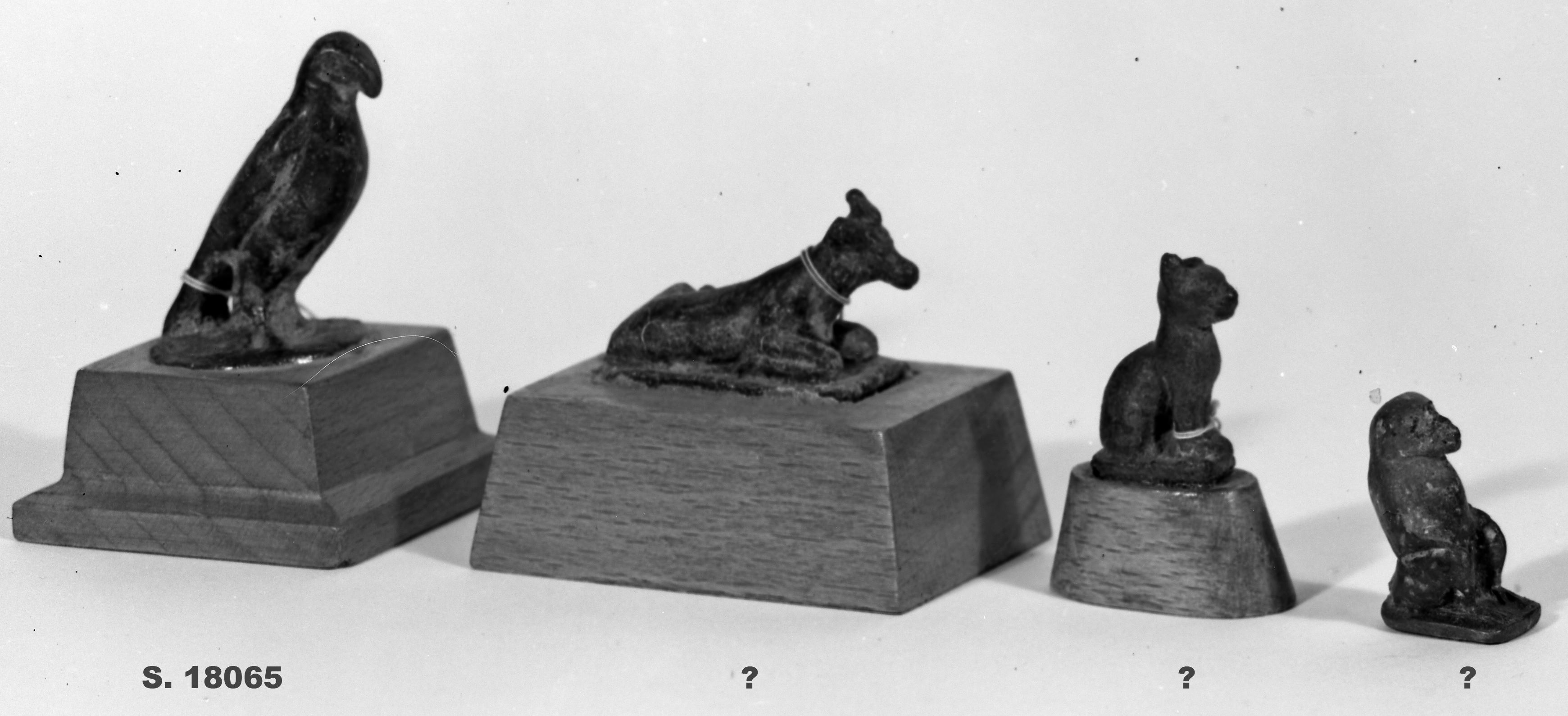 Falcon figure. The head is small, the beak long and curved downwards. The body is rounded and tapering towards the tail, the figure is overall elongated. The wings are tightly folded to the body and the tail is slightly fanned. The legs are joined. The legs and tail rest on a circular base. The figure is mounted on a modern wooden base. The object is made in the lost-wax technique for solid casts.