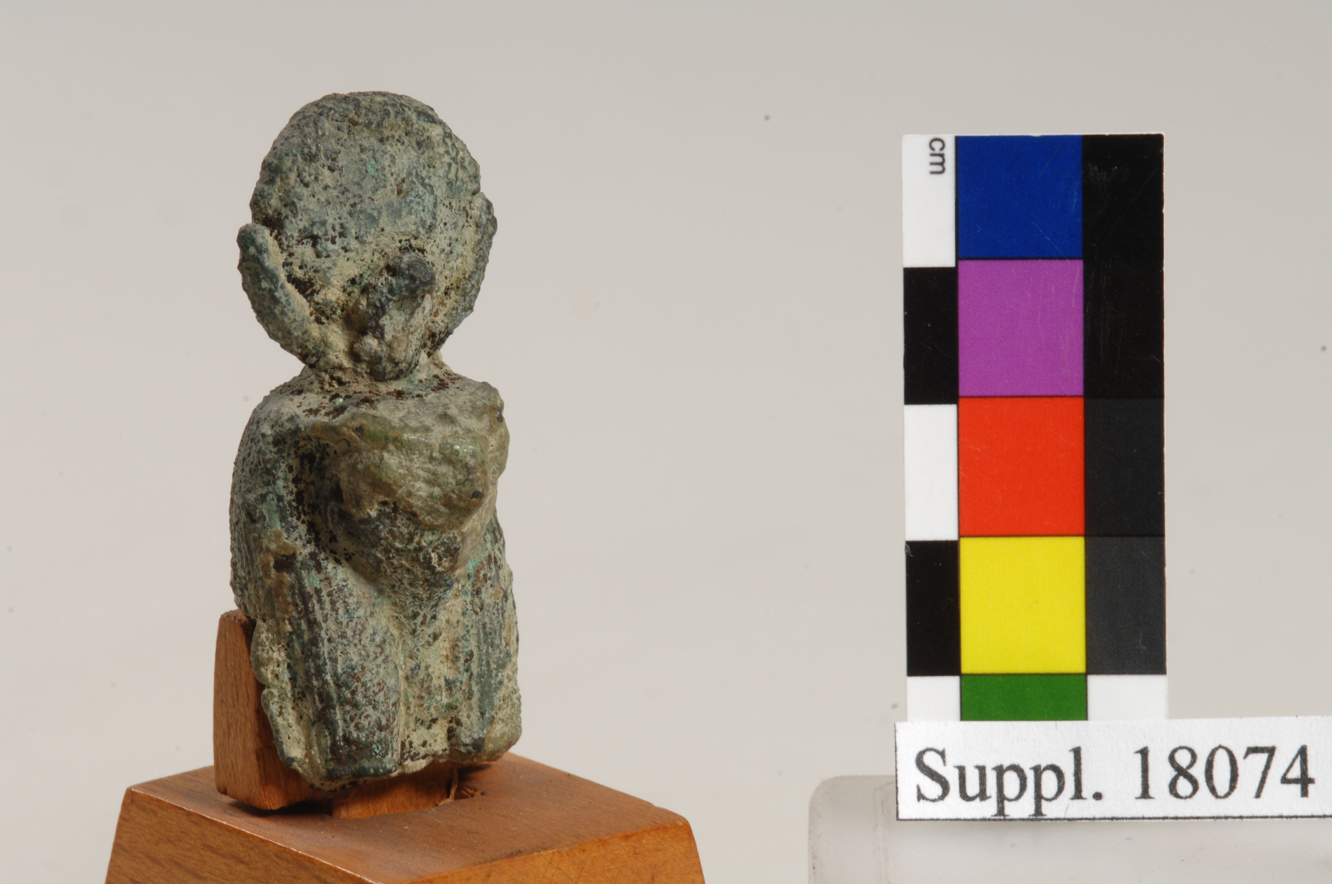 Head of a falcon-headed god, identifiable with Khonsu, probably part of an aegis. The god wears a headdress consisting of a lunar disc with the crescent moon decorated with the uraeus. The god wears a tripartite wig. The head is hollow, and, on the inside, there is a yellowish-white material, probably plaster. The edges of the wig show a flat surface that broke off, probably identifiable as a wesekh-collar. The object is made in the lost-wax technique for hollow casts.