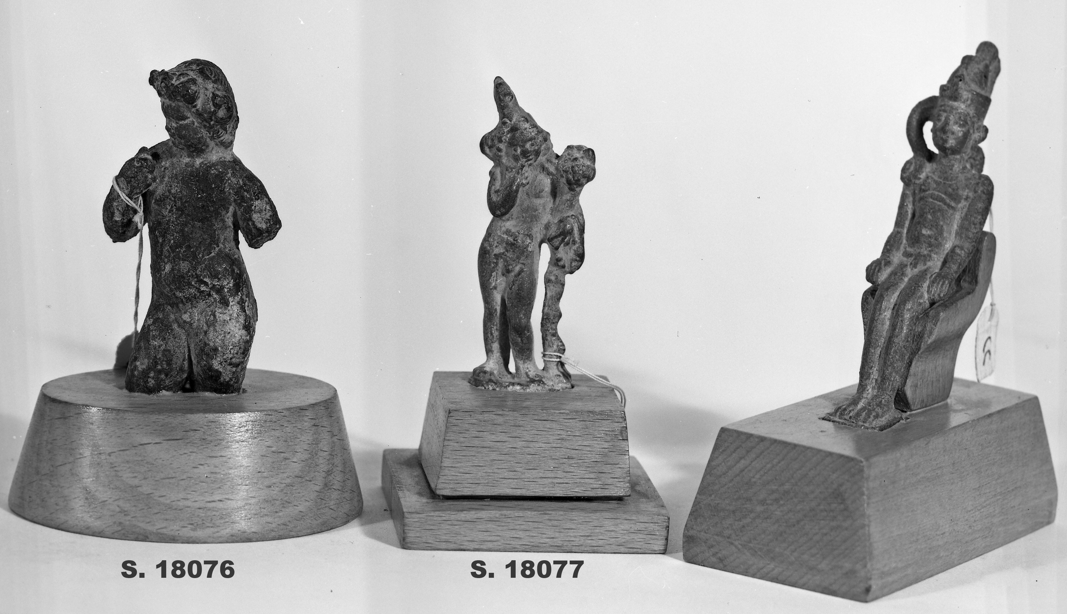 Figure of Harpocrates, depicted in Hellenistic manner, depicted as a nude and standing child. He has curly hair framing his face and a pointed cap engraved at the back of his head. His face is plump, and the features are barely visible due to corrosion. The figure is overall chubby, with a dynamic pose that forms a sort of S shape, the head turned to the right along with the torso. Harpocrates is bringing his now-missing right index finger to his mouth. The left arm is missing. The lower part of the legs is missing. The figure is mounted on a modern wooden base. The object is made in the lost-wax technique for solid casts.