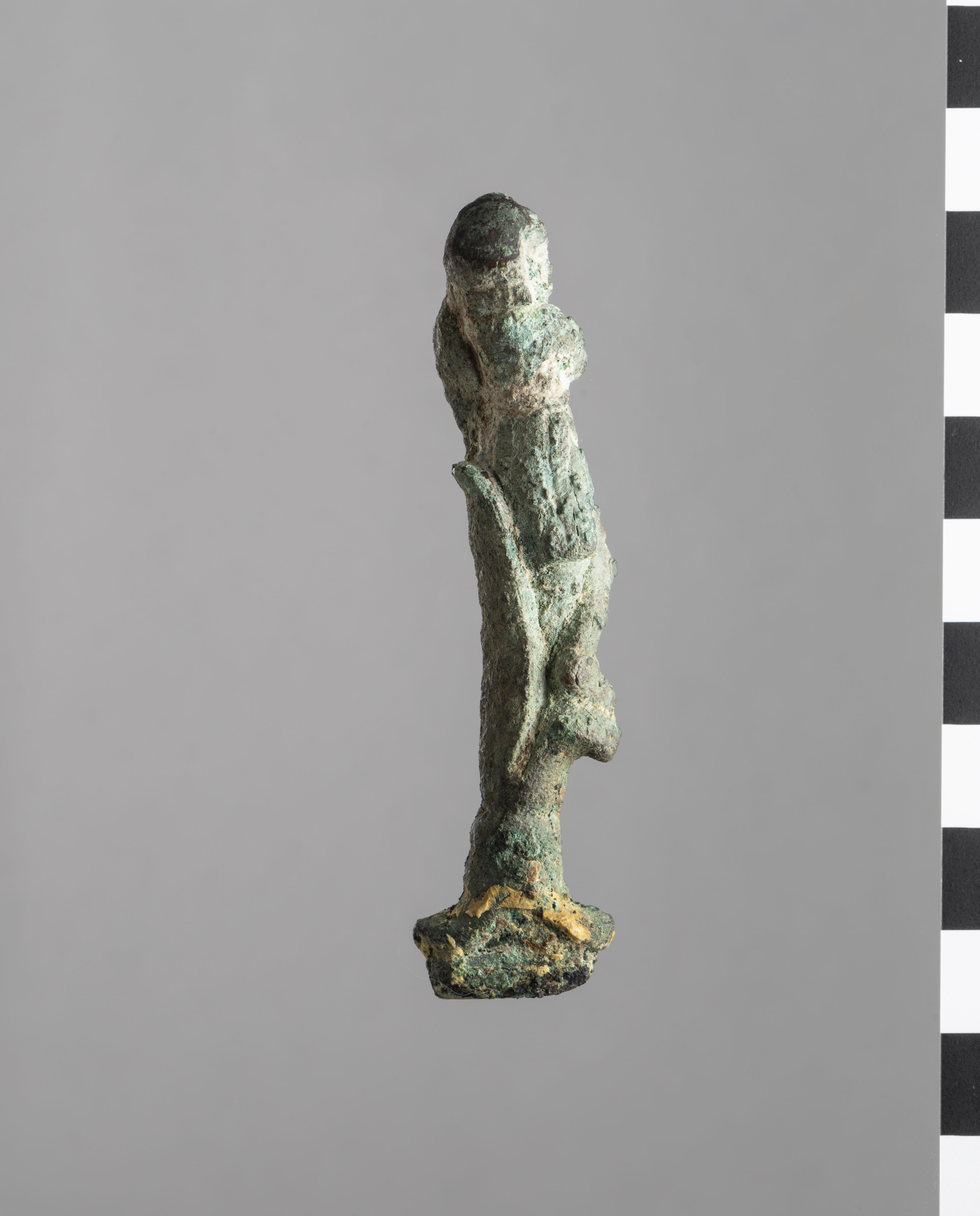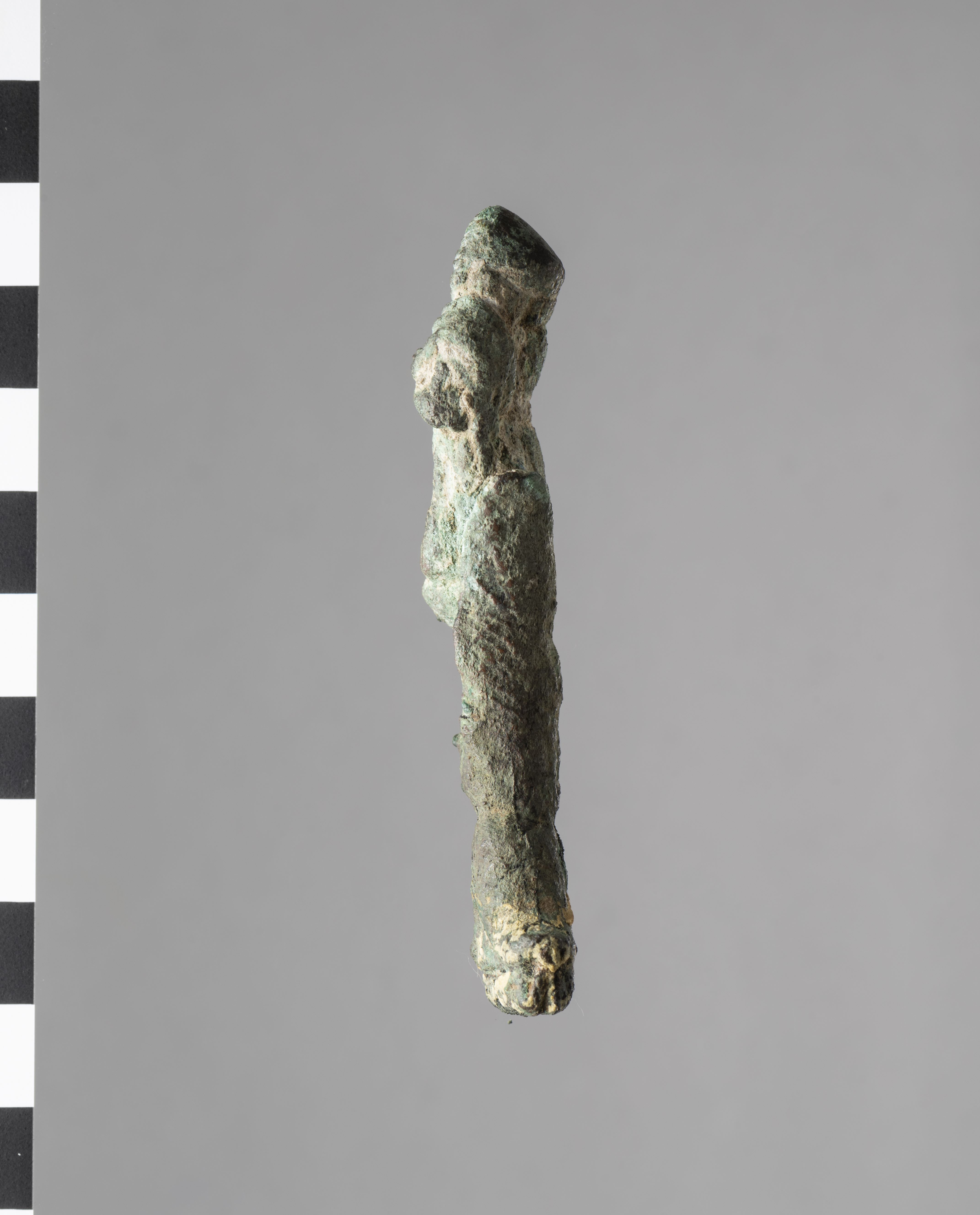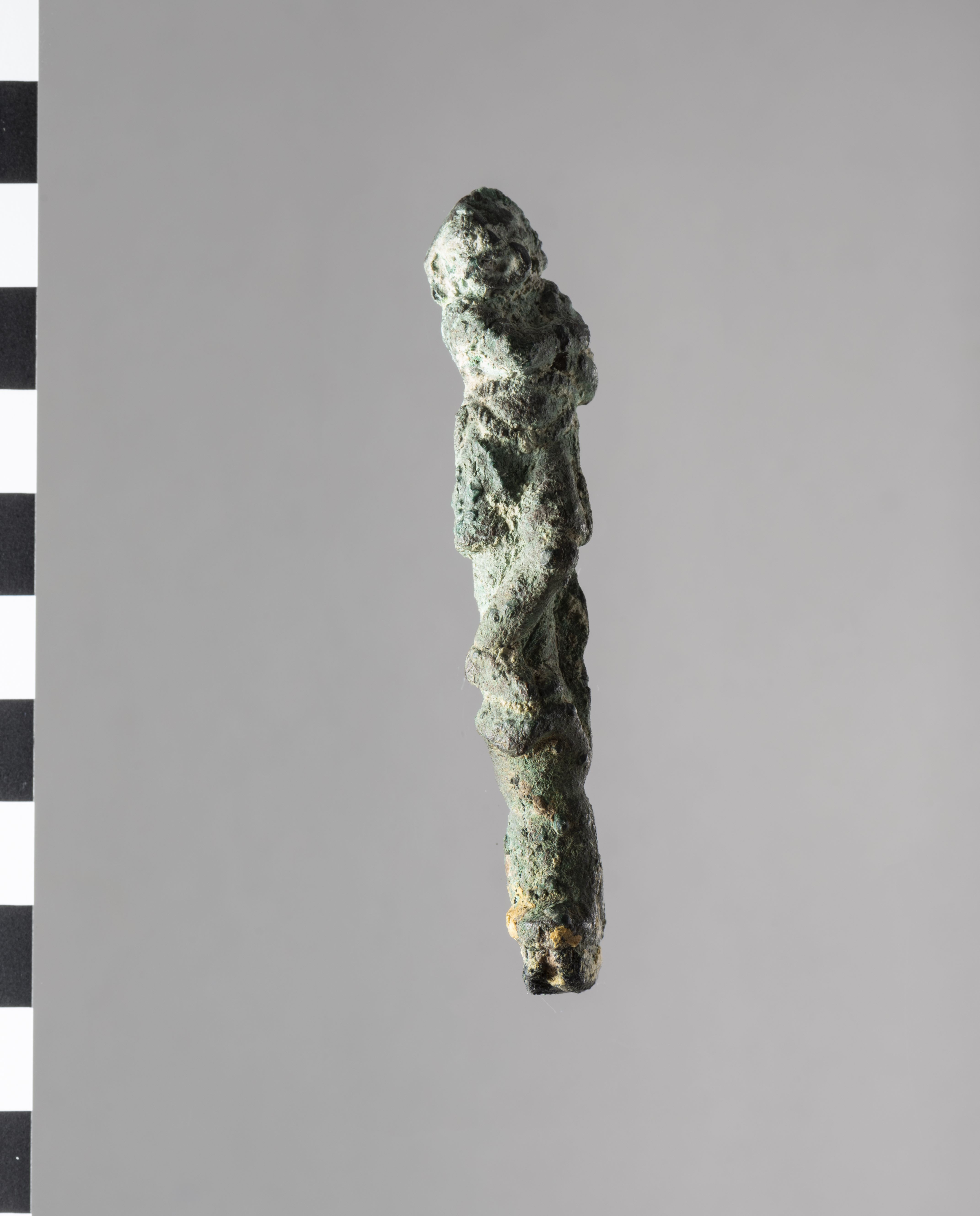 Knife handle with figure of a comic actor wearing a mask. The hair reaches the shoulders, the mask features a wide, pronounced mouth. The arms are bent: the right reaches towards the left shoulder, and both hands hold an object, possibly a piece of fabric or a bag, which falls over the back. The belly is prominent and adorned with a belt which hangs down on both sides. The figure wears a kilt reaching the knees. The legs are crossed, with the left in front of the right. The actor leans slightly backward, supported by a structure, possibly vegetal in form, resting on an inverted lotus flower. The ensemble rests on a rectangular base. The object is made in the lost-wax technique for solid casts.