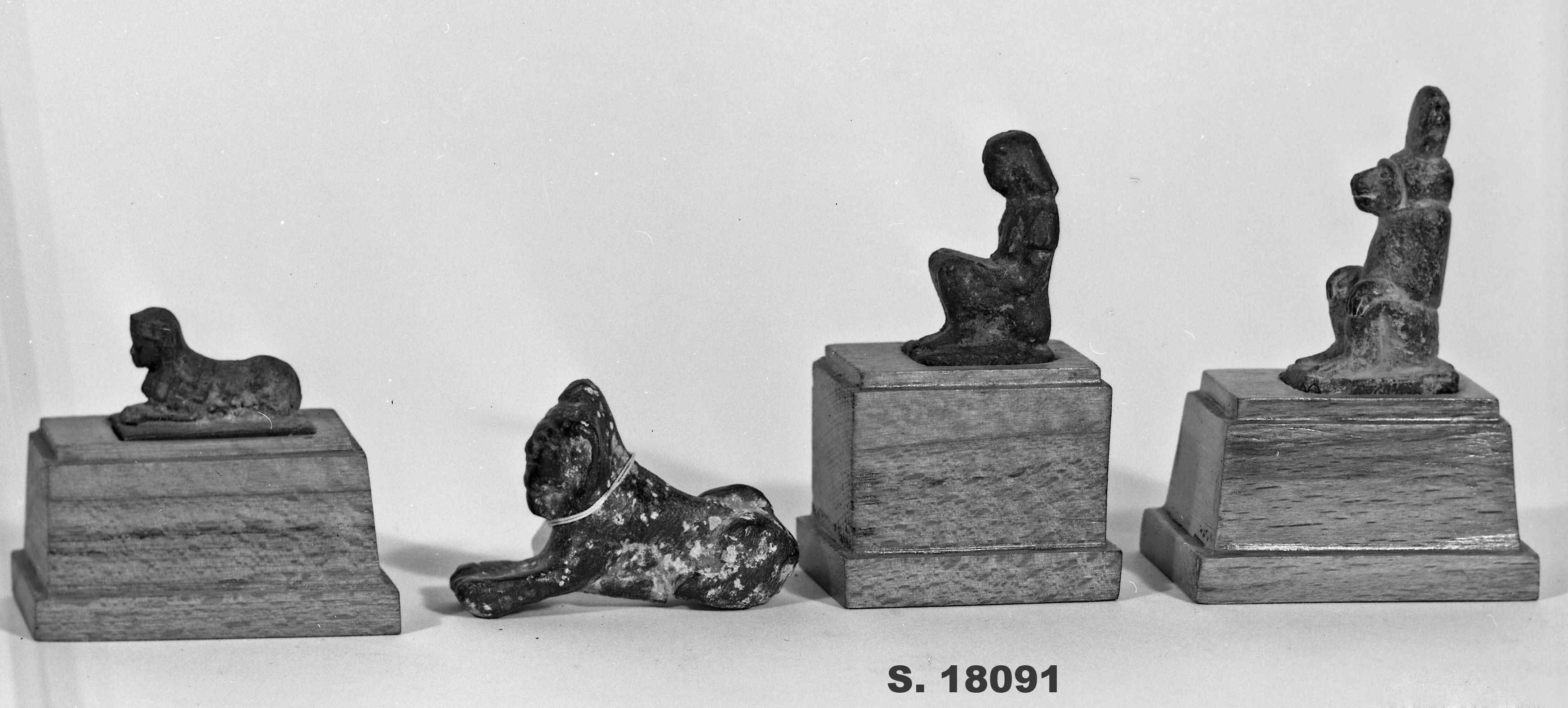 Figure of a squatting scribe. He has a plain bag wig. He is wearing a New Kingdom short-sleeved tunic, the arms are bent and both hands are placed palm down on the thighs. The figure rests on an almost rectangular base. The object is made in the lost-wax technique for solid casts.