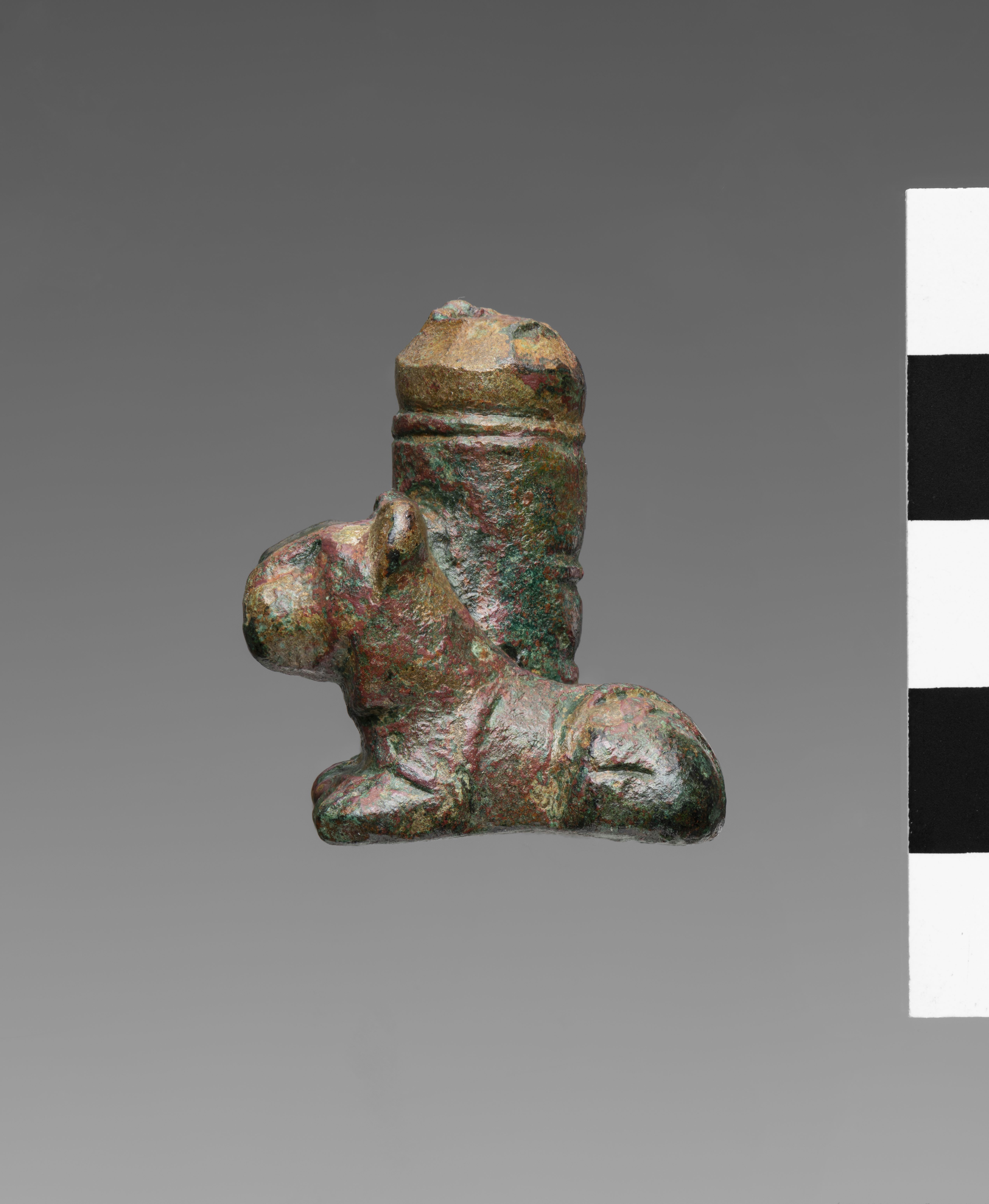 Fragment of an arched sistrum handle. The fragment corresponds to the base, flanked by two lions, recumbent and stylised, with their tails curling around the outer thighs. The object is made in the lost-wax technique for solid casts.