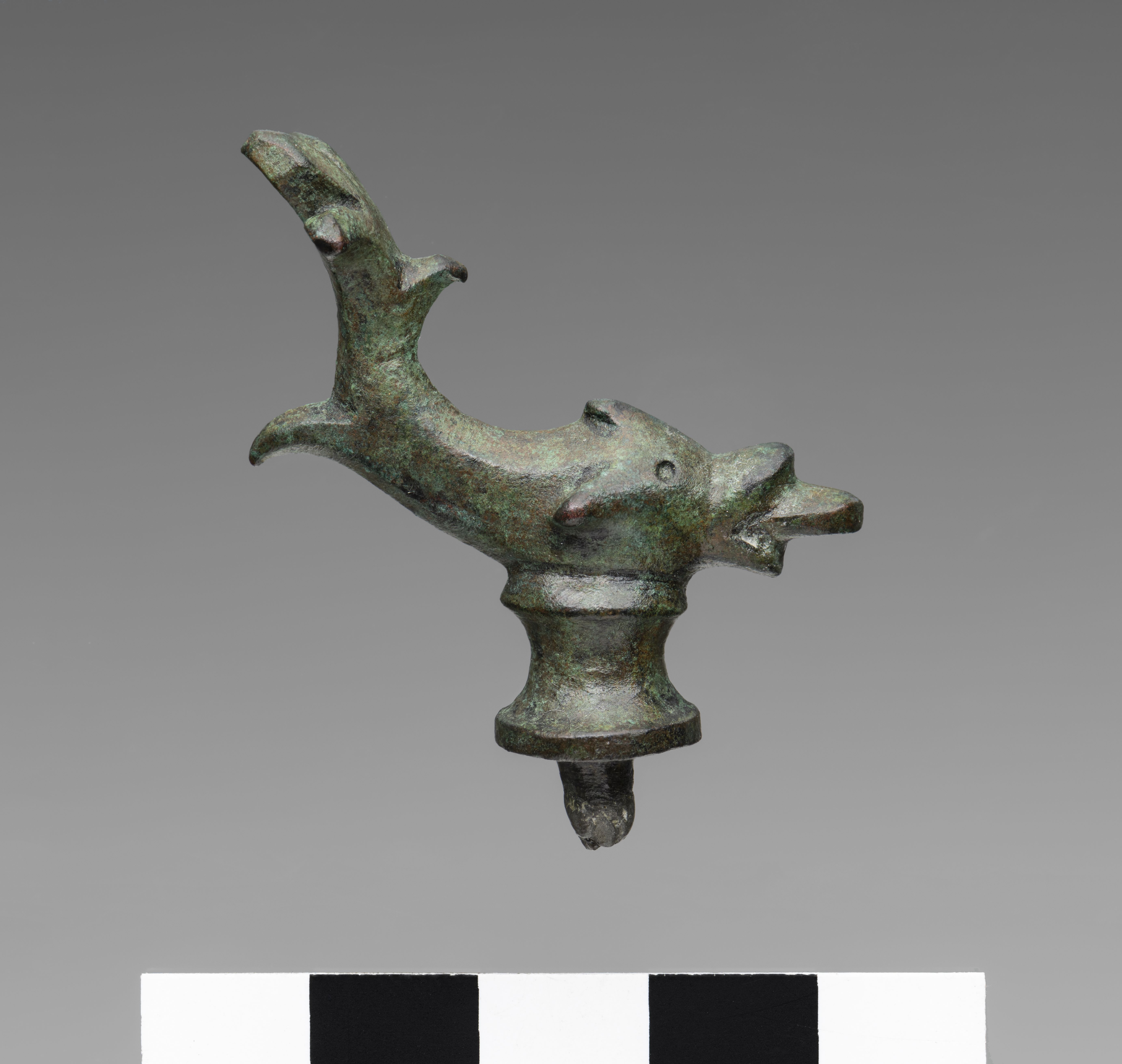 Figure of a fish holding a coin in its mouth. It has small lateral fins and a dorsal fin. The fan-shaped tail is divided into four parts. The fish stands on a circular pedestal with a concave profile. A circular-section tenon, broken at the tip, projects down from the base. The object is made in the lost-wax technique for solid casts.