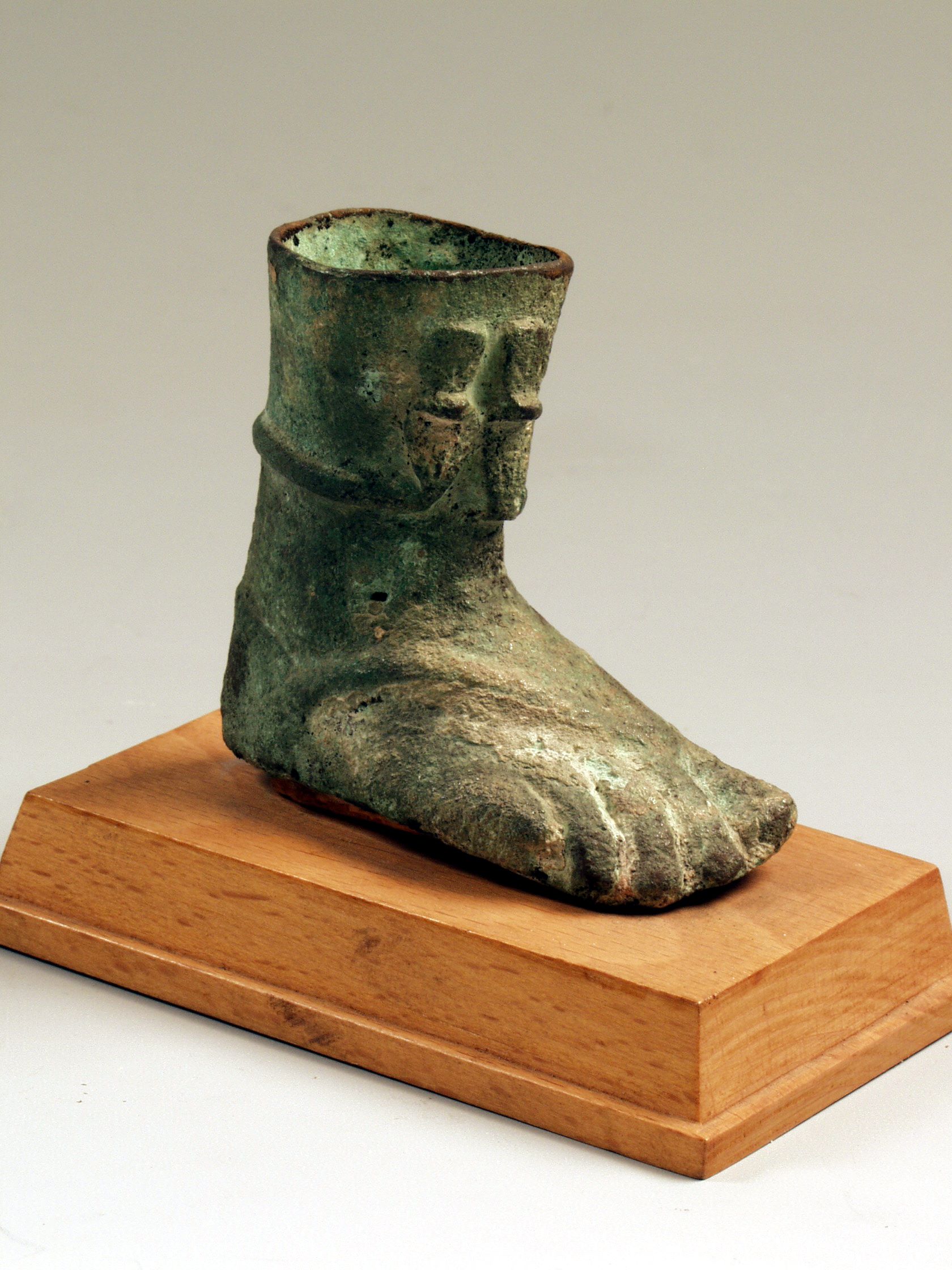 Hollow foot, probably part of a statuette, missing the base. At the ankle, it bears an ornament, a sort of anklet ending with two uraei crowned with solar discs. The foot wears a sandal, secured by a strap passing behind the ankle. The object is made in the lost-wax technique for hollow casts.