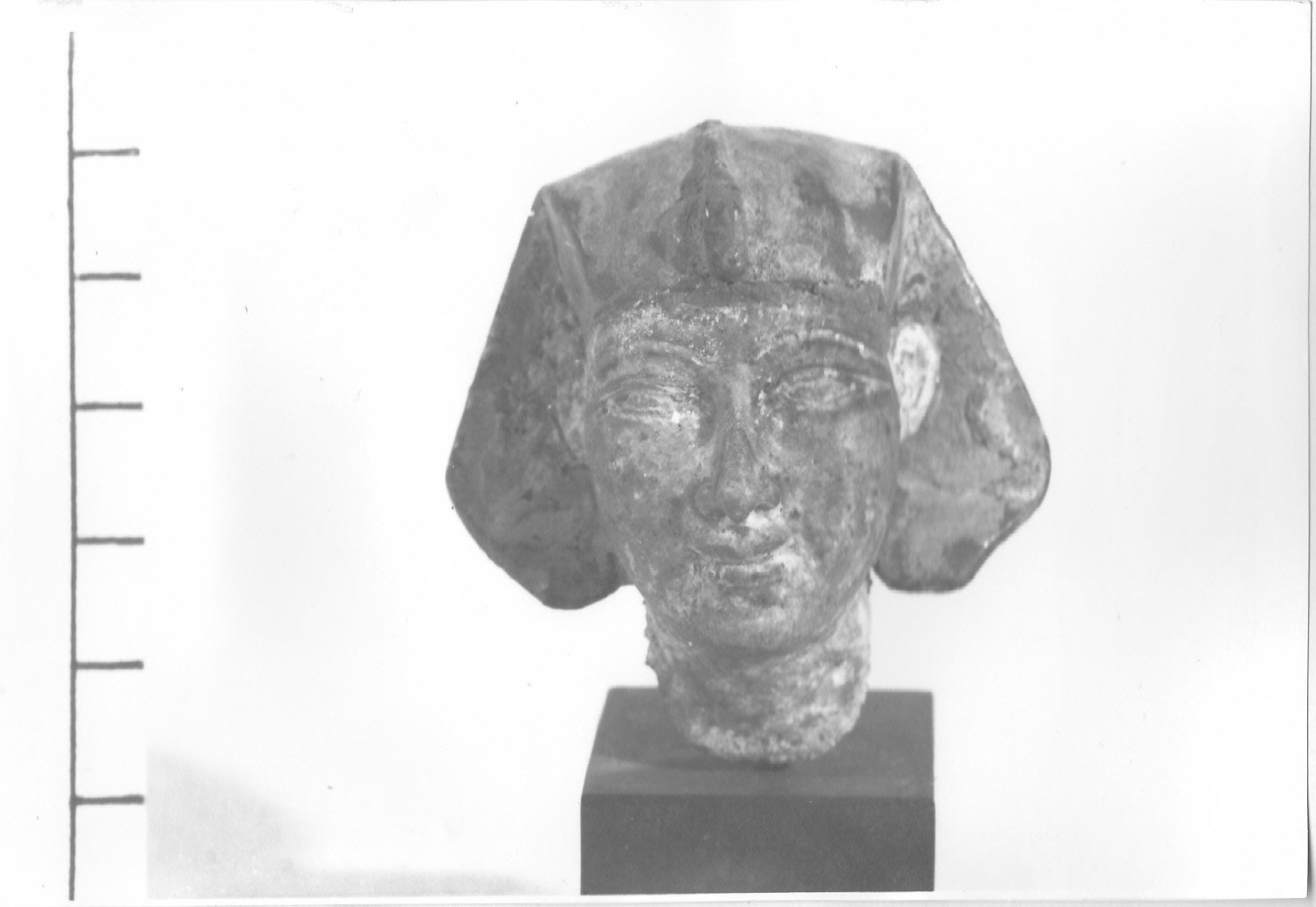 Head of a royal statuette, possibly a modern copy. The face is made of faience or blue-painted stone. The pharaoh’s face is oval in shape, with well-proportioned and delicate features. Under the neck is a rectangular cavity, probably intended for insertion onto a statuette. The pharaoh wears a nemes which appears to be made of bronze, with a uraeus featuring a long tail and two coils. The object’s authenticity remains uncertain.