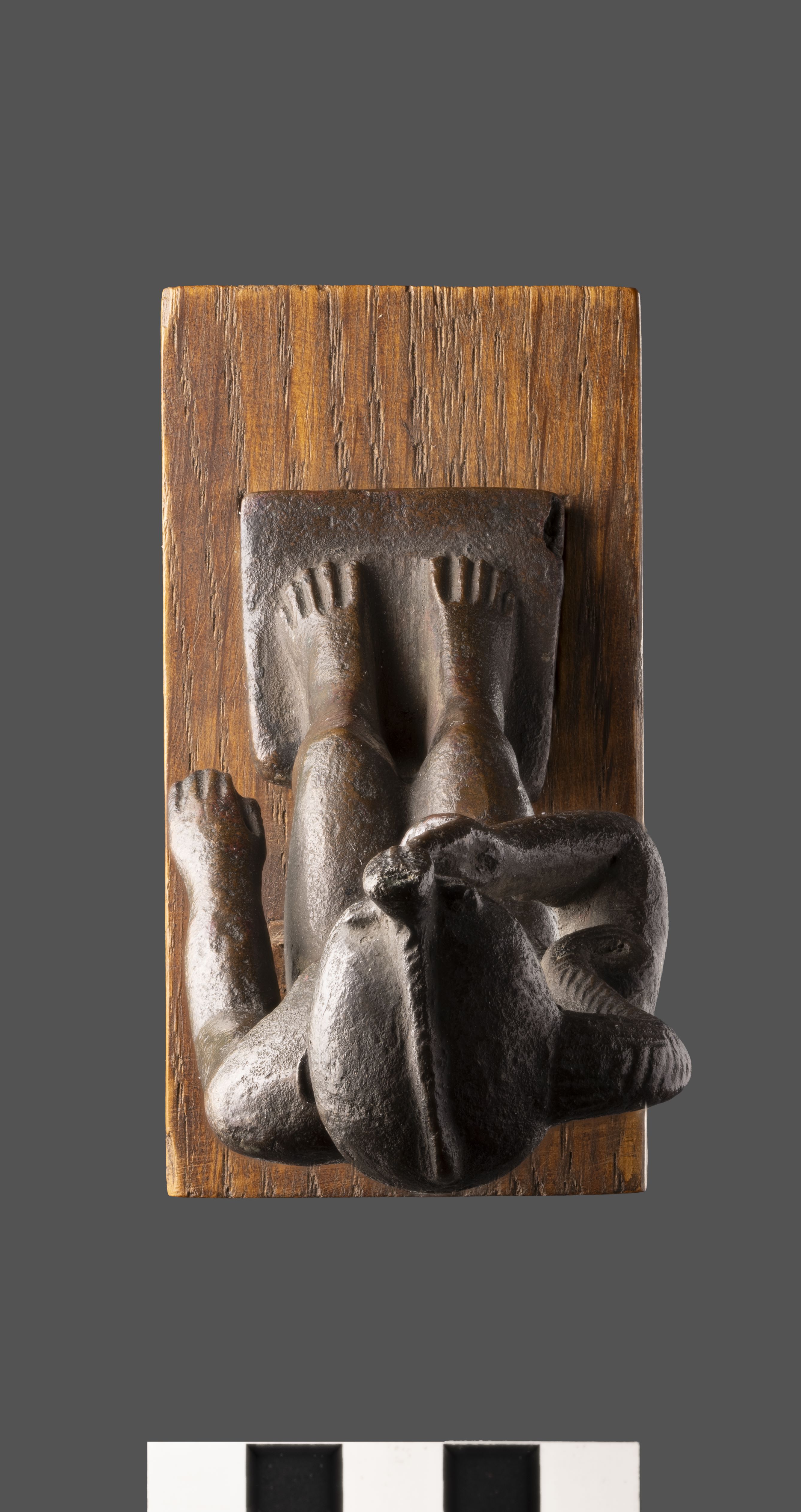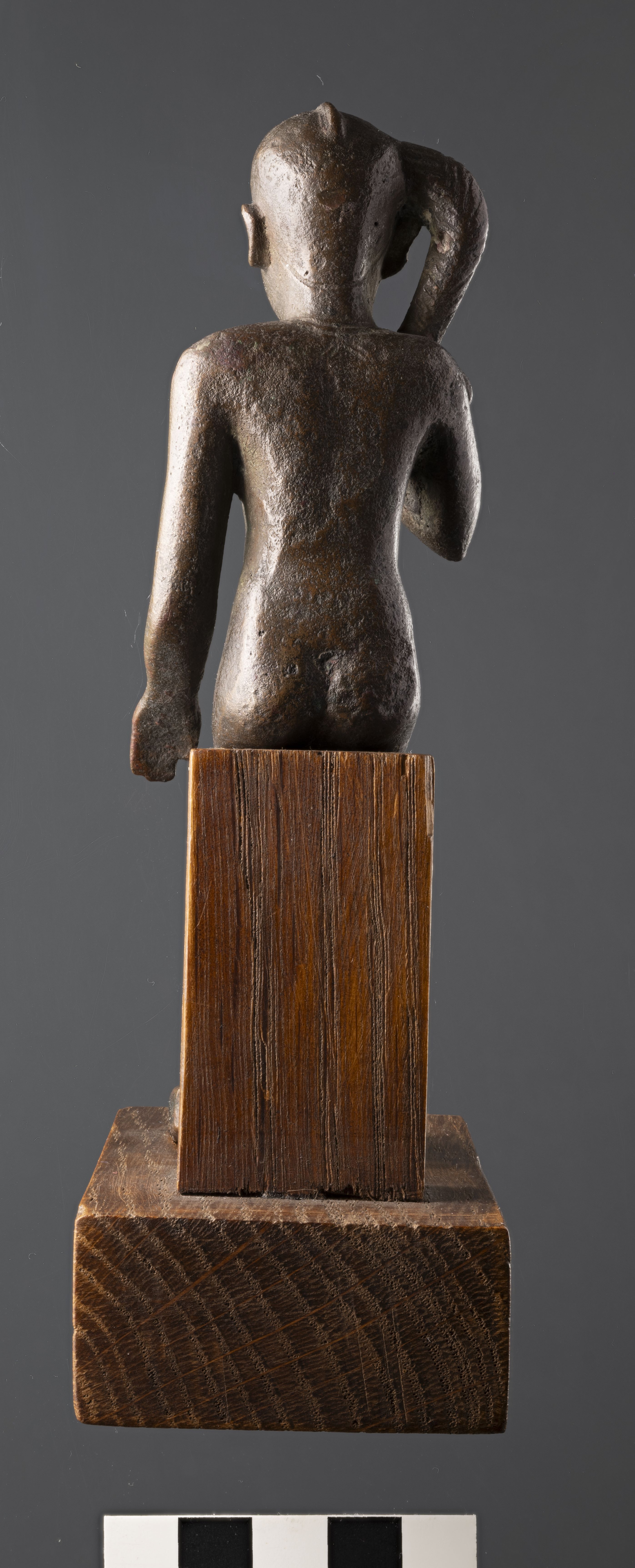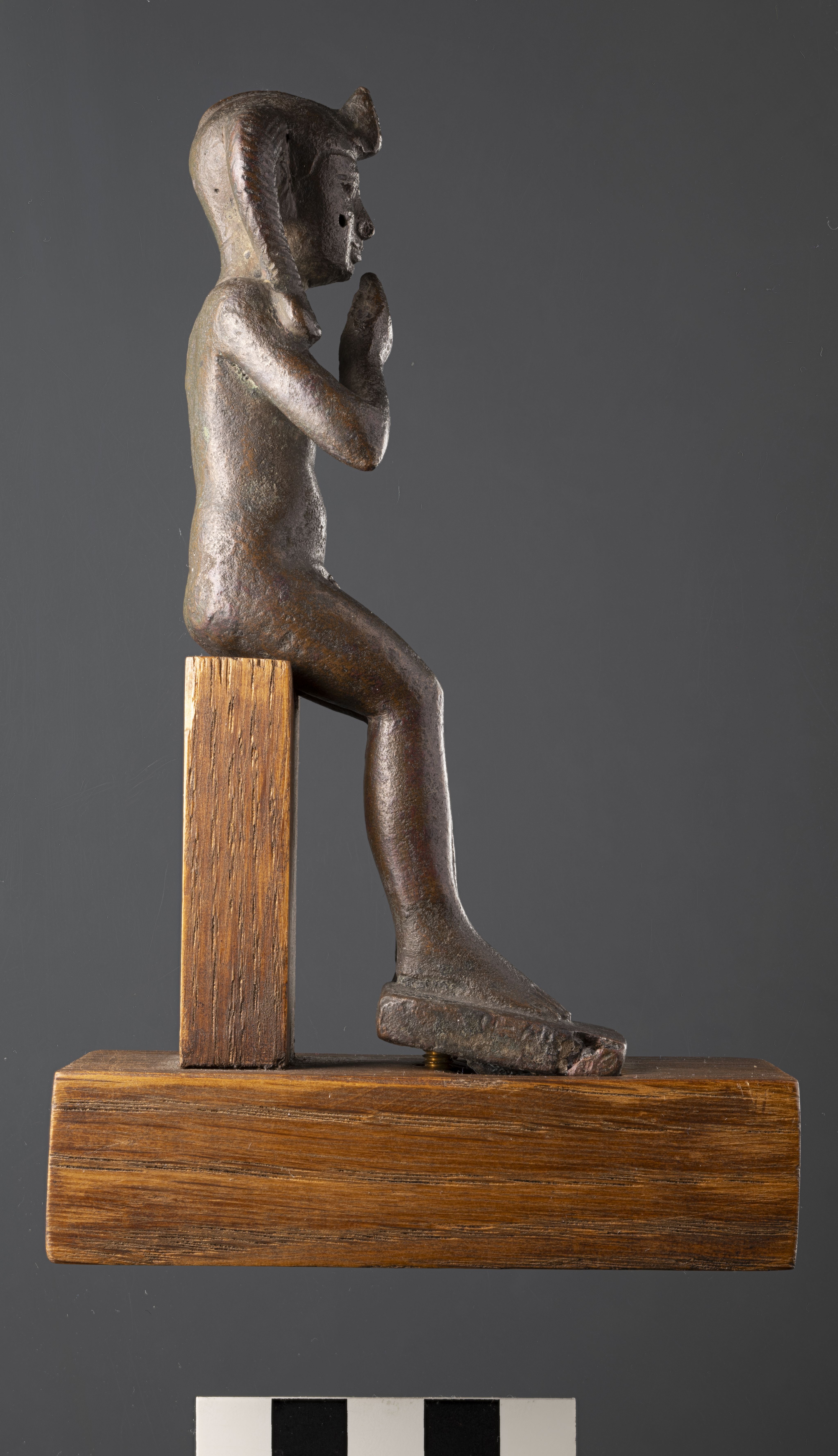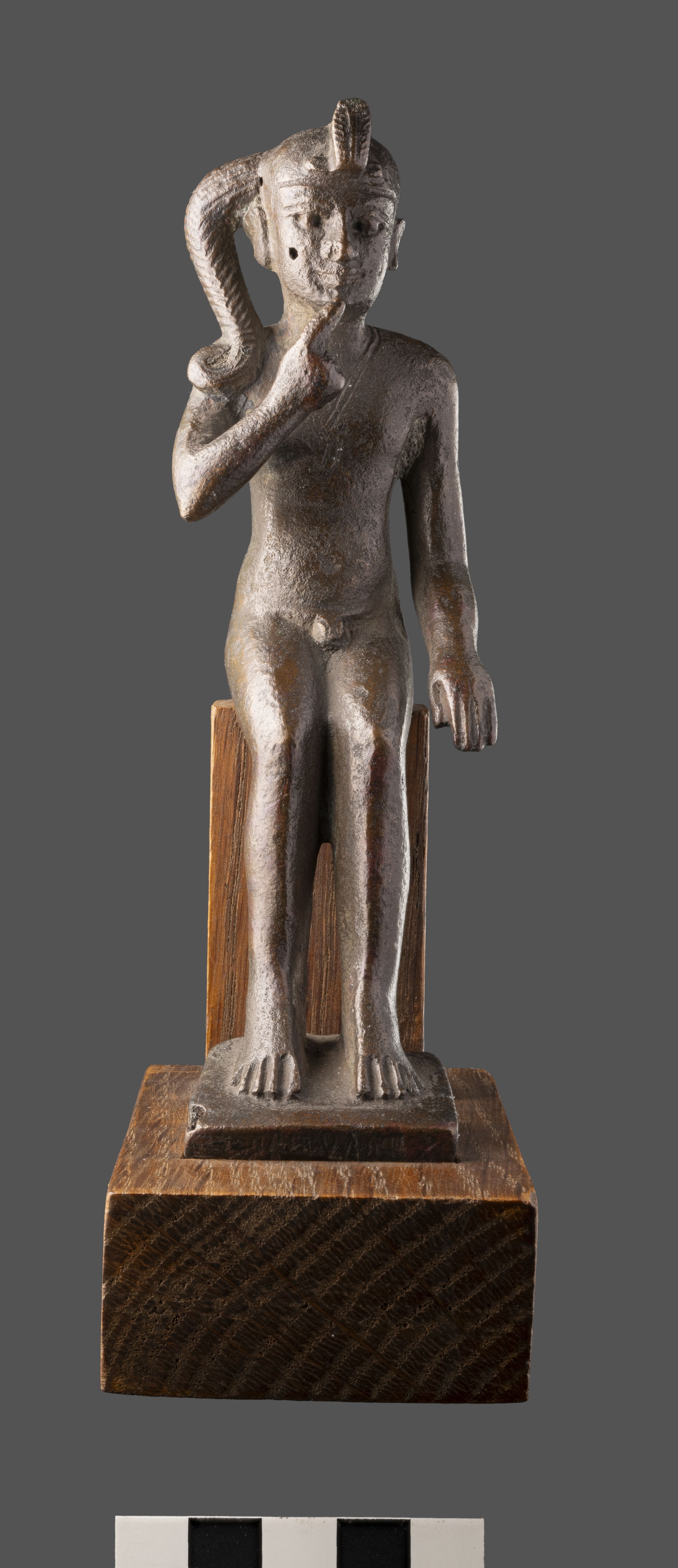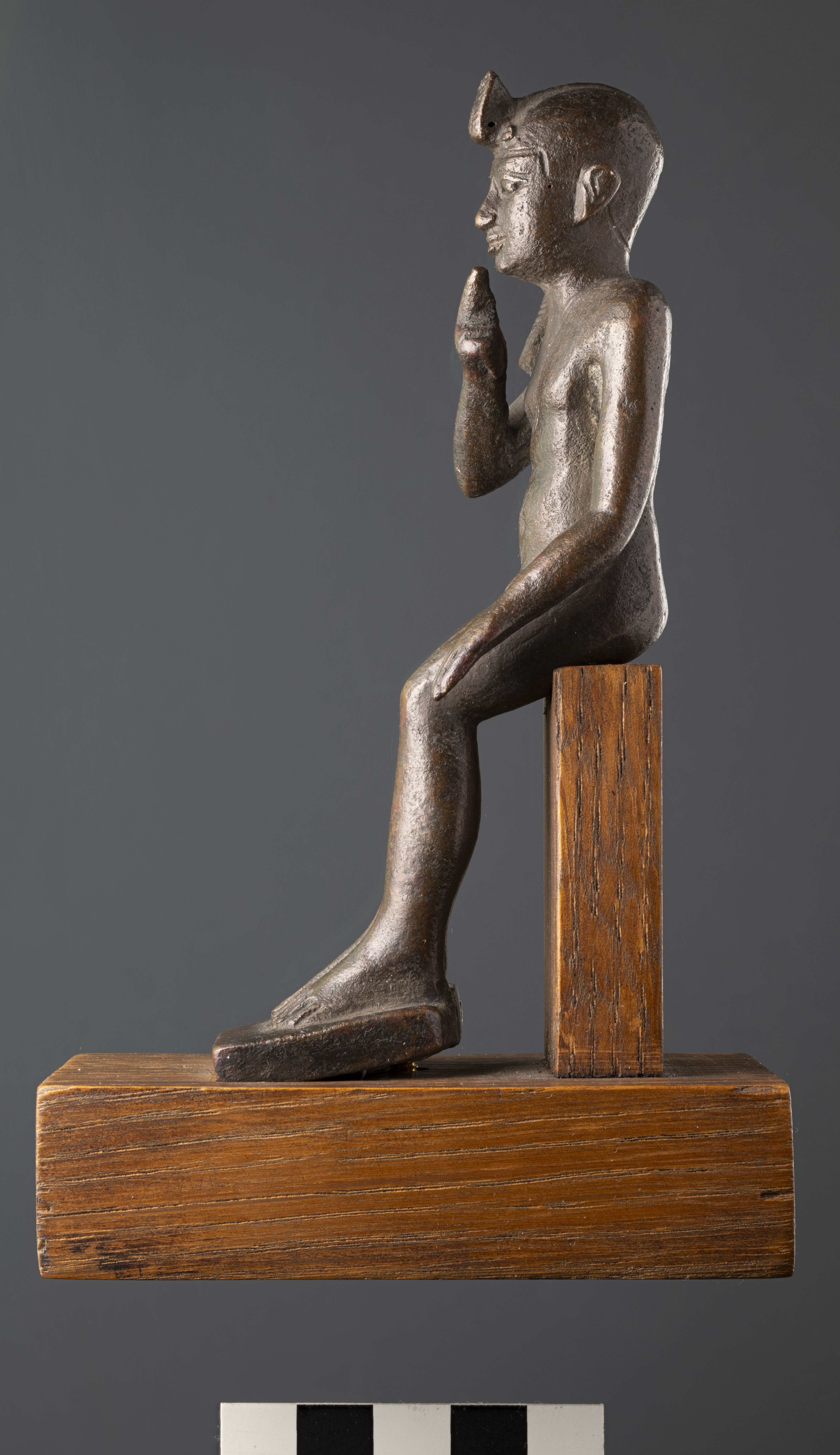 Seated, naked figure of Harpocrates. The god is depicted wearing a skullcap with a double-coiled uraeus. On the right side of the head, the side-lock of youth is present, decorated with a braided pattern and ending in a curl on the shoulder. Around the neck, Harpocrates wears a necklace with a double-knot amulet. The right arm is bent, and Harpocrates brings the index finger to his mouth. The left arm extends along the body, slightly detached, with the open hand facing downward. The legs are joined down to mid-calves. The feet, with modelled toes, rest on a trapezoidal base which is inscribed on the front and right sides. The statuette is mounted on a wooden base with a large brass screw. The object is made in the lost-wax technique for solid casts.