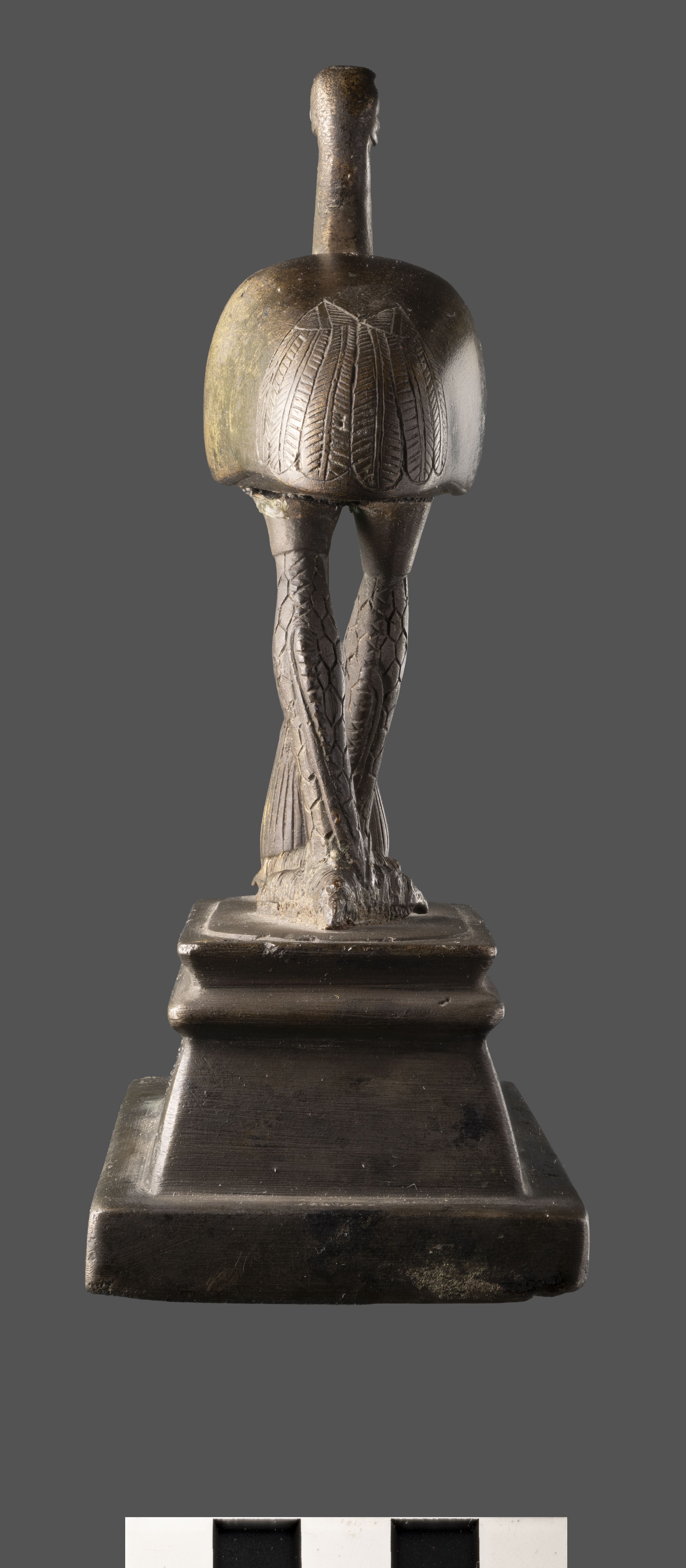 Group of statuettes with ibis and Maat on a base. The assemblage seems to be the result of a pastiche of ancient and modern parts. The ibis and the base appear ancient. The ibis has a long beak, curved downwards. The head is small and round, and the eyes are recessed for the now-missing inlay. The ibis has a collar. The final part of the body displays details of the feathers. The legs are glued to the body and are detailed with a loop pattern on the thighs; the legs are stubby and detailed. The figure of Maat appears to be modern. The goddess wears a feather on her head, has a wig decorated with vertical lines, and there are locks hanging from the wig, one from each side and a thicker one at the back. The goddess is in a squatting position, with her legs in front of her. She is wearing a dress that does not allow the limbs to be distinguished. The goddess rests on a square base. The group is placed on a bronze base, with the ibis standing on a pedestal in the form of a naos with a cavetto cornice and torus moulding with a slightly raised oval shape on the upper side. The base is smoothed. Inside the base, a piece of light-coloured wood, possibly palm wood, is tightly fitted; it looks ancient and is broken at the rear right corner and along one of the sides. The object is made in the lost-wax technique for solid casts.