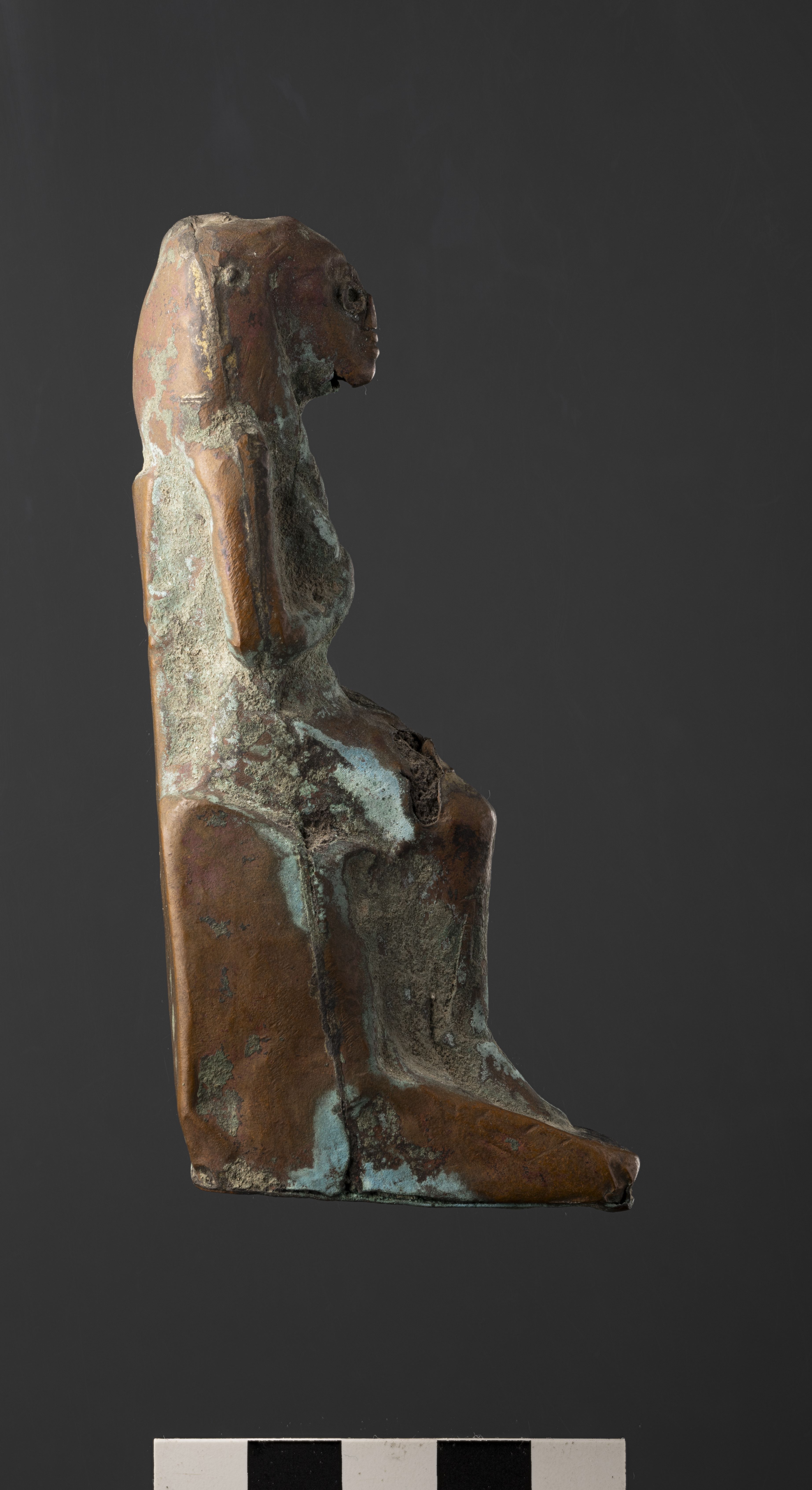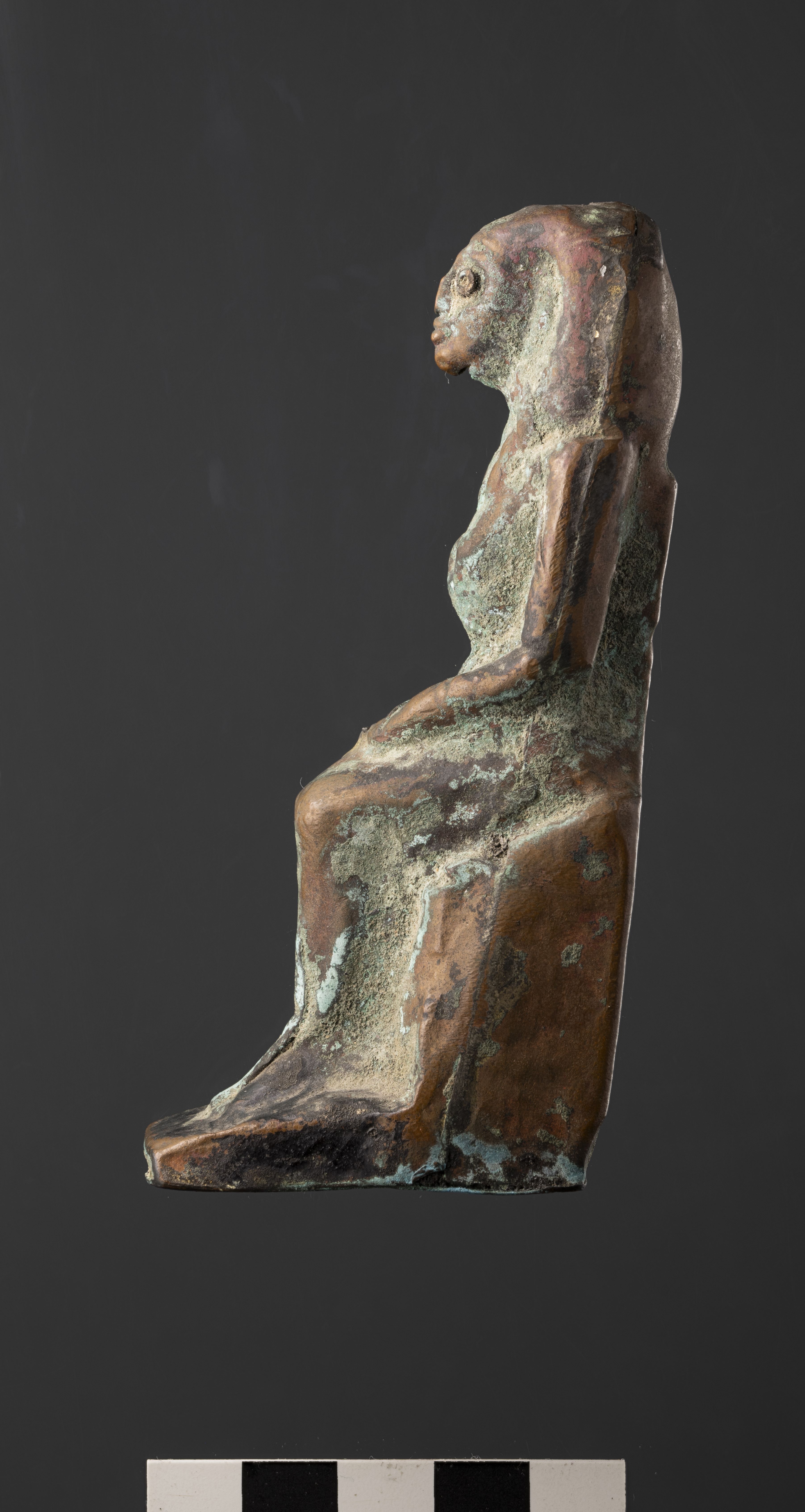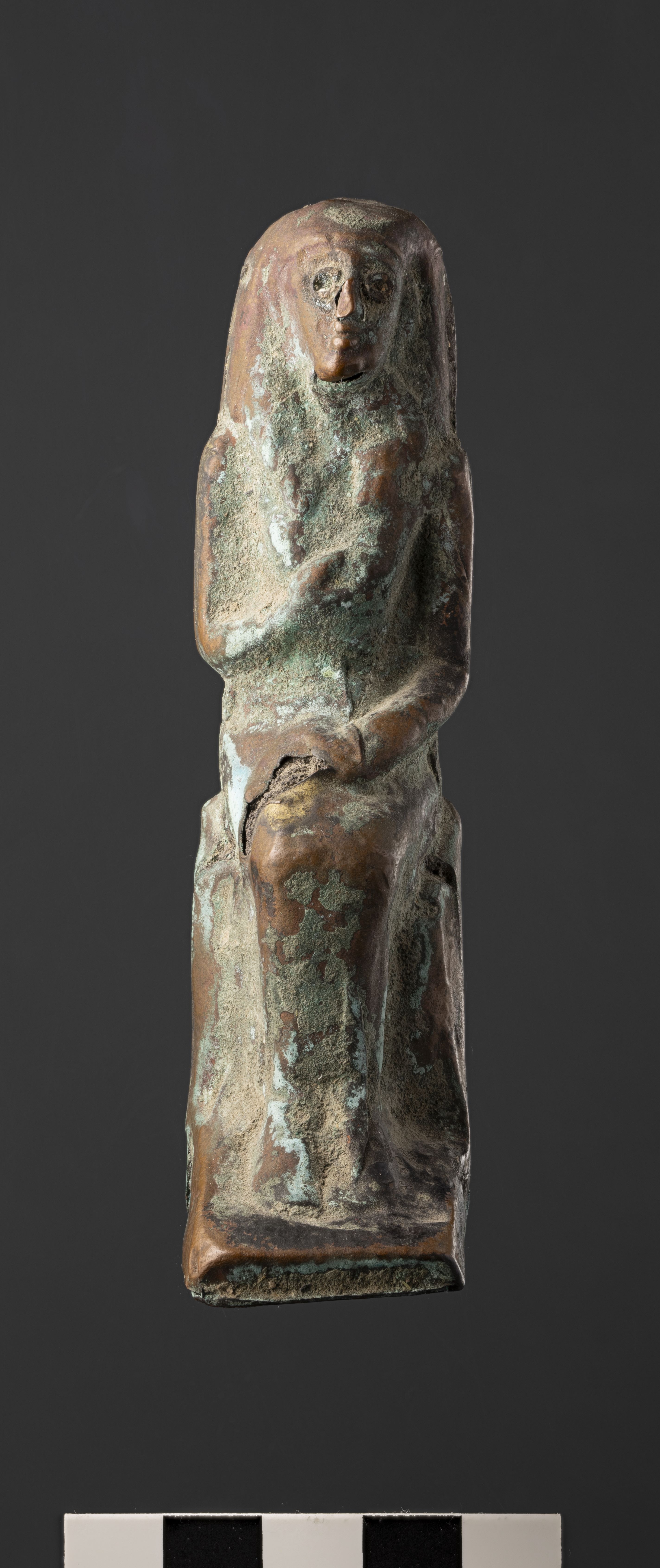 Figure of enthroned Isis. The goddess is wearing a wig that appears to be tripartite. The figure does not have a crown nor the uraeus on the wig, and the left arm is resting on the thighs, making it unclear if there was once a figure of a child. The face is oval and flattened. Isis brings her right hand to her left breast, and the left arm is bent, with the forearm resting on the thighs. The figure rests on a throne with a narrow backrest. The figure is made of three metal sheets, and the joints are visible on the sides and around the sheet that closes the object at the base. Under the base, there is a round hole through which a dark, crumbly material is visible.
