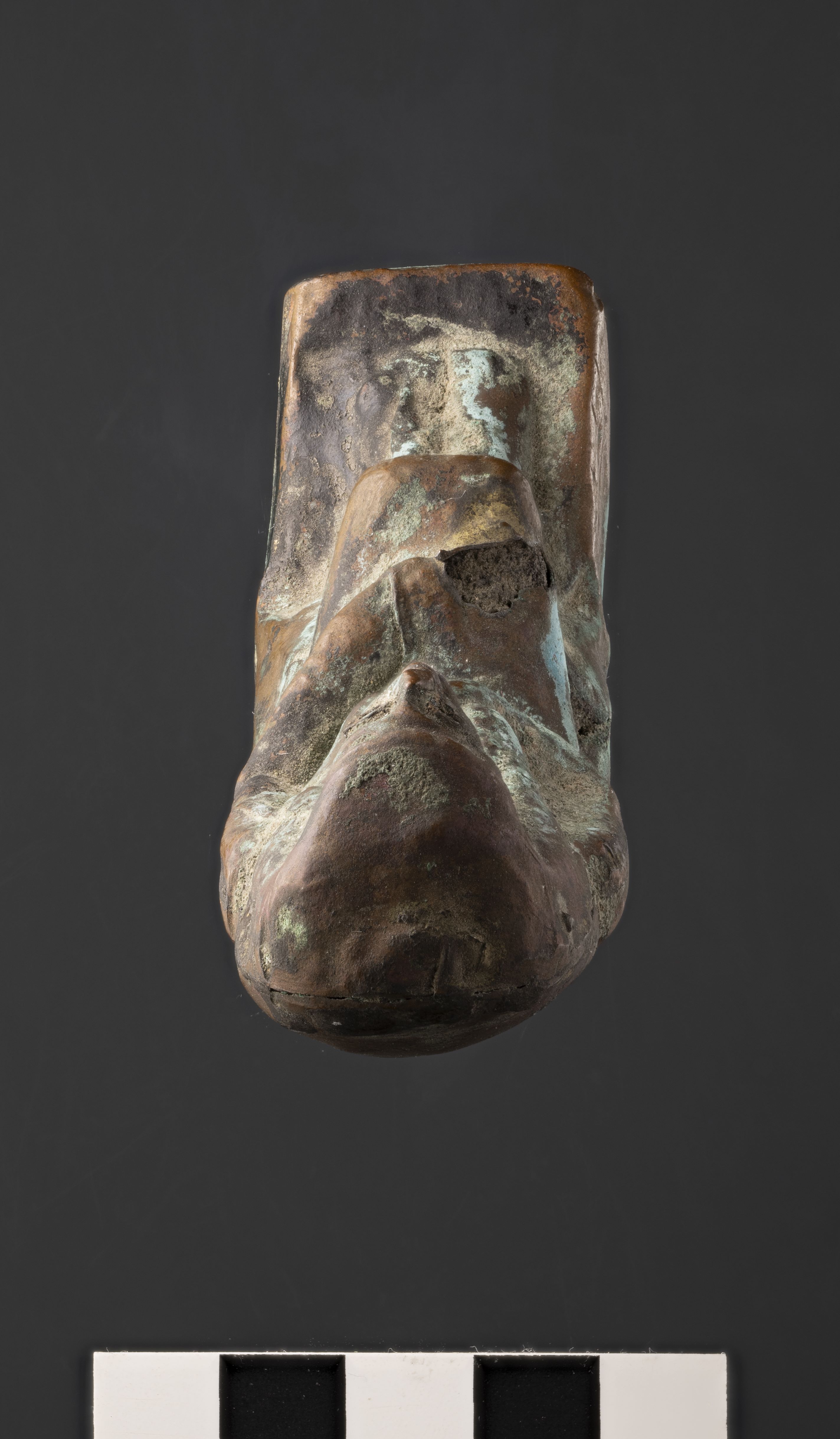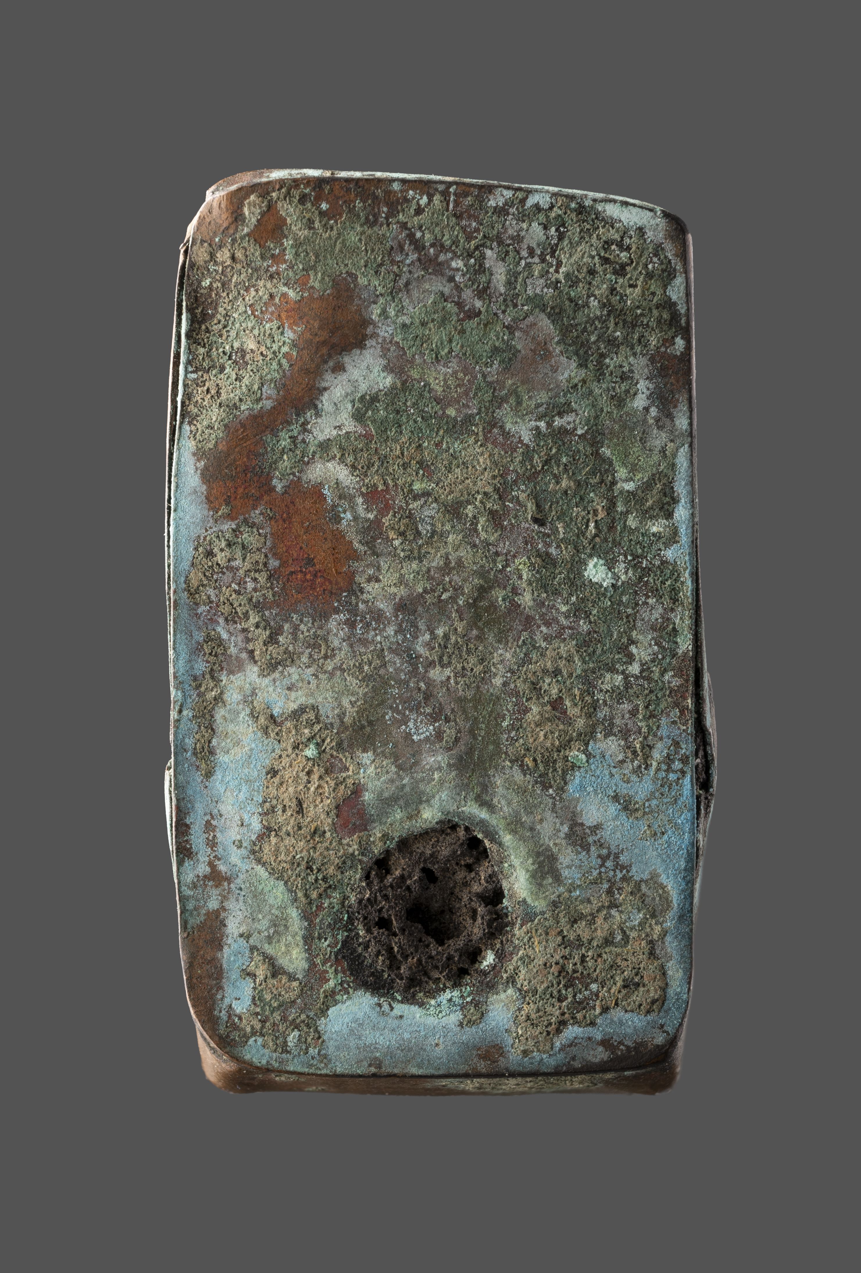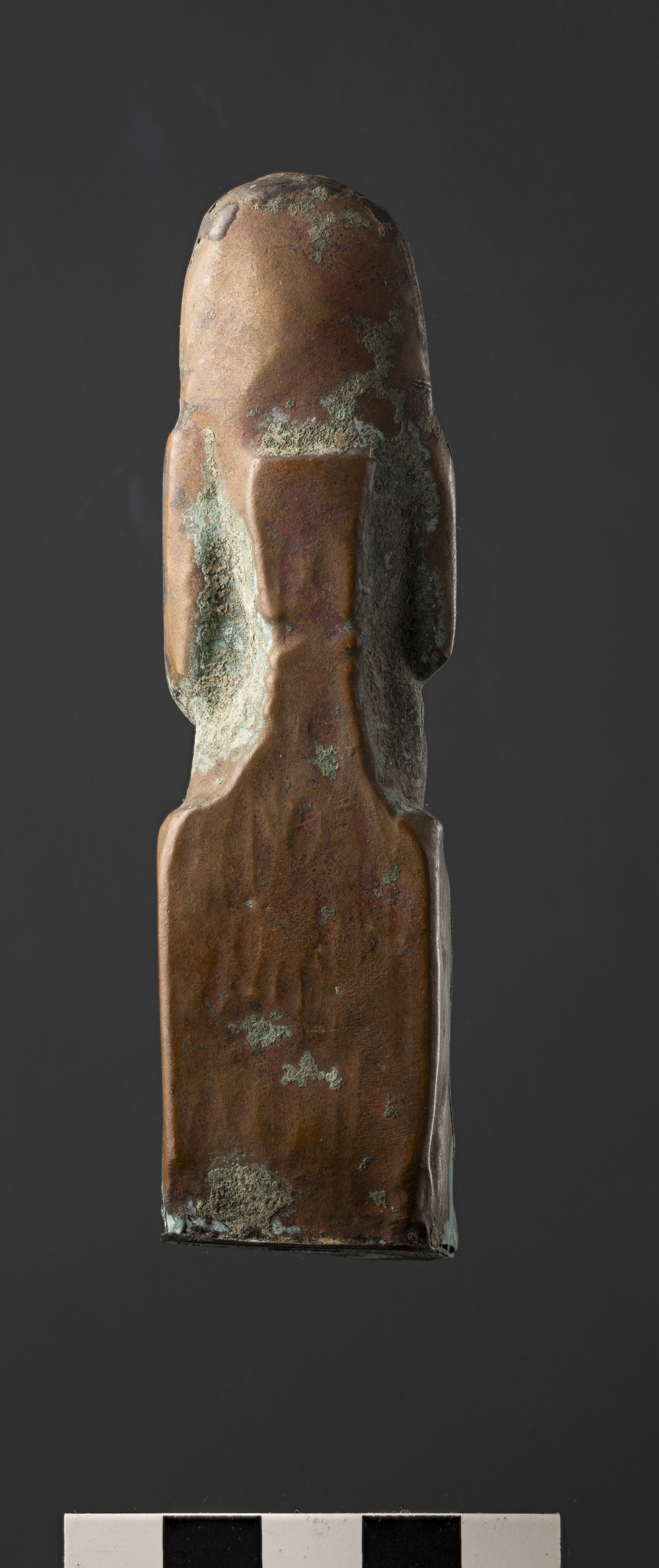 Figure of enthroned Isis. The goddess is wearing a wig that appears to be tripartite. The figure does not have a crown nor the uraeus on the wig, and the left arm is resting on the thighs, making it unclear if there was once a figure of a child. The face is oval and flattened. Isis brings her right hand to her left breast, and the left arm is bent, with the forearm resting on the thighs. The figure rests on a throne with a narrow backrest. The figure is made of three metal sheets, and the joints are visible on the sides and around the sheet that closes the object at the base. Under the base, there is a round hole through which a dark, crumbly material is visible.