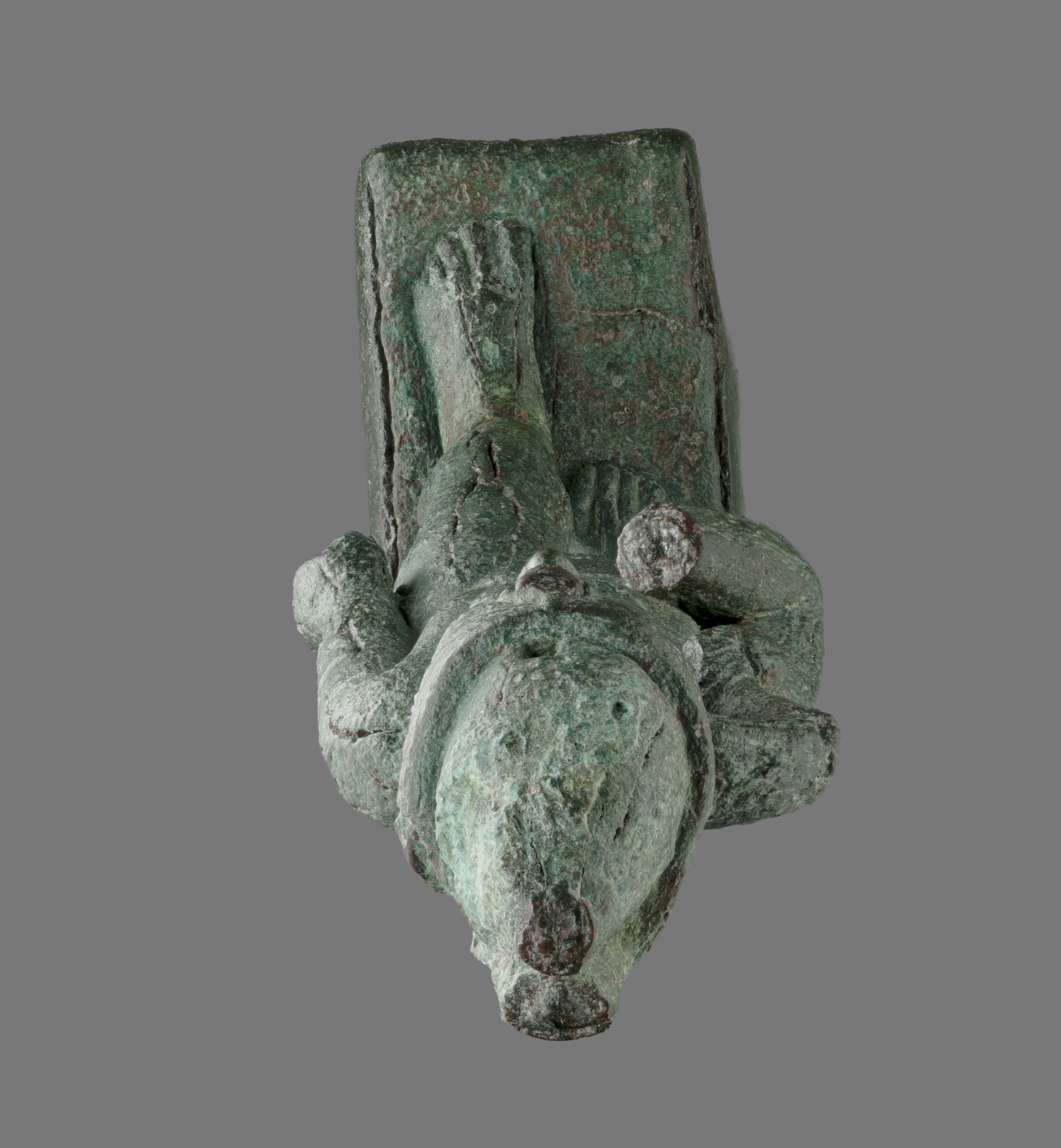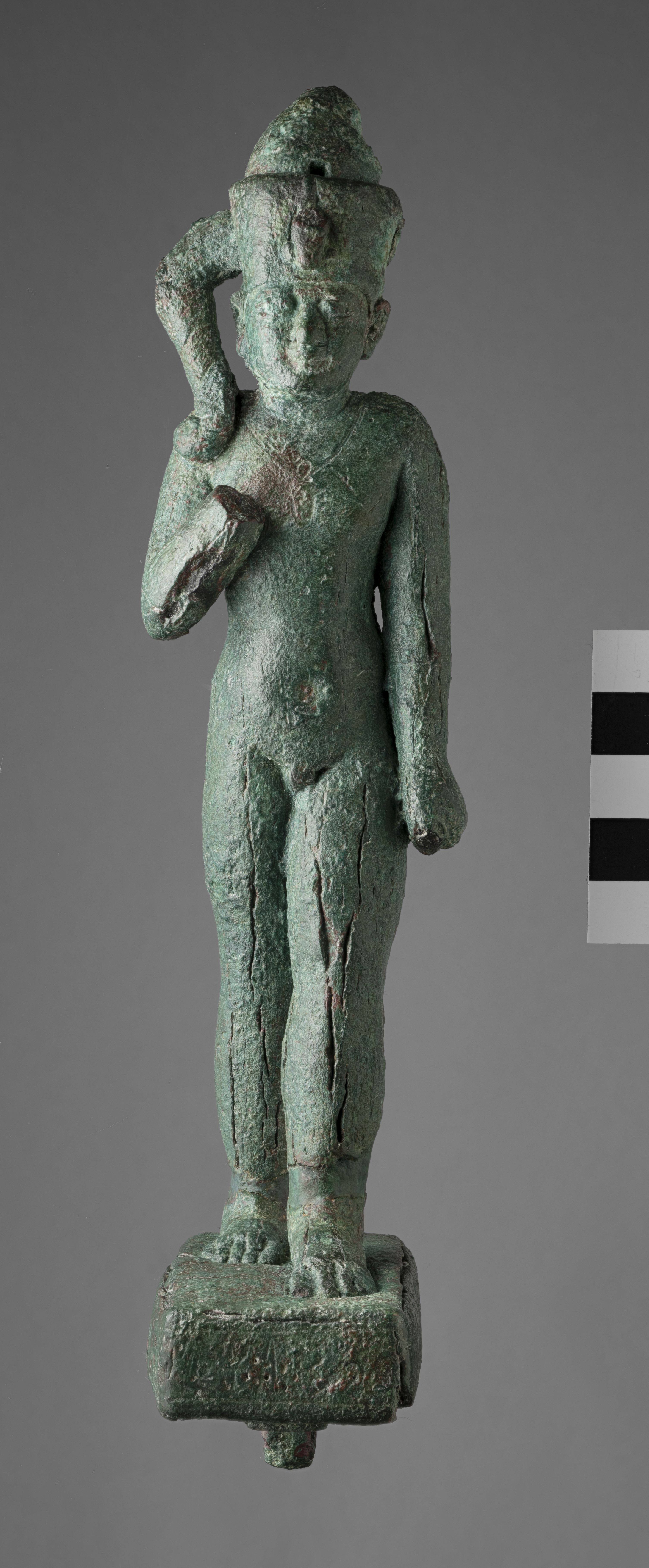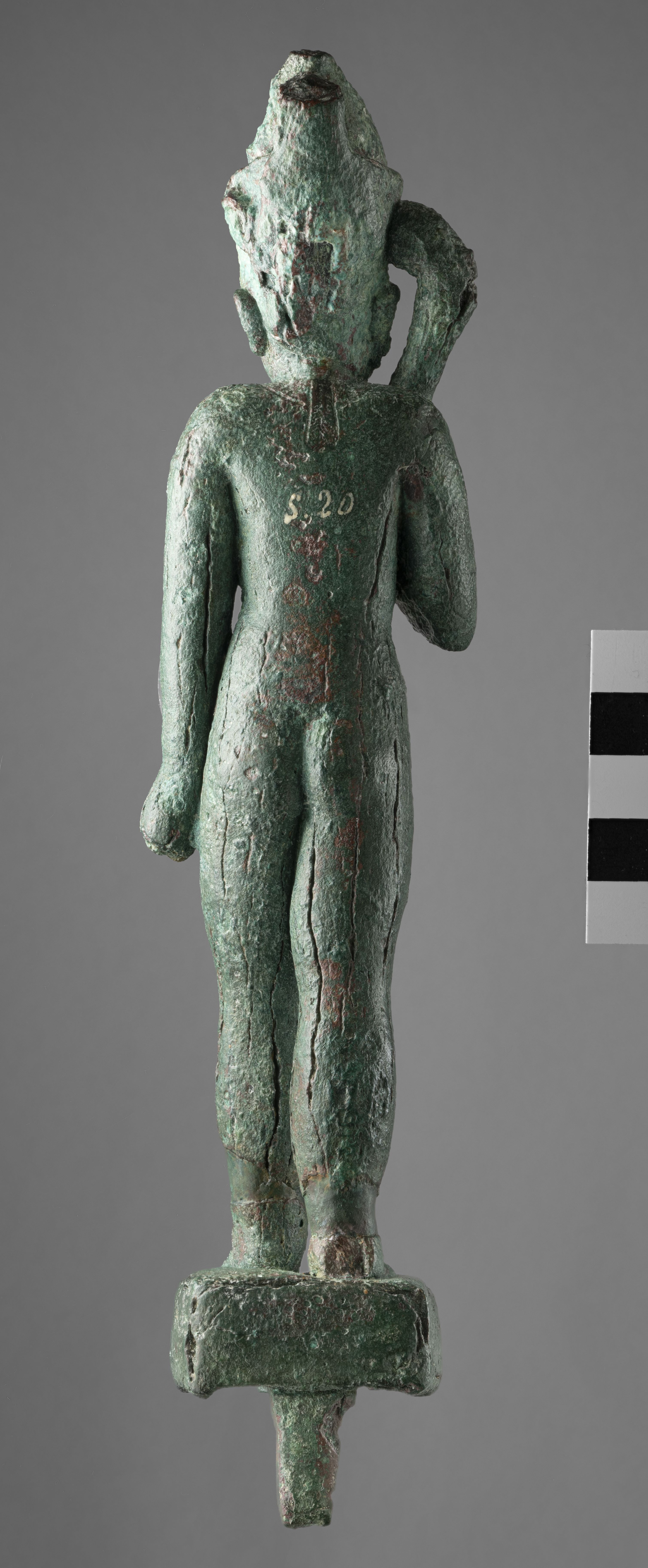Standing figure of Harpocrates, striding with left leg forward. The god is wearing the double crown, the lituus is missing. The red crown is decorated with the uraeus. A streamer descends from the crown on the upper back. Harpocrates has a decorated side-lock on the right side of the head, which ends with a curl on the shoulder. Harpocrates has a necklace with a pendant, which is not clearly visible. The left arm is at side, the hand is clenched in a fist. The right arm is bent, the hand is broken. It seems that the feet broke at the ankles and seem to have been recently repaired. The figure rests on a hollow rectangular base. The front and right sides of the base are inscribed. Two square tenons protrude from the base. The object is made in the lost-wax technique for solid casts.