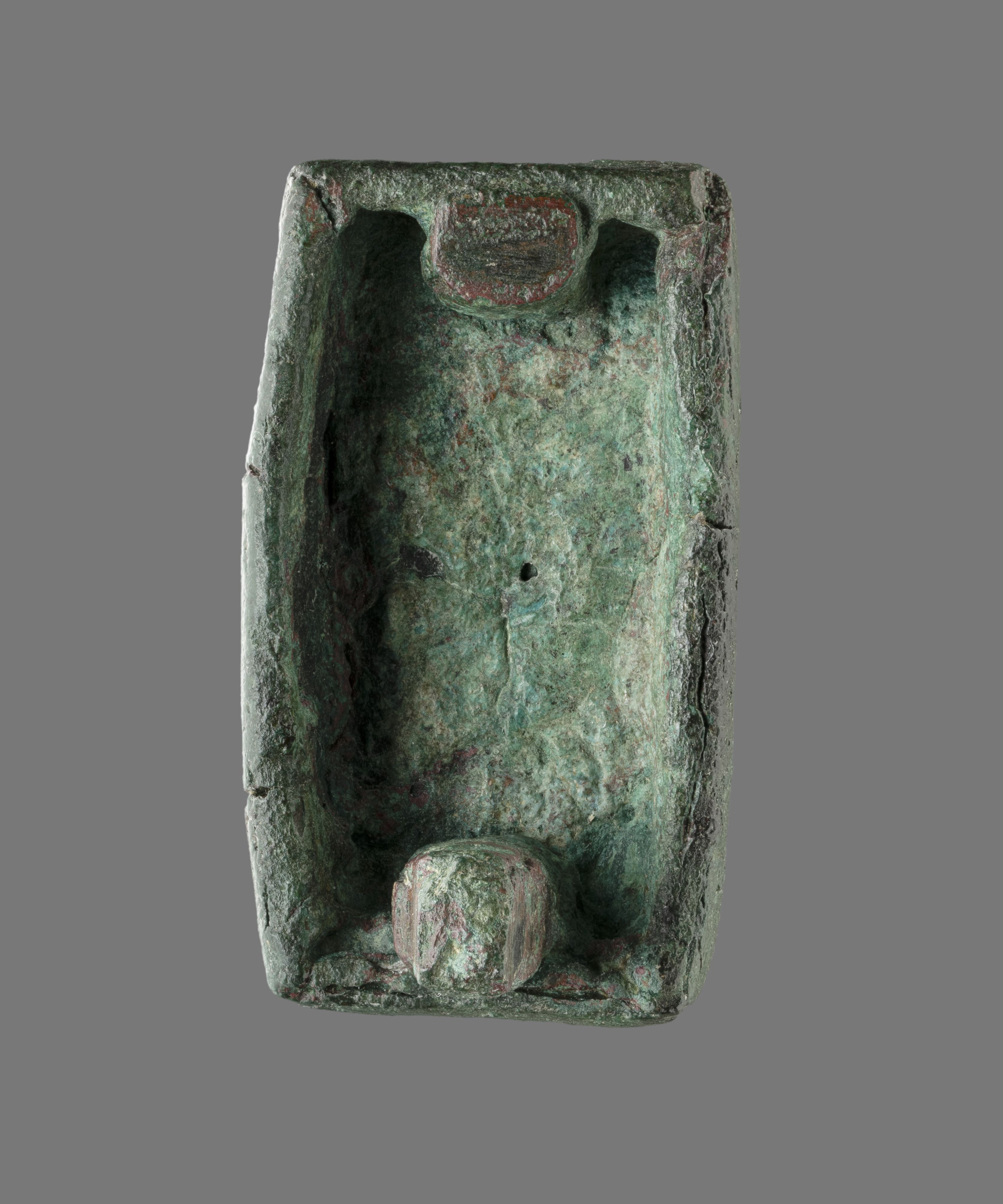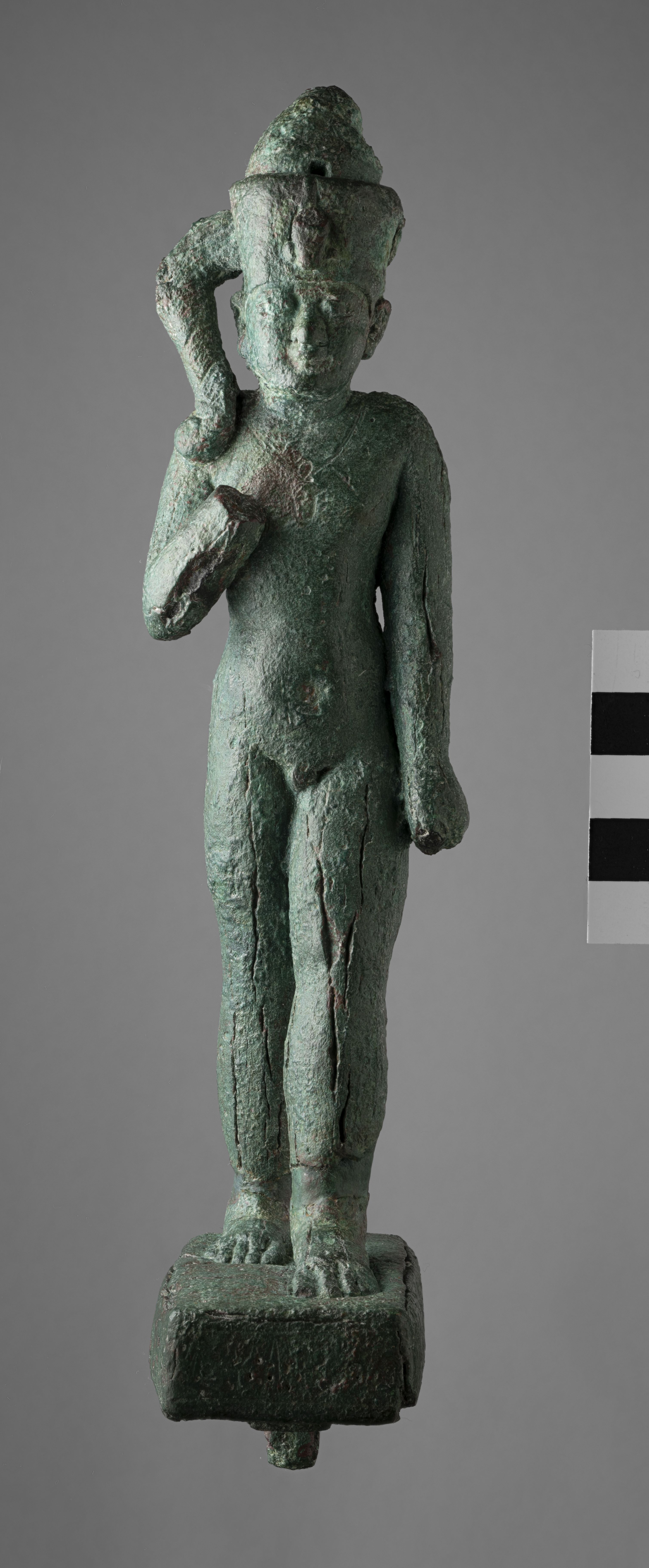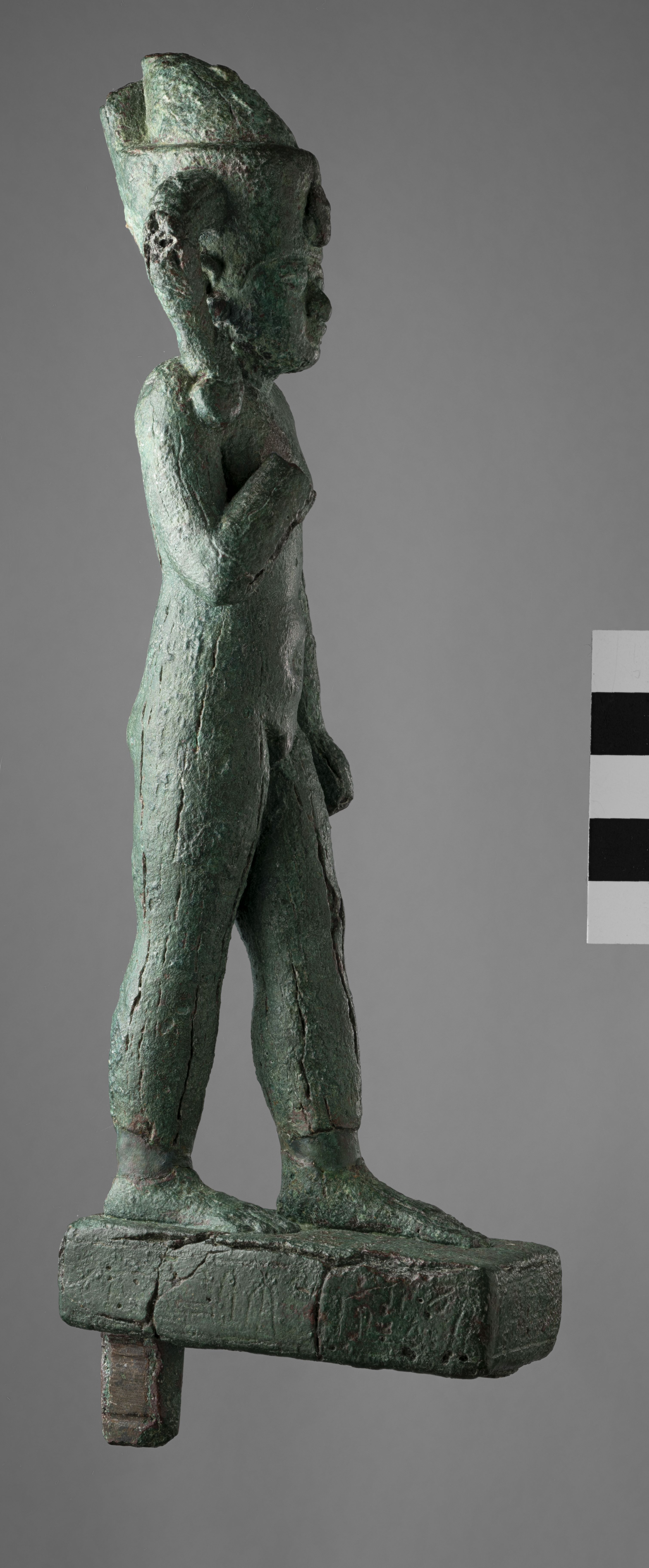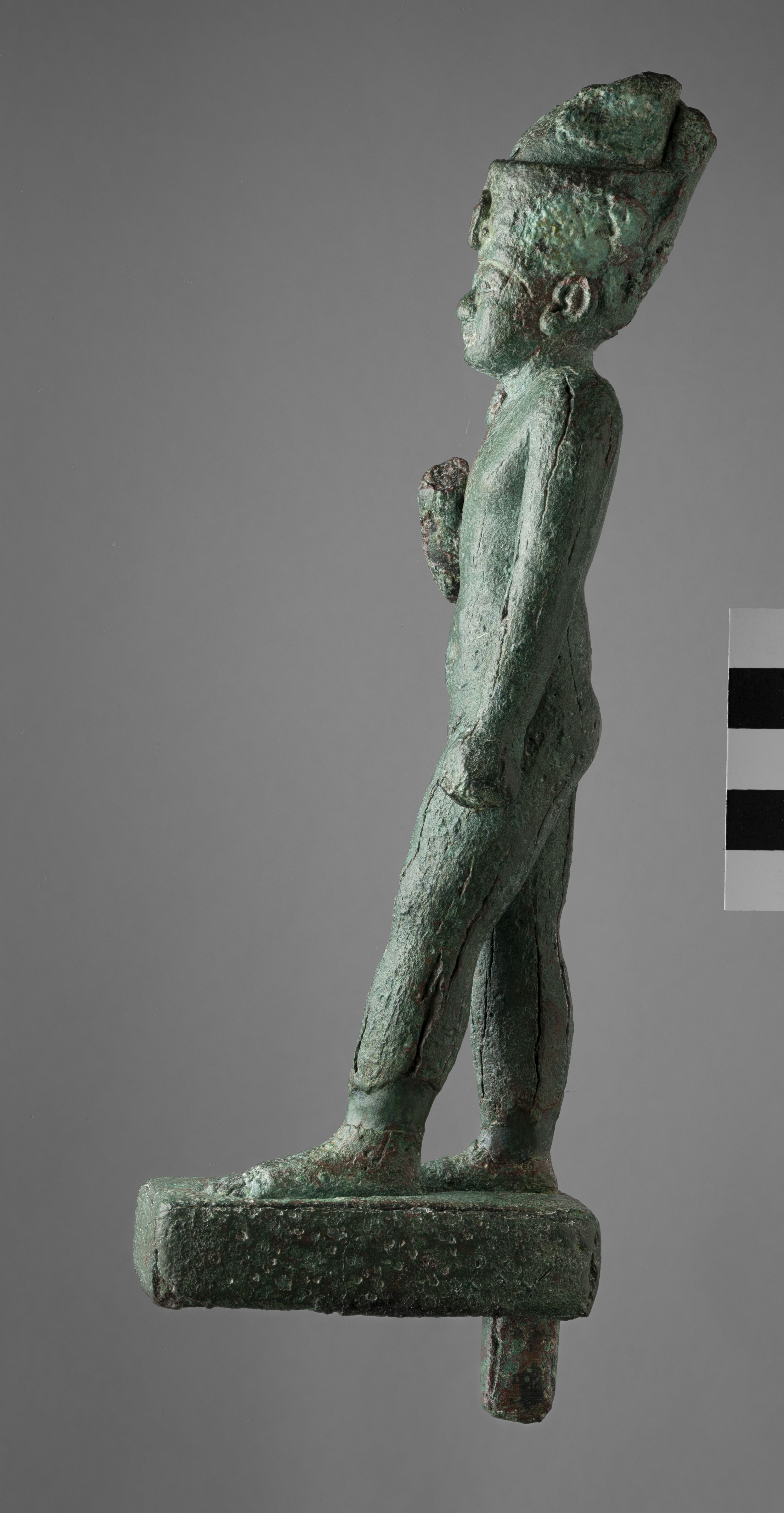 Standing figure of Harpocrates, striding with left leg forward. The god is wearing the double crown, the lituus is missing. The red crown is decorated with the uraeus. A streamer descends from the crown on the upper back. Harpocrates has a decorated side-lock on the right side of the head, which ends with a curl on the shoulder. Harpocrates has a necklace with a pendant, which is not clearly visible. The left arm is at side, the hand is clenched in a fist. The right arm is bent, the hand is broken. It seems that the feet broke at the ankles and seem to have been recently repaired. The figure rests on a hollow rectangular base. The front and right sides of the base are inscribed. Two square tenons protrude from the base. The object is made in the lost-wax technique for solid casts.