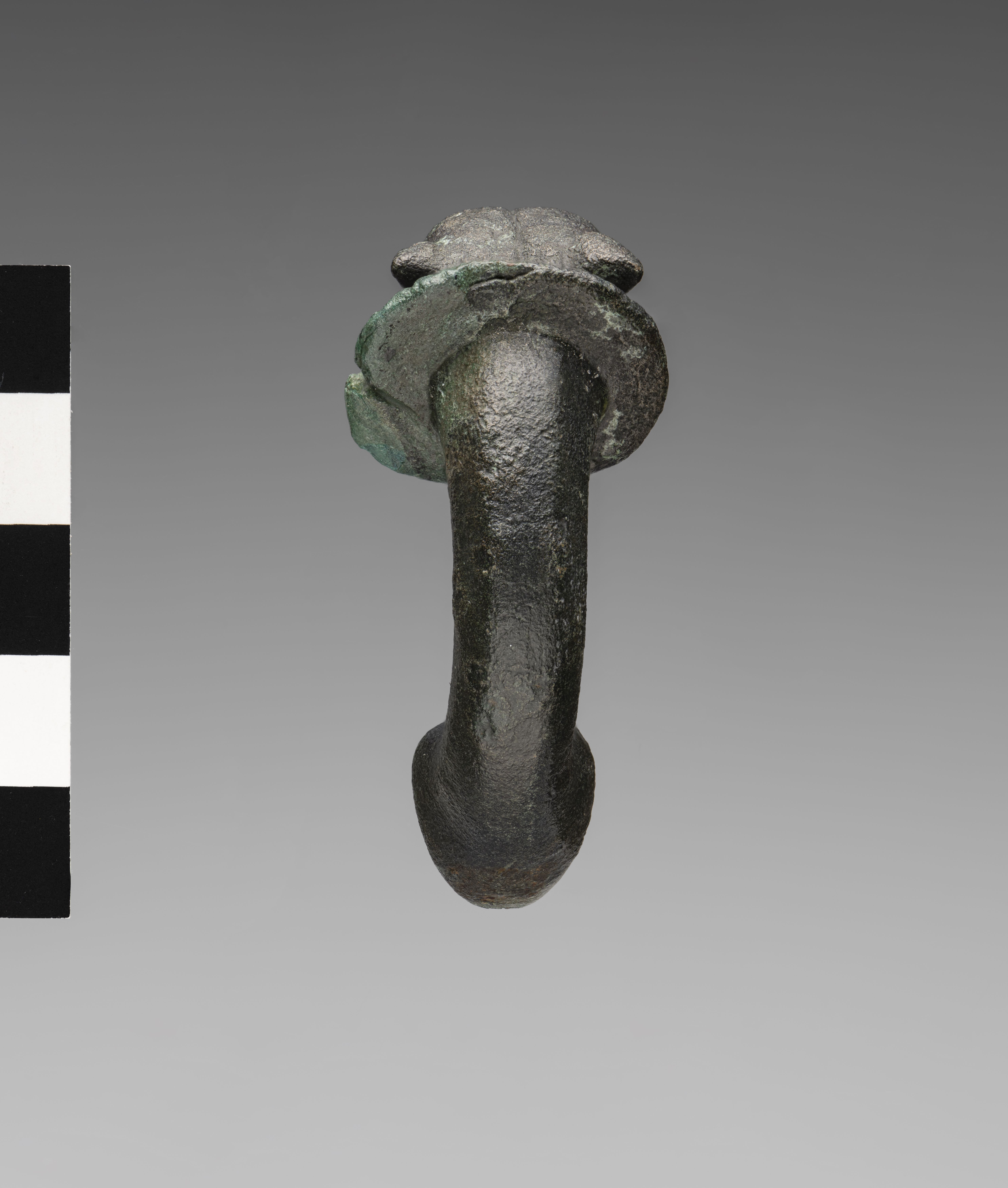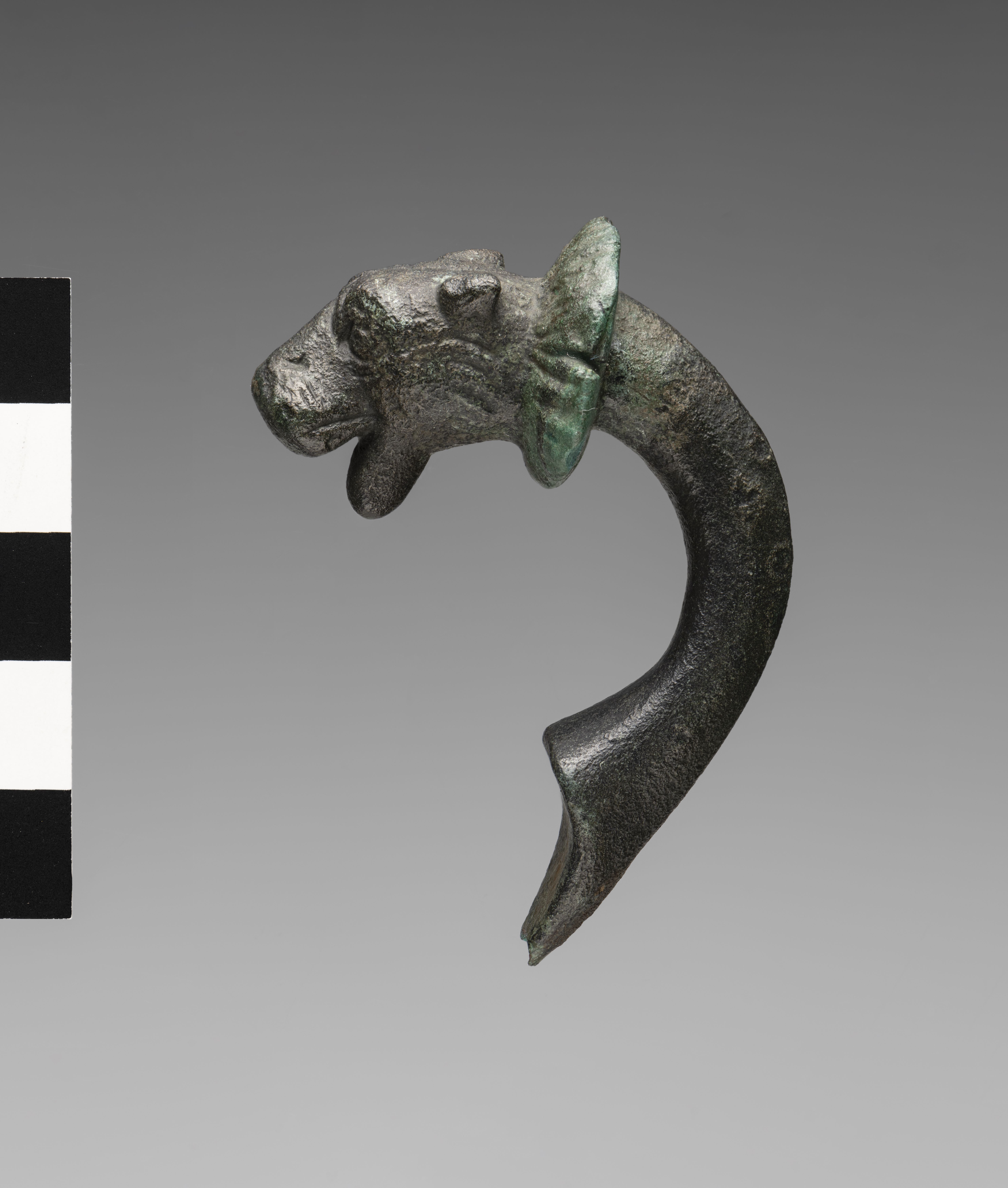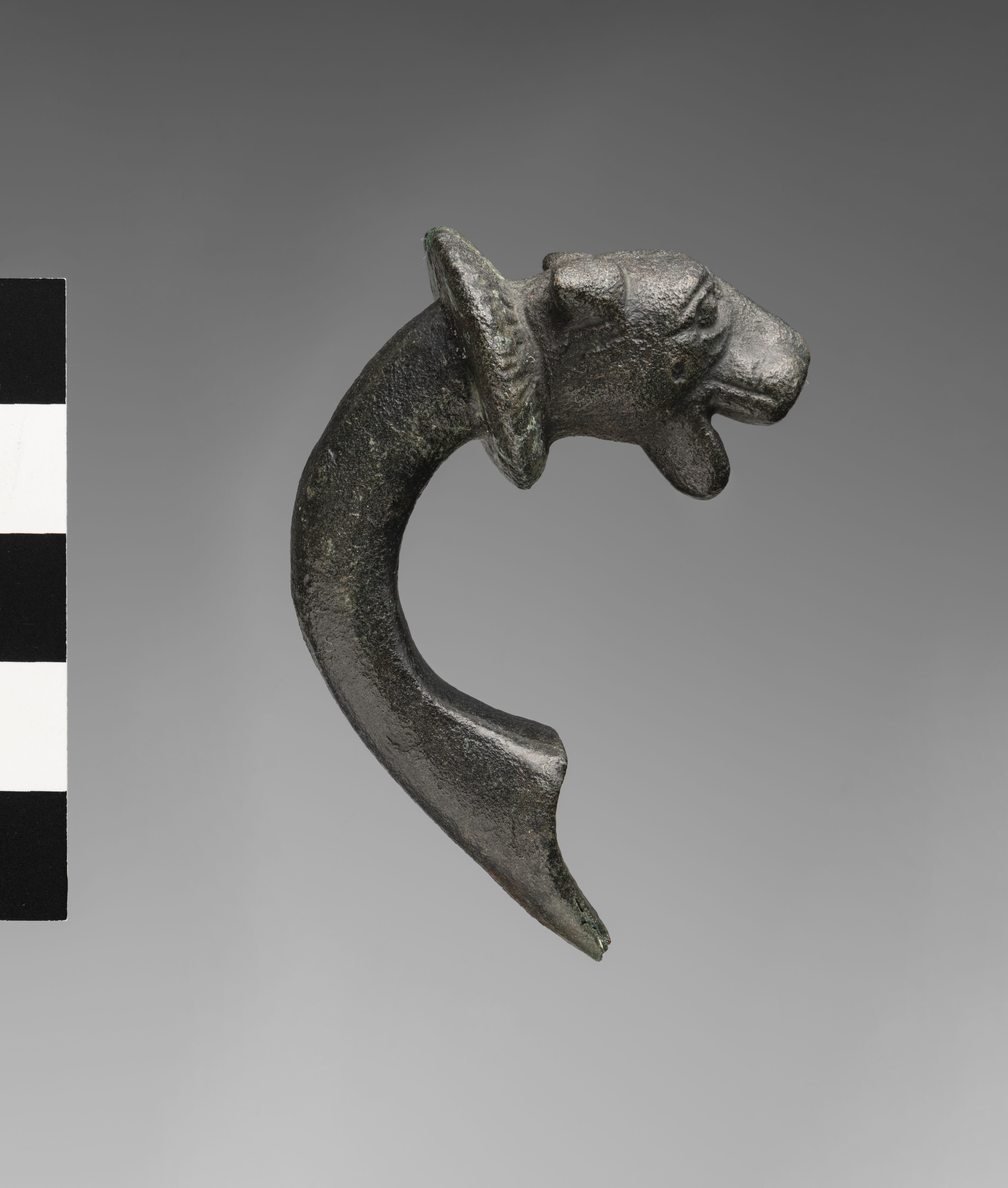 Handle of a lamp terminating in a panther’s head. The ears are modelled; the jaws are wide open and stylised. Behind the panther’s head, the handle ends in a circular element decorated with radiating lines. The tip of the terminal element, intended for attachment to the reservoir of the lamp, is broken. The object is made in the lost-wax technique for solid casts.