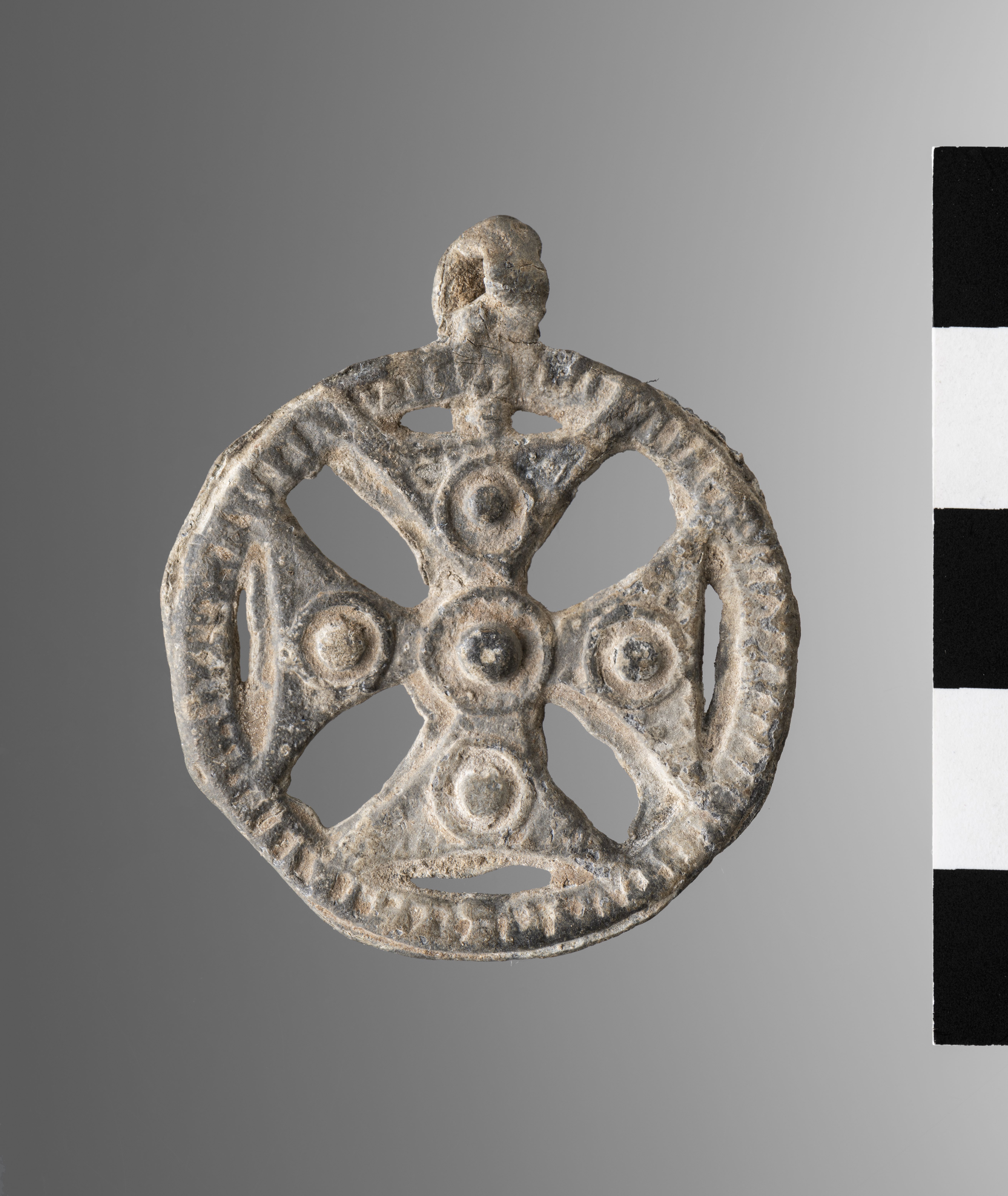 Pendant in the shape of a cross inscribed within a circle. Equipped with a suspension loop. The outer frame is decorated with small notches, while each arm of the cross is adorned with a spherical relief inscribed in a circle, a motif repeated at the centre.