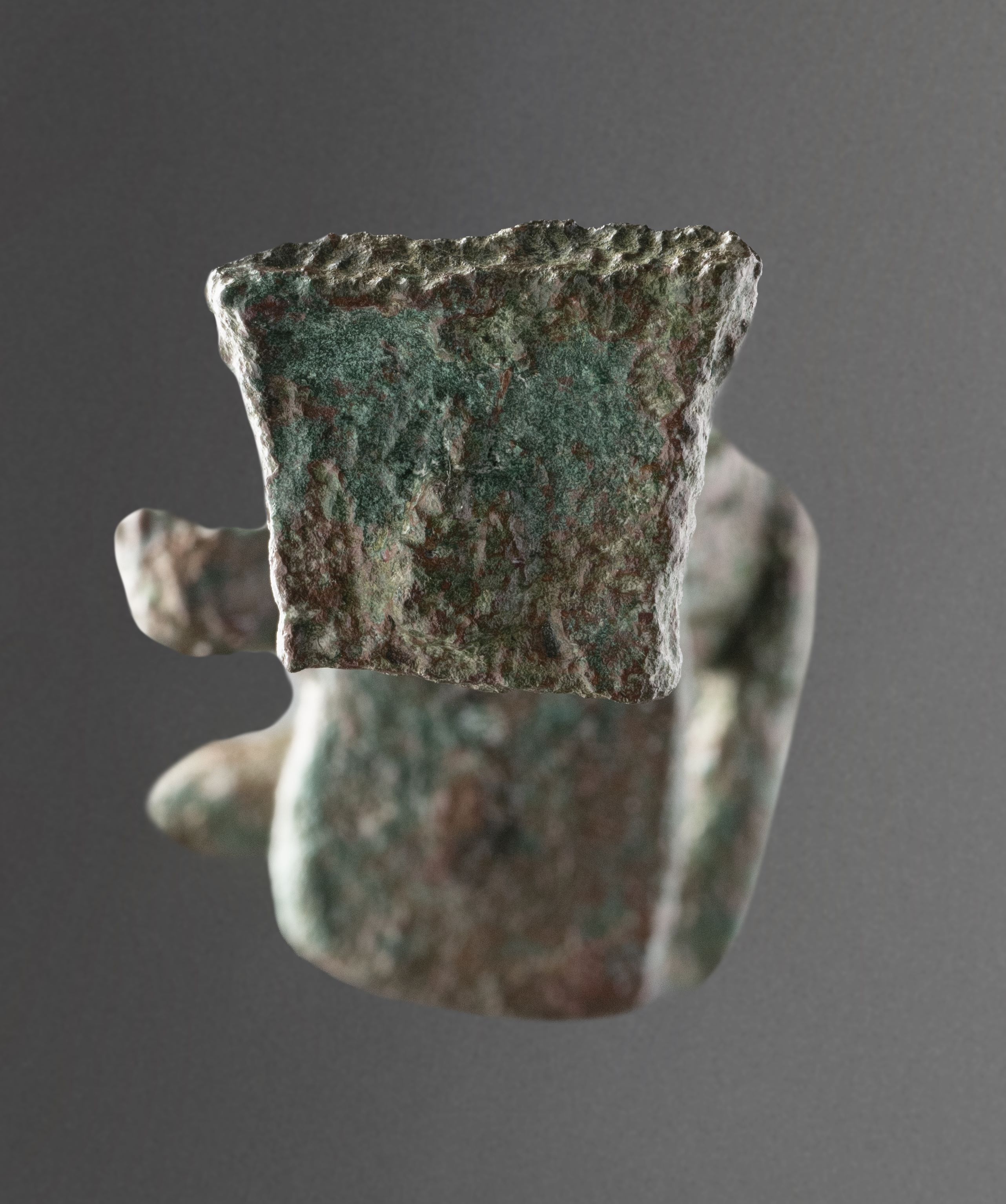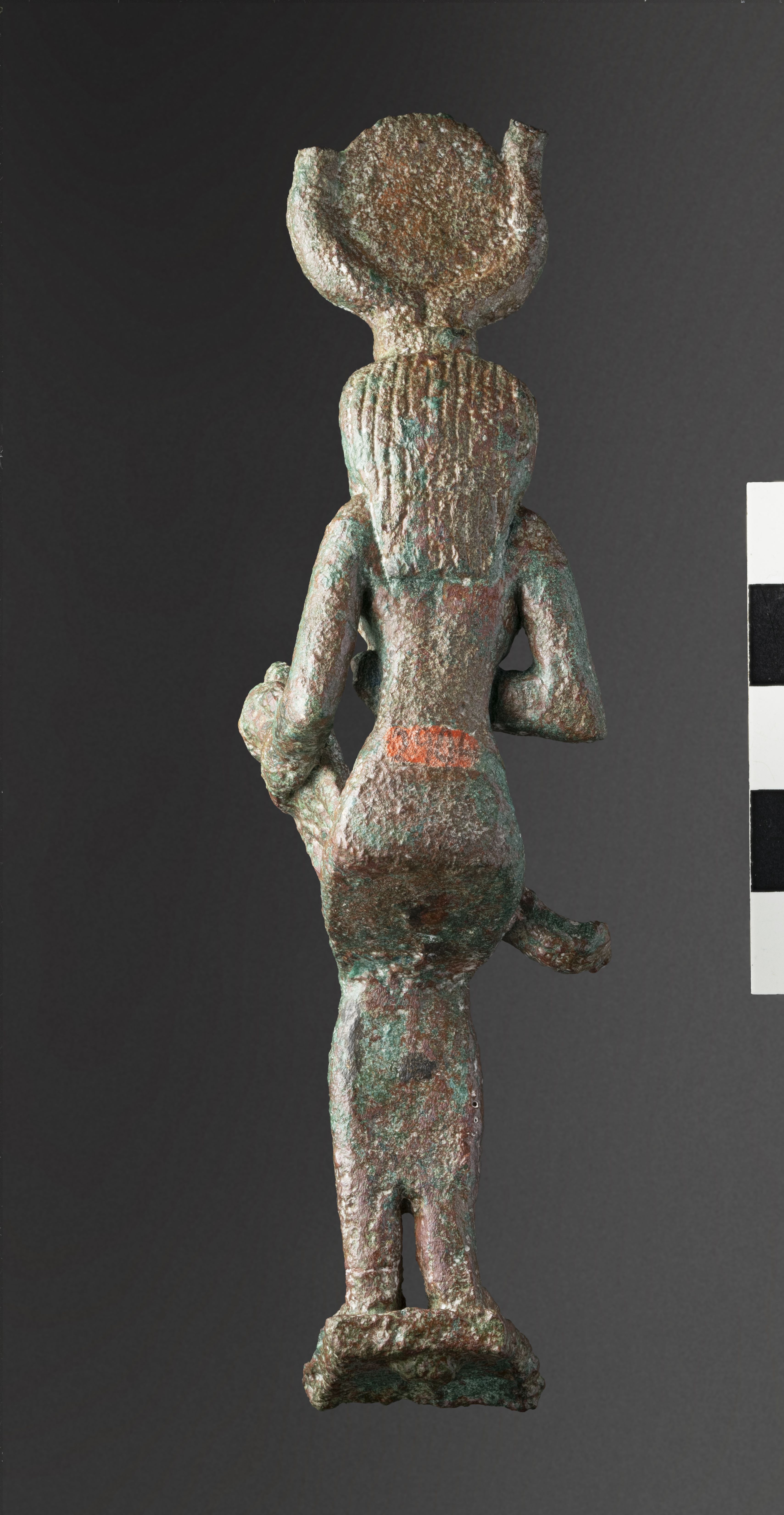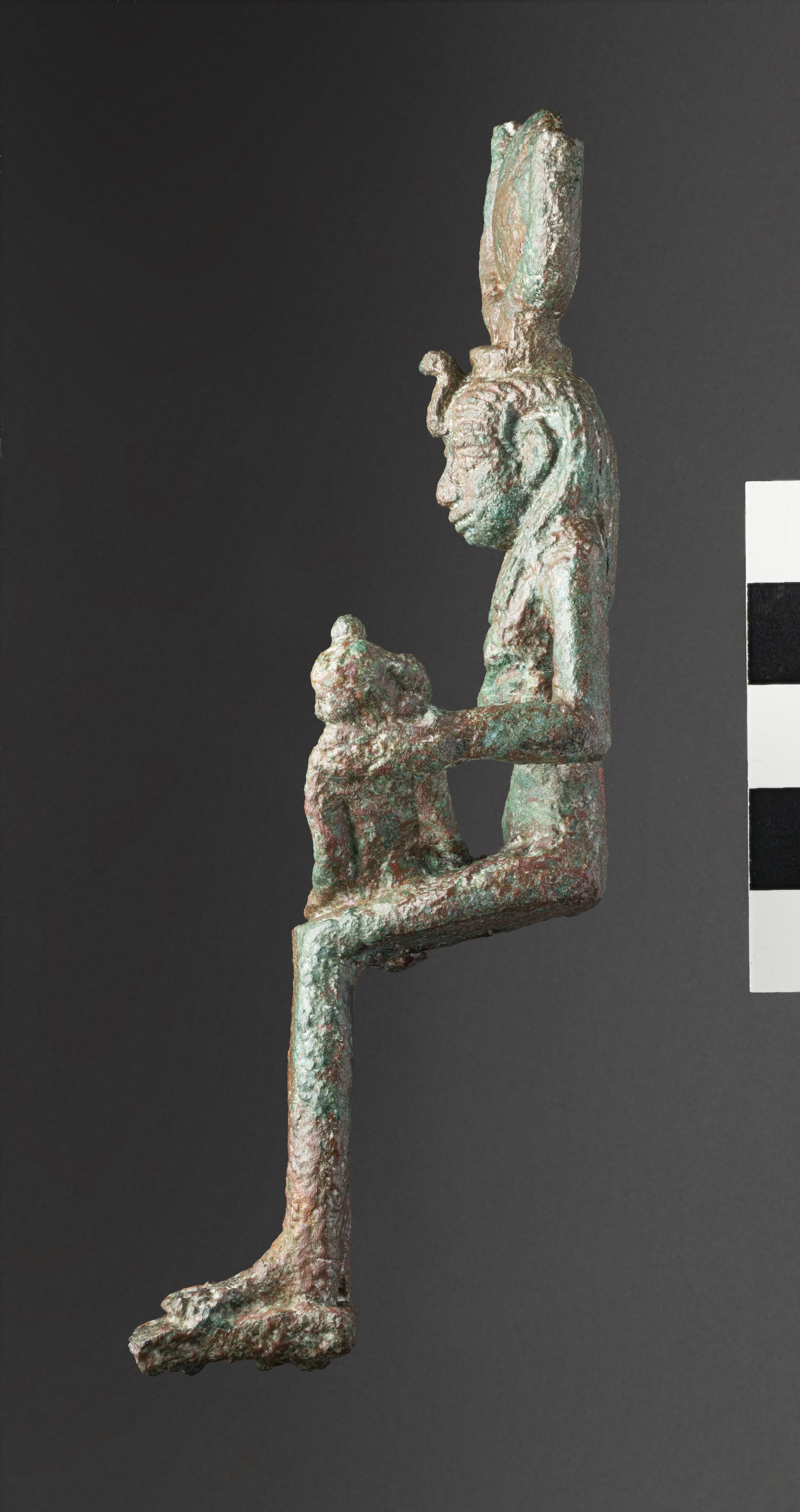 Seated figure of Isis suckling Harpocrates (identifiable with the so-called ‘Isis lactans’ motif). The goddess is wearing a hathoric crown, consisting of a solar disc with horns resting on a modius. The goddess is wearing a tripartite wig decorated with the uraeus. The goddess is wearing a necklace made of two bands and an ankle-length, tight-fitting dress. Isis brings her right hand to her left breast, while her left hand holds Harpocrates’ head. The feet rest on a trapezoidal base. From the base, a broken square tenon projects down. The god Harpocrates is sitting on Isis’ lap. The god is depicted naked, wearing the skullcap decorated with the uraeus and side-lock on the right side of the head, which ends with a curl on the right shoulder. Harpocrates has his arms at sides with hands open, the palms facing down. The legs are together, separated by a groove. The object is made in the lost-wax technique for solid casts.