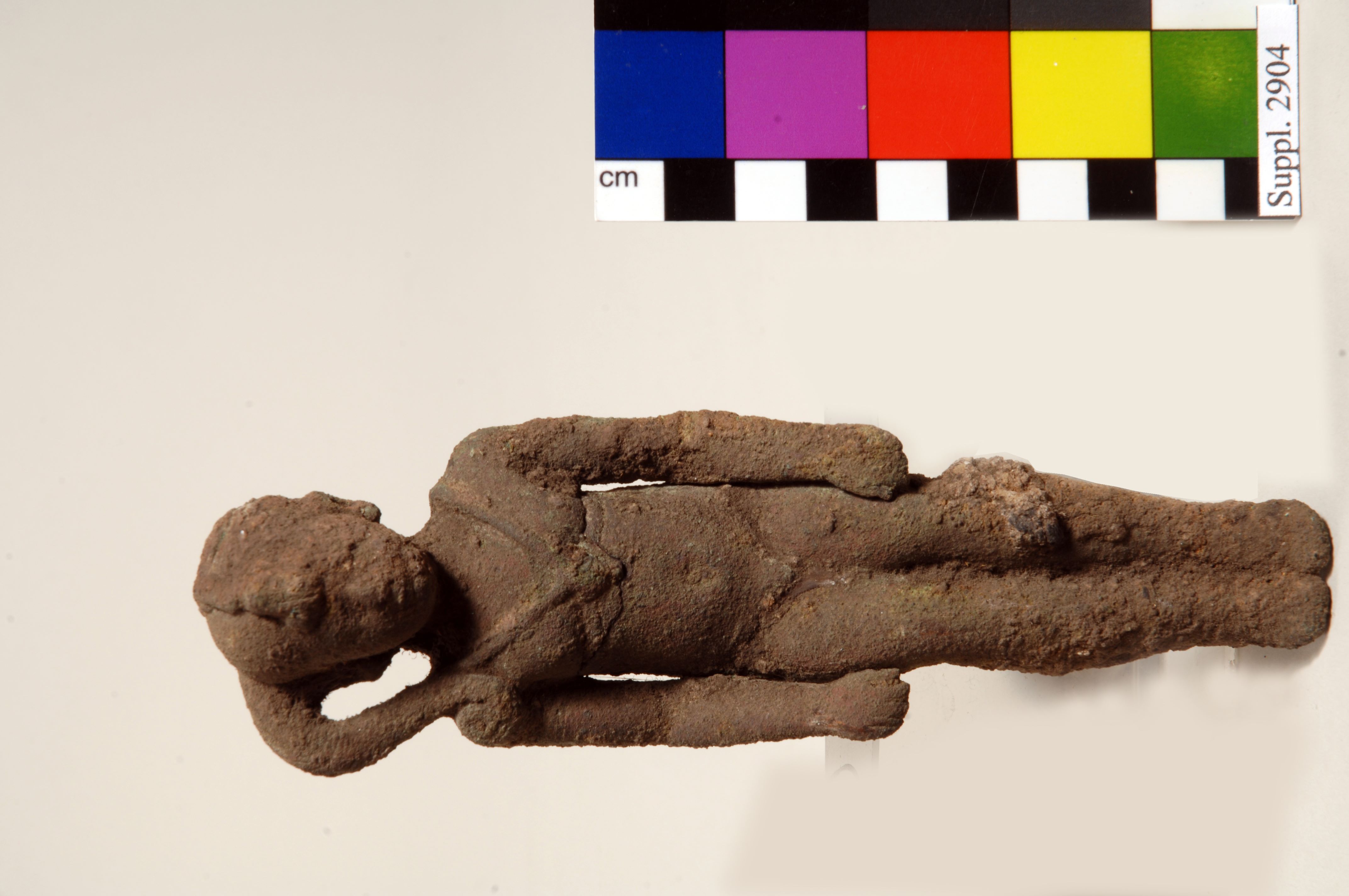 Seated, naked figure of Harpocrates. The god has a skullcap decorated with a uraeus. On the left side of the skullcap, there is a break in the bronze surface, from which the casting core – of a light grey colour – is visible. On the right side of the skullcap, there is a plaited side-lock, which ends with a curl on the right shoulder. The ears are pierced, probably for earrings. Harpocrates has a long necklace, tied at the back, with a heart (Gardiner F34) as pendant. The god has his arms, adorned with decorated armlets, at sides with hands open, the palms facing down. The legs are together, parting at the knees and ankles. The muscles of the legs are indicated. The object is made in the lost-wax technique for hollow casts.
