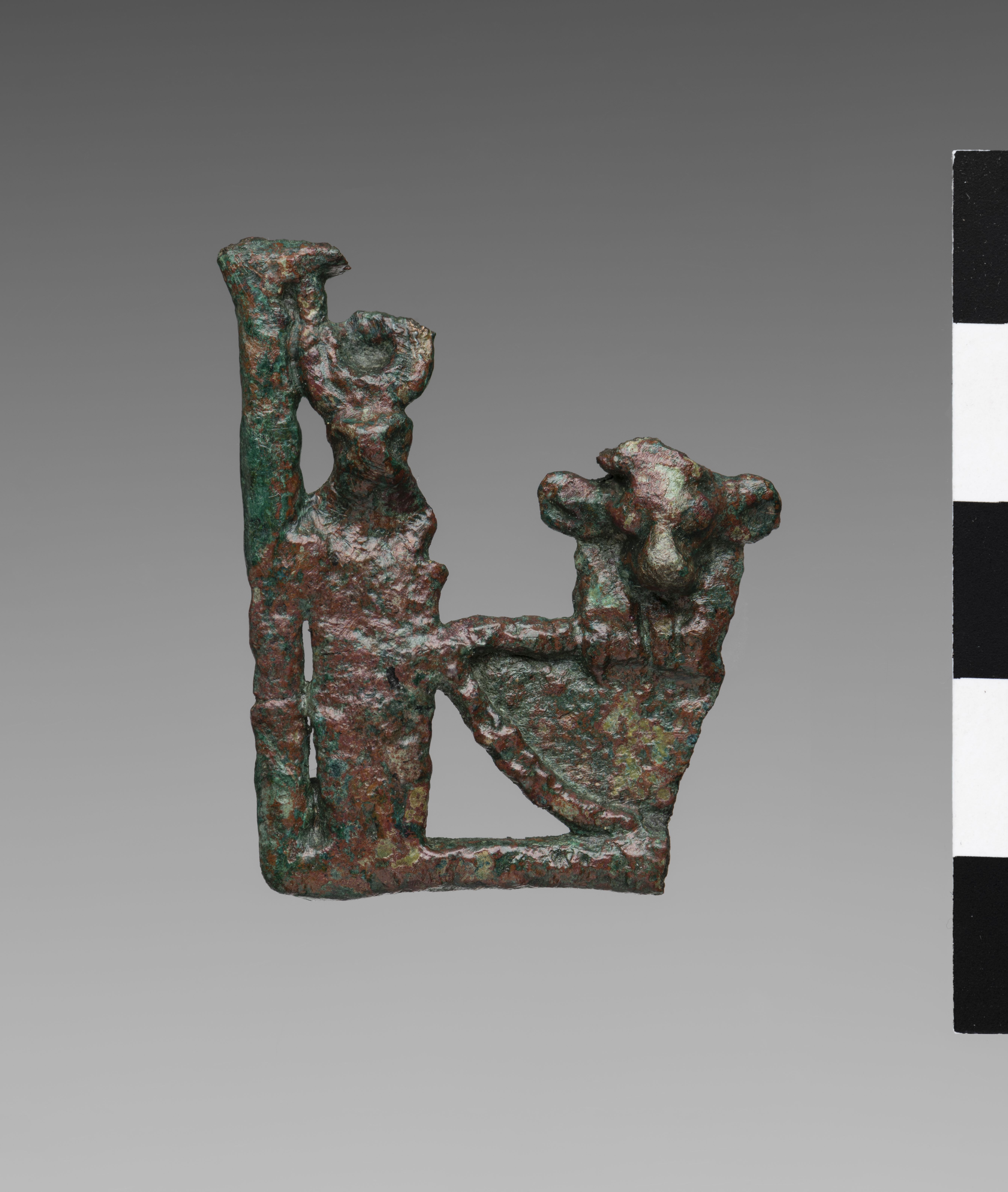 Fragment of a decorative plaque with uraeus and aegis with bull's head, probably identifiable as Mnevis given its provenance from Heliopolis. The plaque consists of a thin frame, on the side, a uraeus is represented, with indicated eyes, and crowned by a solar disc, recessed for the now-missing inlays. Next to the uraeus, there is an aegis with a bull's head. The aegis is recessed, perhaps for the inlay. The bull appears to wear a wig. On the back, at the corner, there is a suspension loop. The object is made in the lost-wax technique for solid casts.