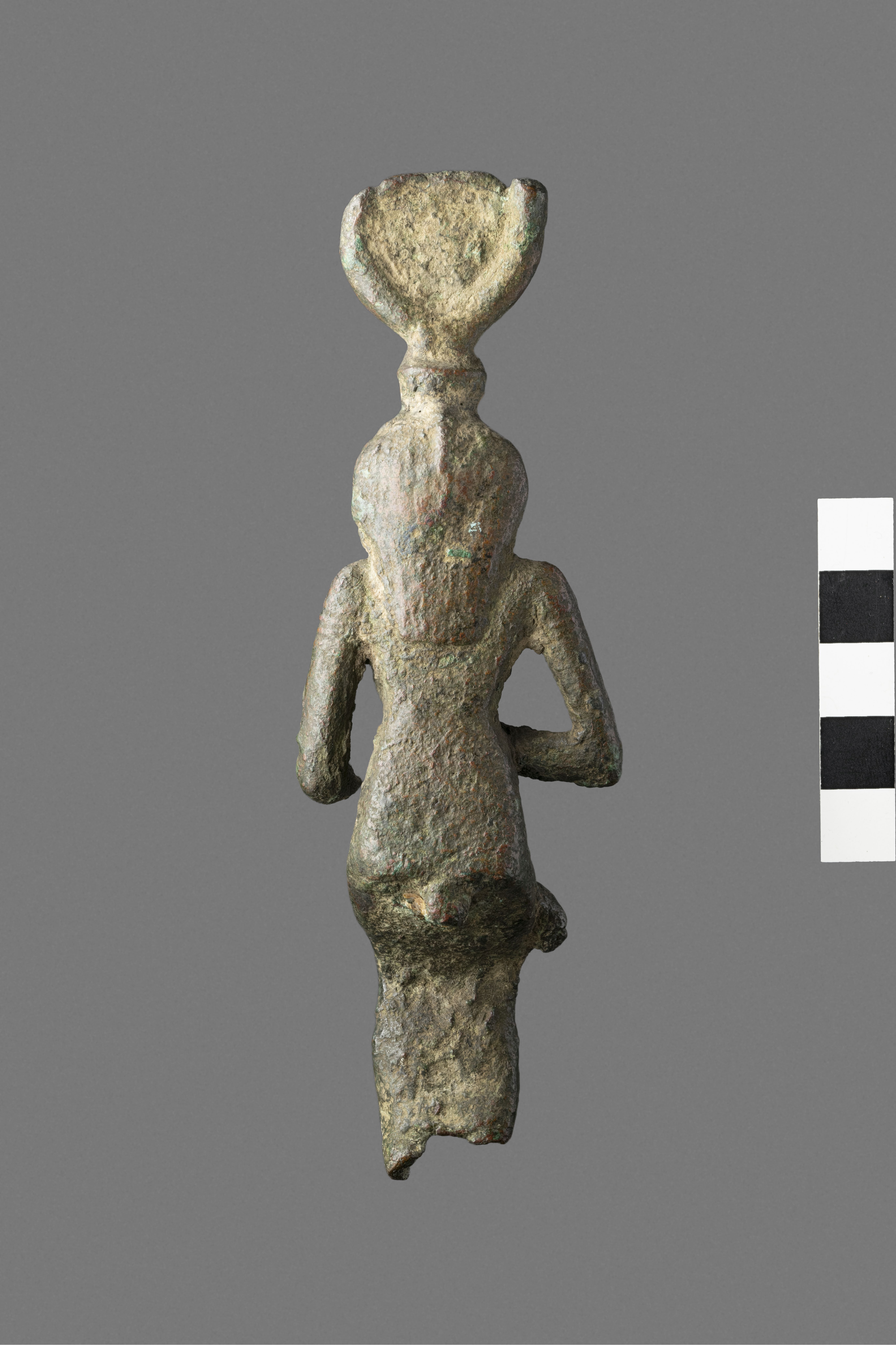 Seated figure of Isis suckling Harpocrates (identifiable with the so-called ‘Isis lactans’ motif). The goddess is wearing a hathoric crown, consisting of a solar disc with horns resting on a modius. The goddess is wearing a tripartite wig decorated with the uraeus. Isis brings her right hand to her left breast while her left hand holds Harpocrates’ head. A broken tenon is present under the buttocks. The god Harpocrates is sitting on Isis’ lap. The god is depicted naked. Most of the figure is missing; only the belly, thighs and lower part of the arms are present. Harpocrates has his arms at sides and the legs are together. The object is made in the lost-wax technique for solid casts.
