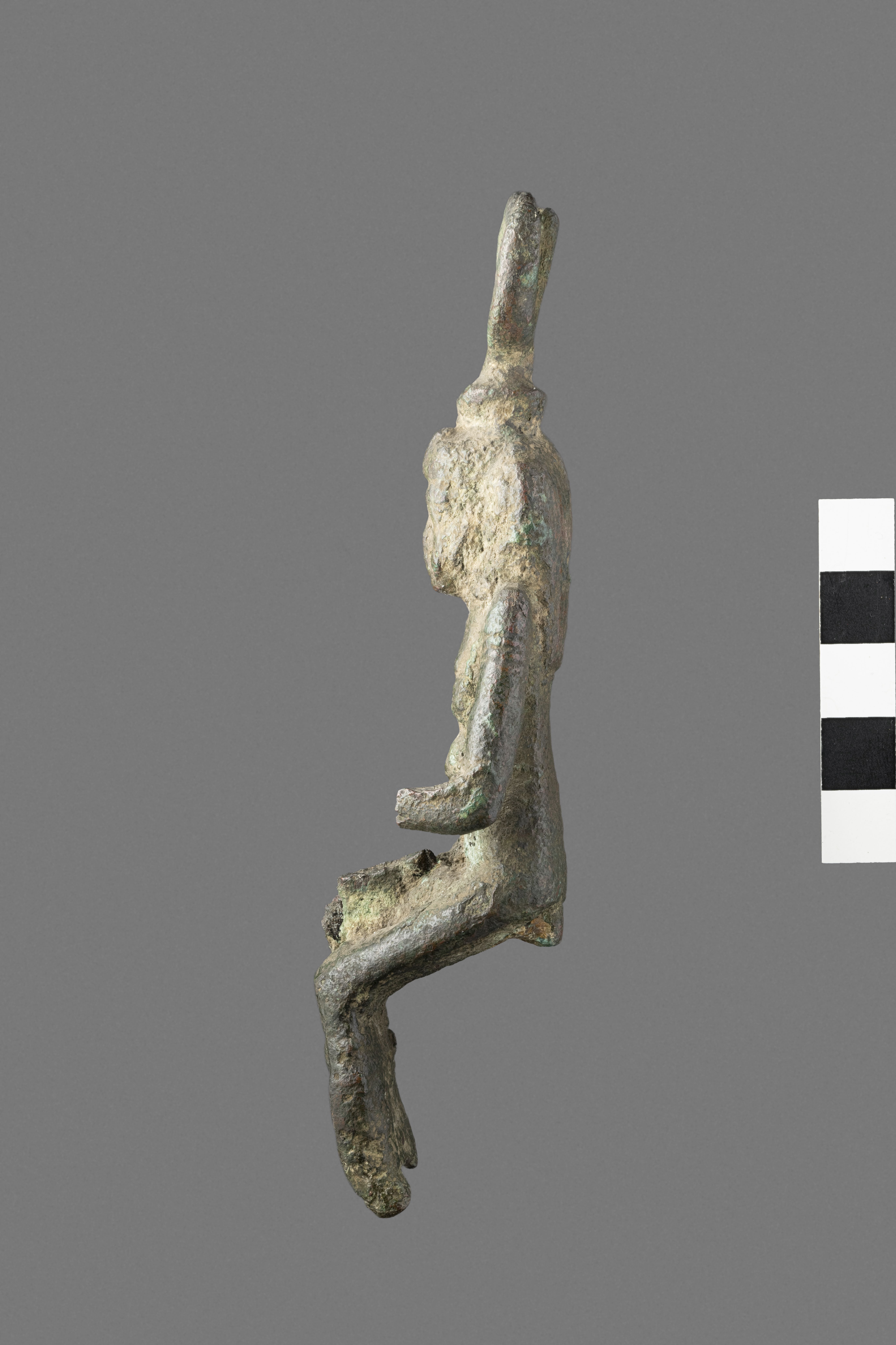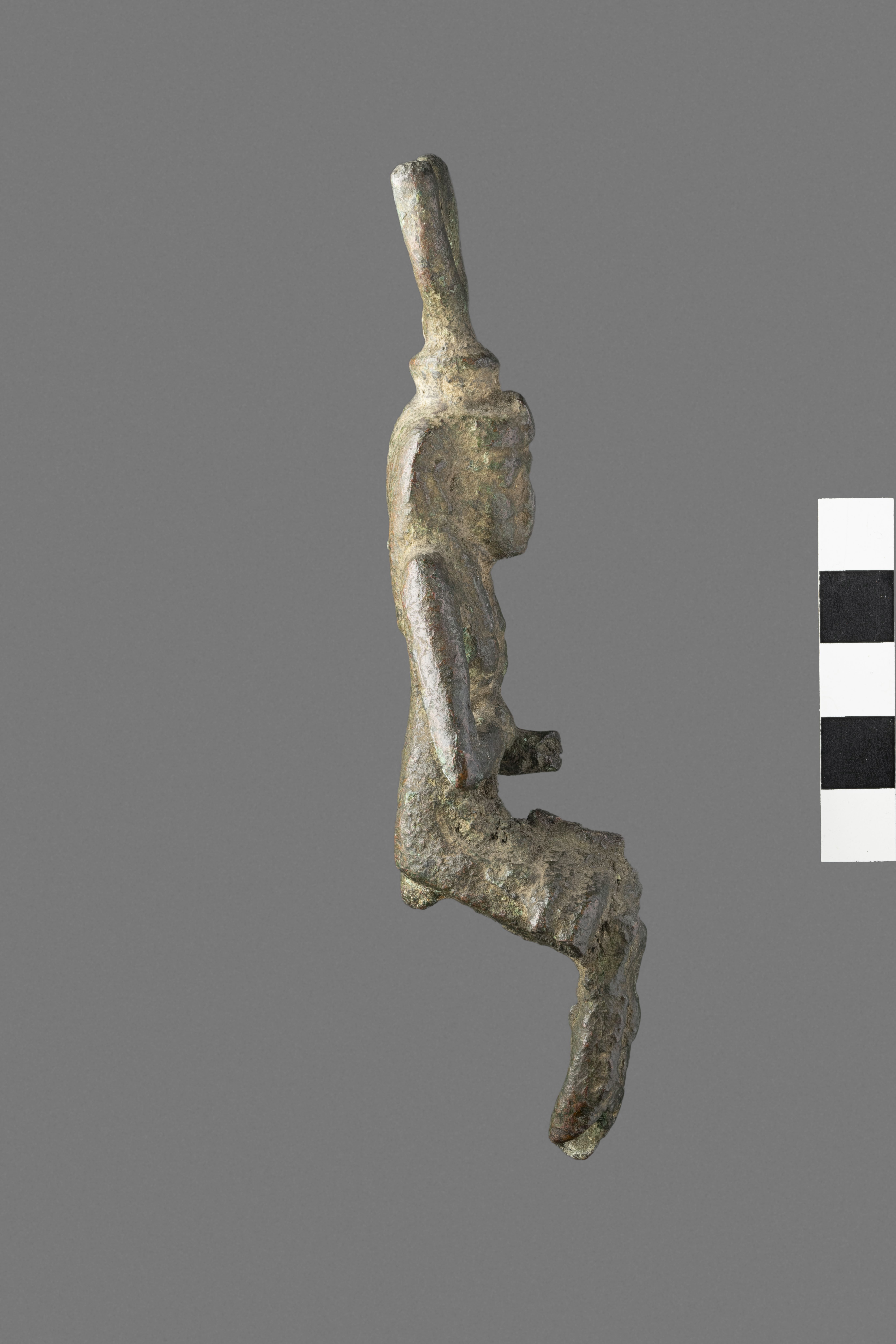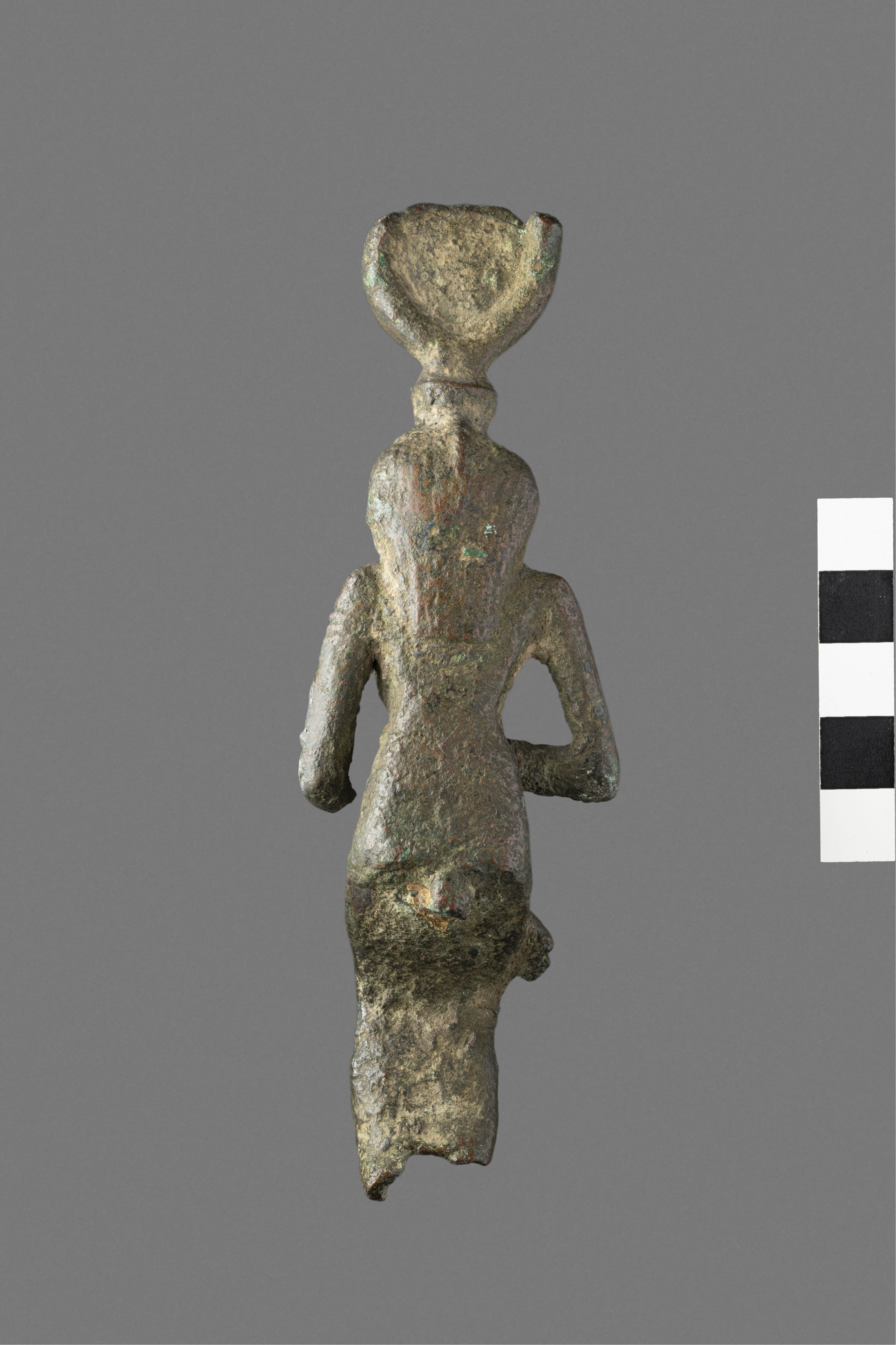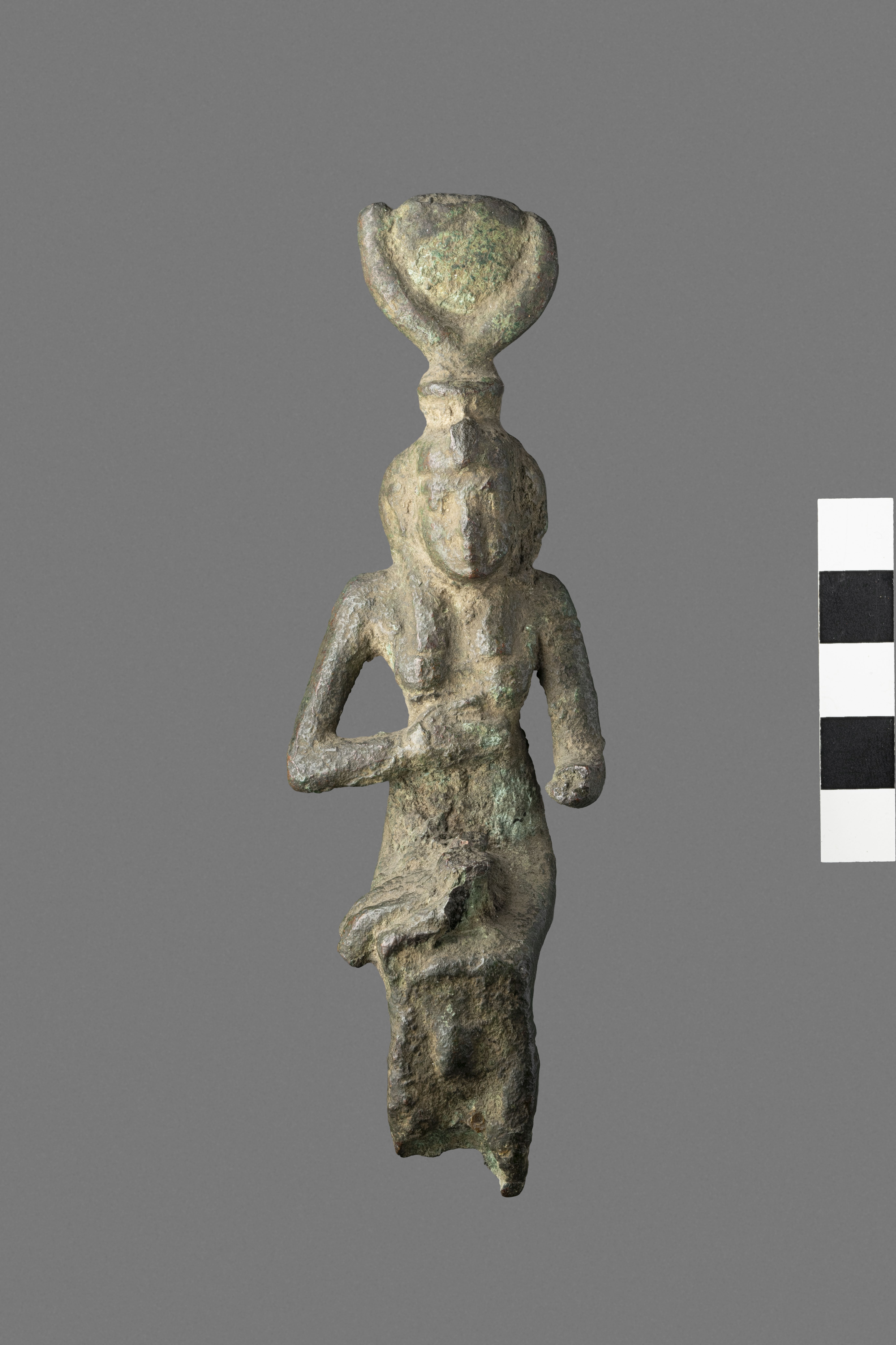 Seated figure of Isis suckling Harpocrates (identifiable with the so-called ‘Isis lactans’ motif). The goddess is wearing a hathoric crown, consisting of a solar disc with horns resting on a modius. The goddess is wearing a tripartite wig decorated with the uraeus. Isis brings her right hand to her left breast while her left hand holds Harpocrates’ head. A broken tenon is present under the buttocks. The god Harpocrates is sitting on Isis’ lap. The god is depicted naked. Most of the figure is missing; only the belly, thighs and lower part of the arms are present. Harpocrates has his arms at sides and the legs are together. The object is made in the lost-wax technique for solid casts.