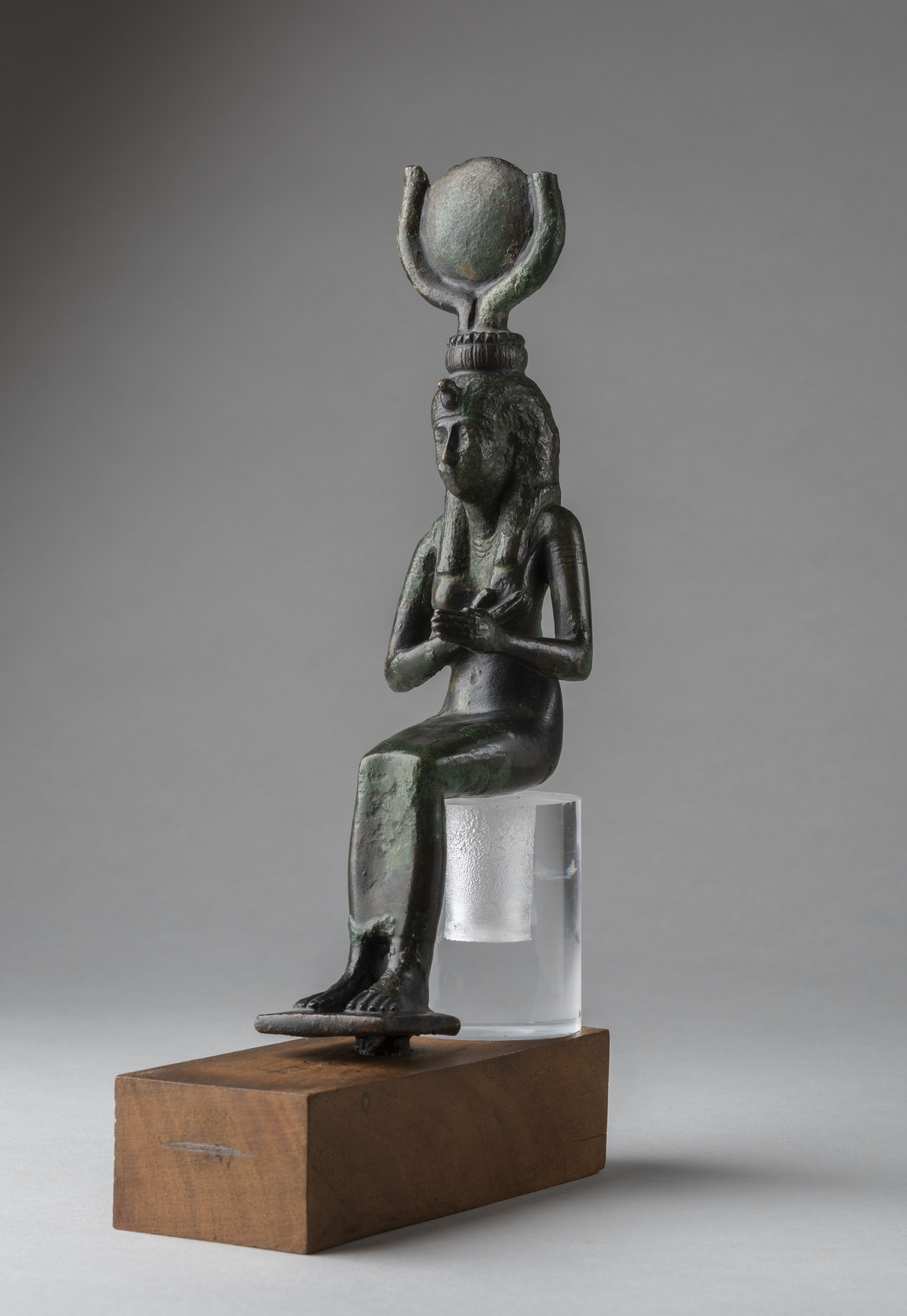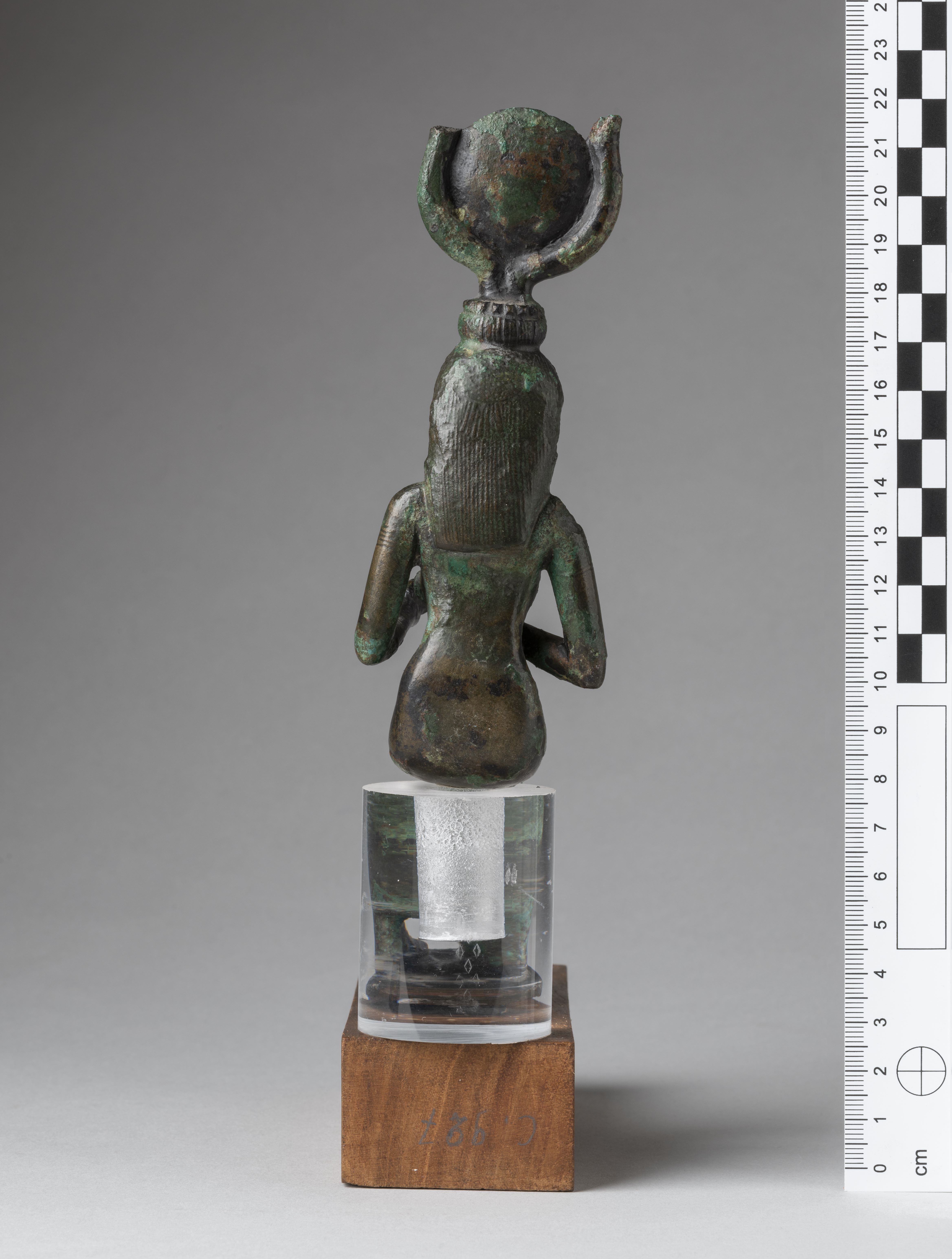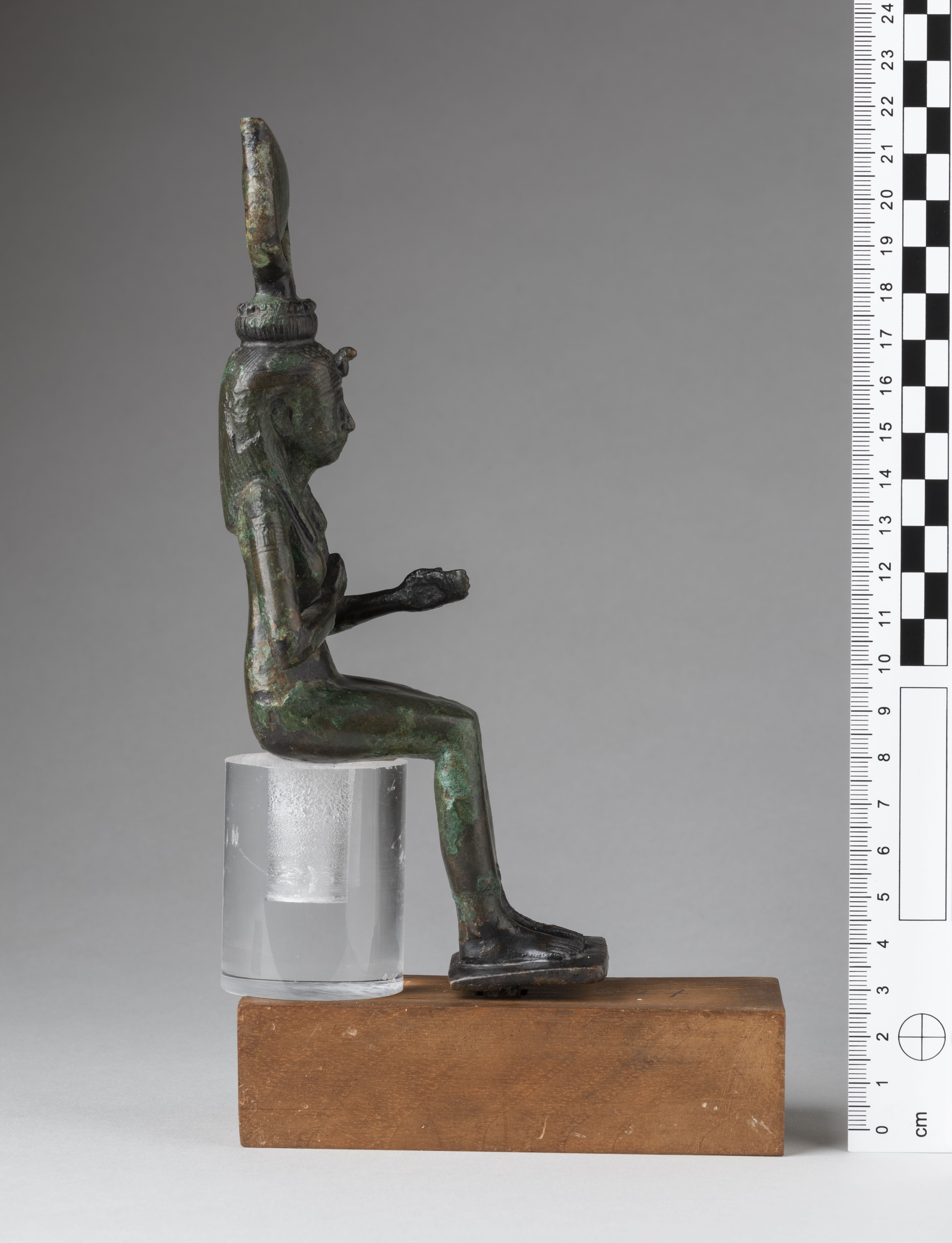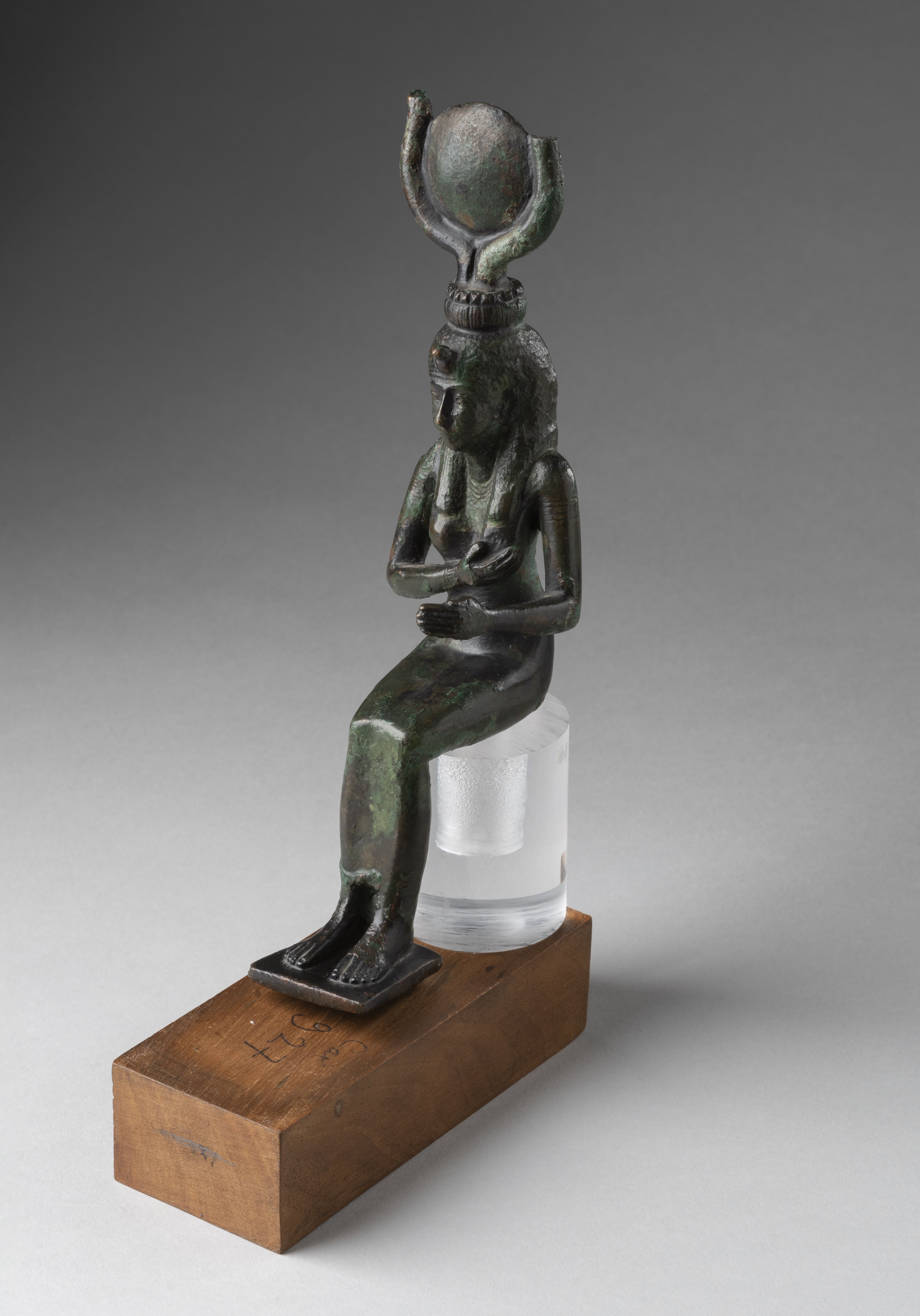 Seated figure of Isis suckling Harpocrates (identifiable with the so-called ‘Isis lactans’ motif). The goddess wears a Hathoric crown composed of a solar disc between cow horns, resting on a stylized uraeiform modius. She wears a tripartite wig decorated with vertical lines and adorned with a vulture headdress. The goddess wears a collar composed of three registers, she also has bracelets and armlets, and wears an ankle-length, tight-fitting garment. Isis brings her right hand to her left breast, while with her left hand she held the head of Harpocrates, whose figure is missing. The feet rest on a trapezoidal base, from which a rectangular-section tenon, cut with pliers, projects down. The object is made in the lost-wax technique for solid casts.
