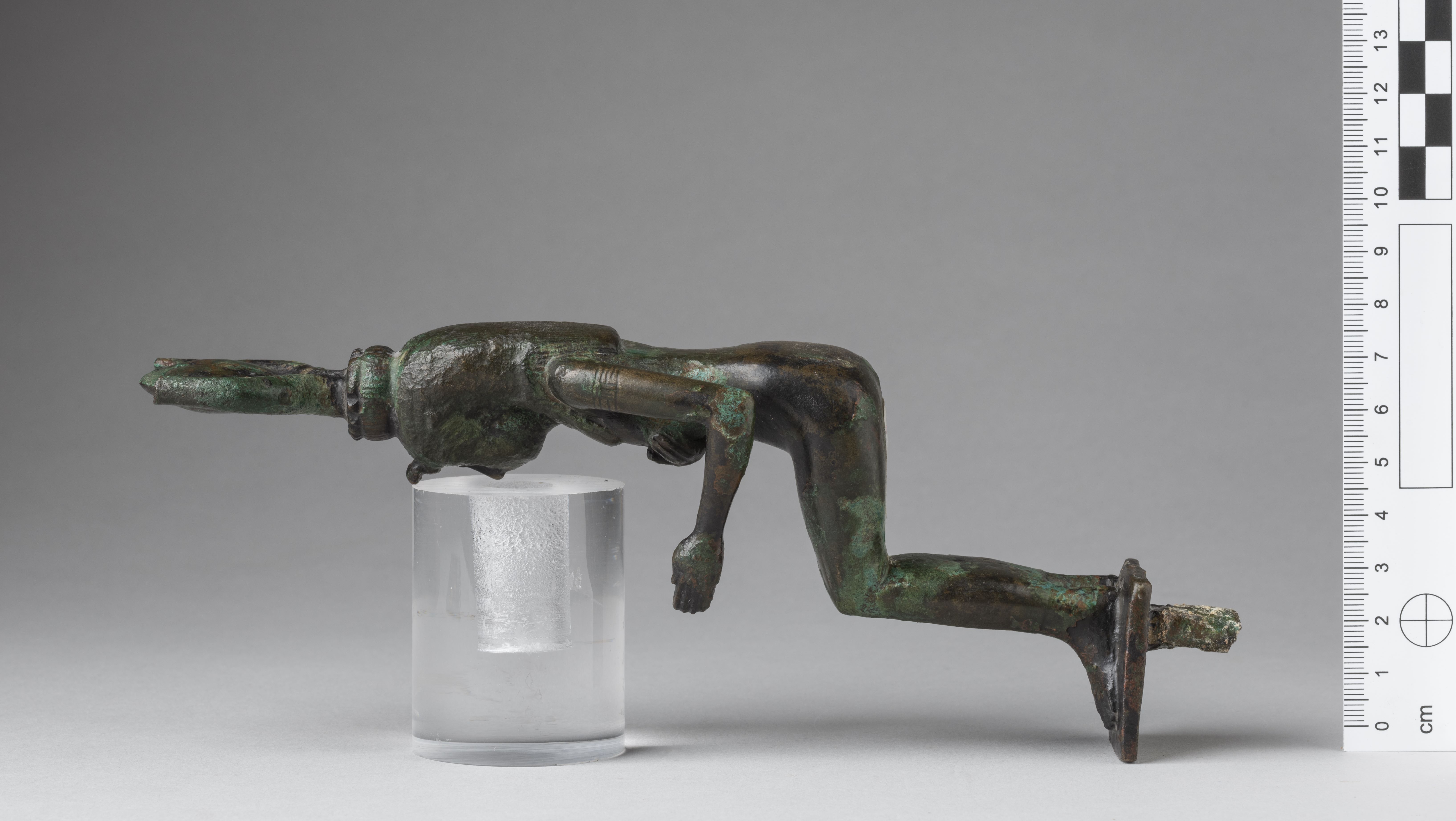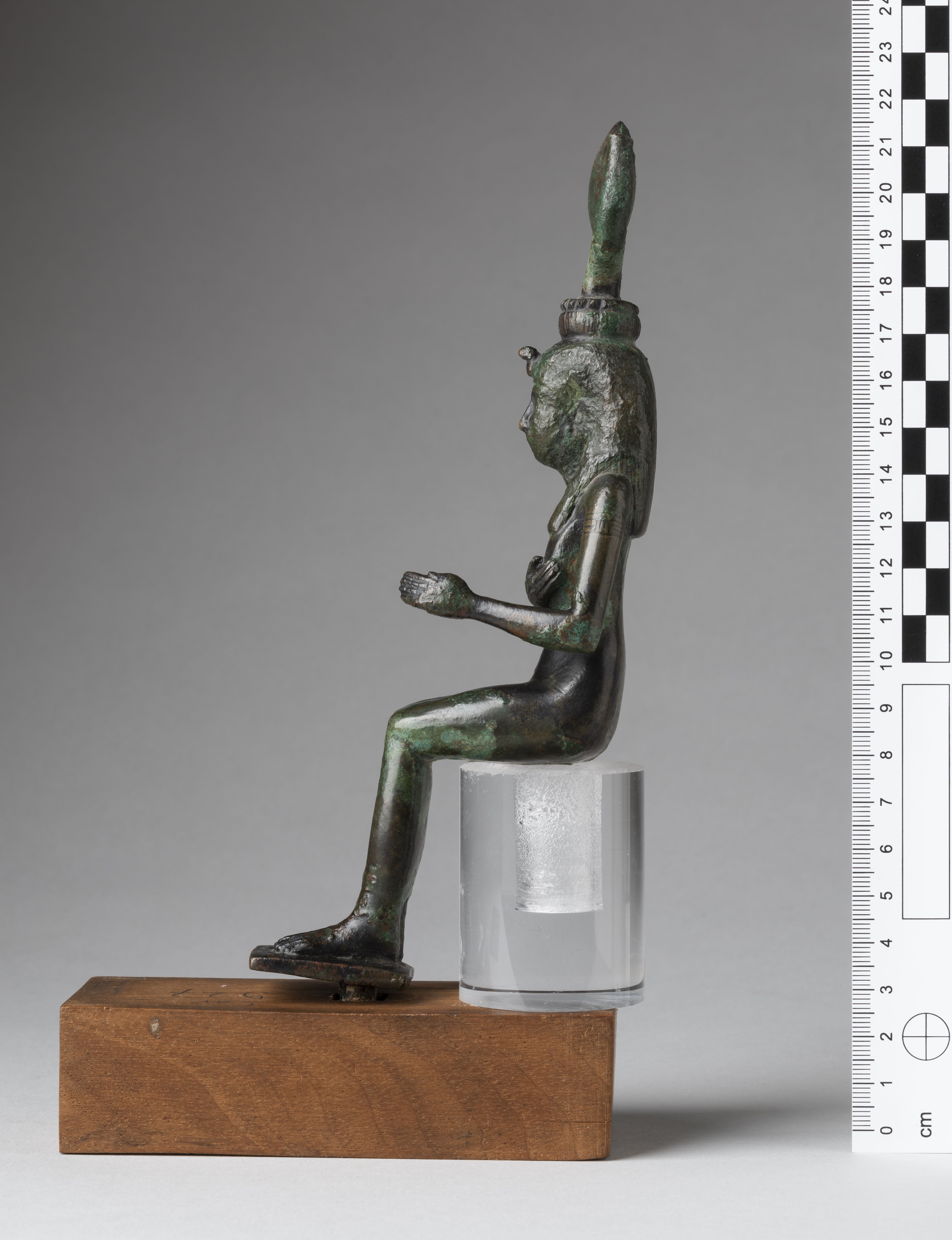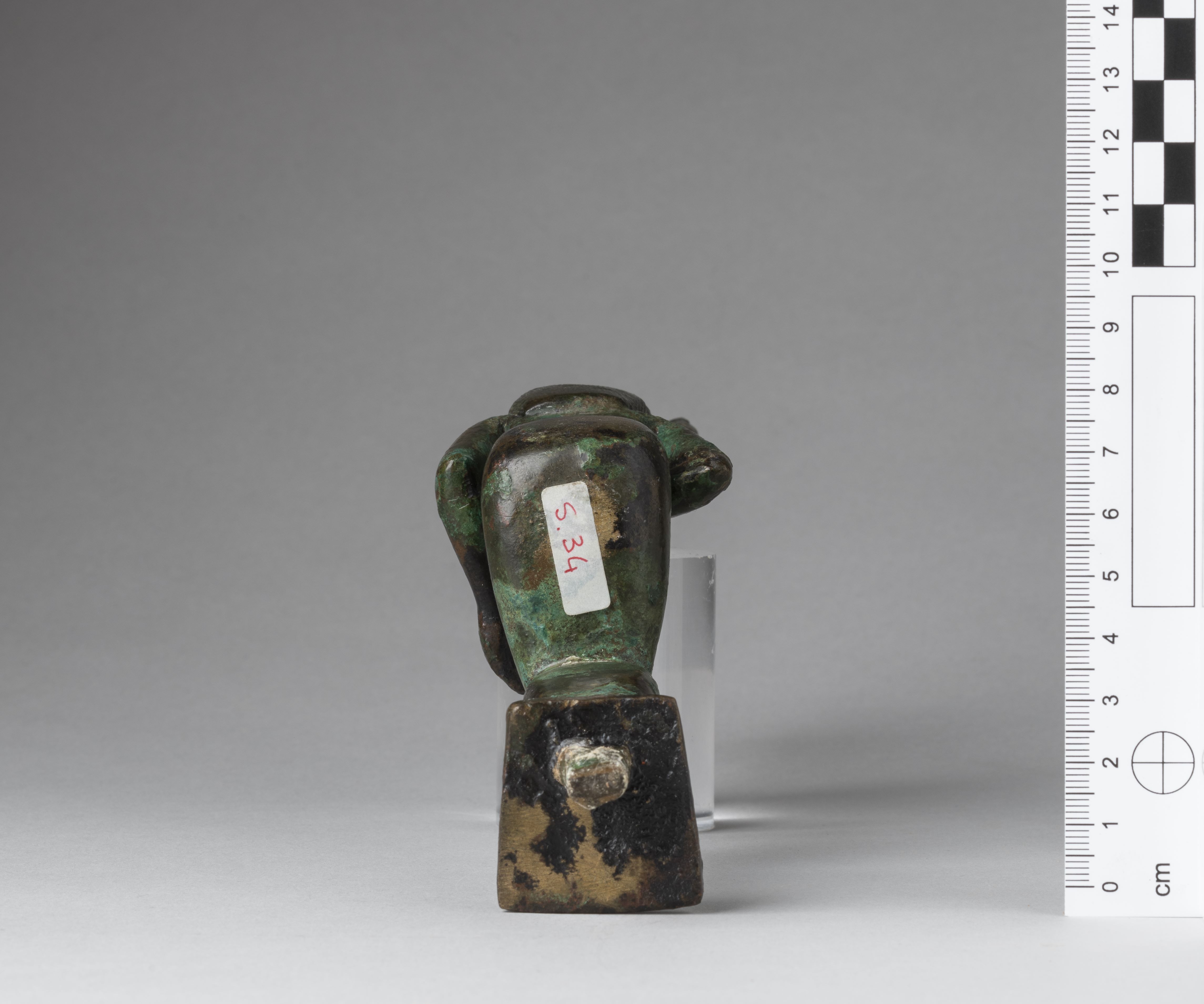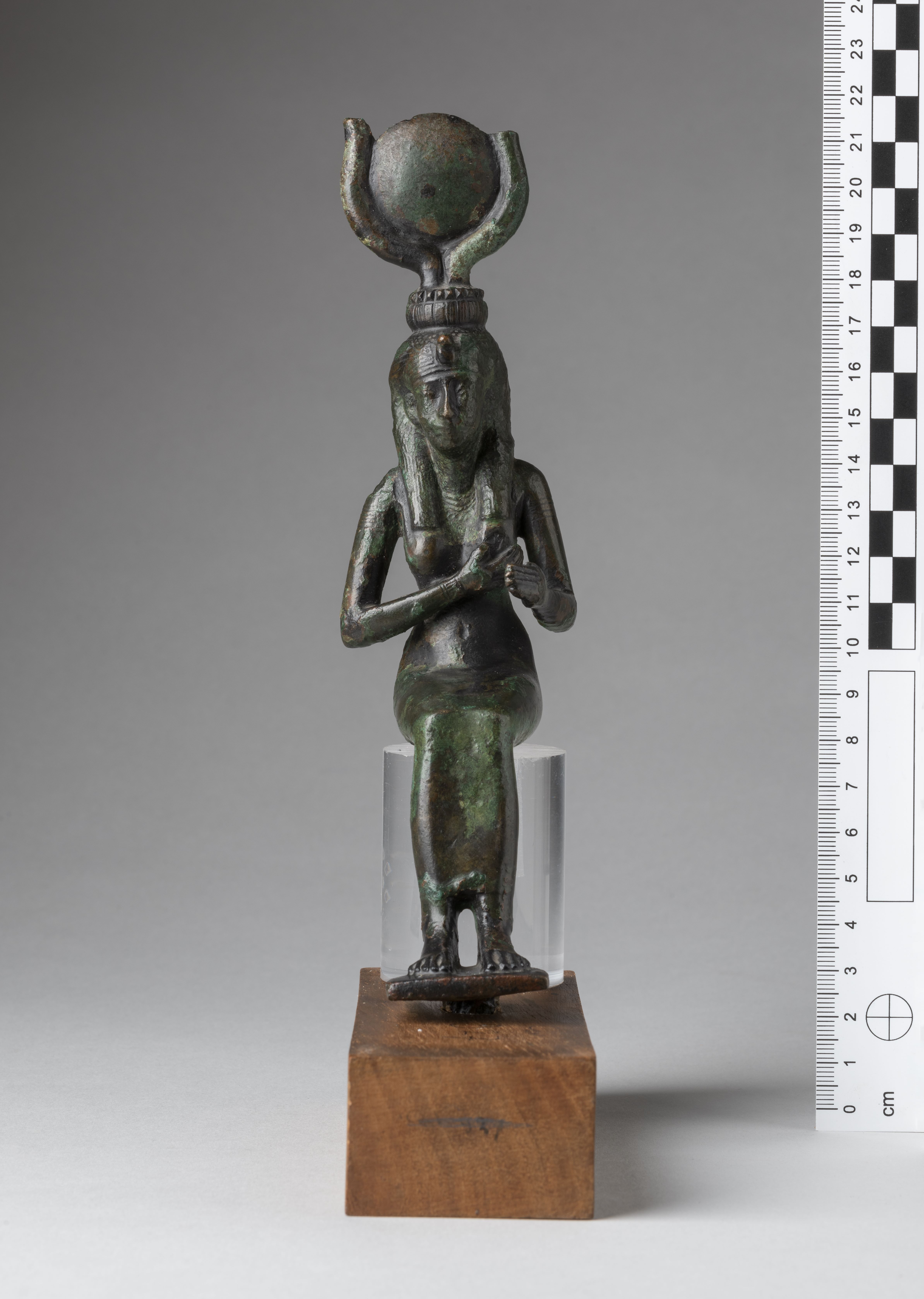 Seated figure of Isis suckling Harpocrates (identifiable with the so-called ‘Isis lactans’ motif). The goddess wears a Hathoric crown composed of a solar disc between cow horns, resting on a stylized uraeiform modius. She wears a tripartite wig decorated with vertical lines and adorned with a vulture headdress. The goddess wears a collar composed of three registers, she also has bracelets and armlets, and wears an ankle-length, tight-fitting garment. Isis brings her right hand to her left breast, while with her left hand she held the head of Harpocrates, whose figure is missing. The feet rest on a trapezoidal base, from which a rectangular-section tenon, cut with pliers, projects down. The object is made in the lost-wax technique for solid casts.
