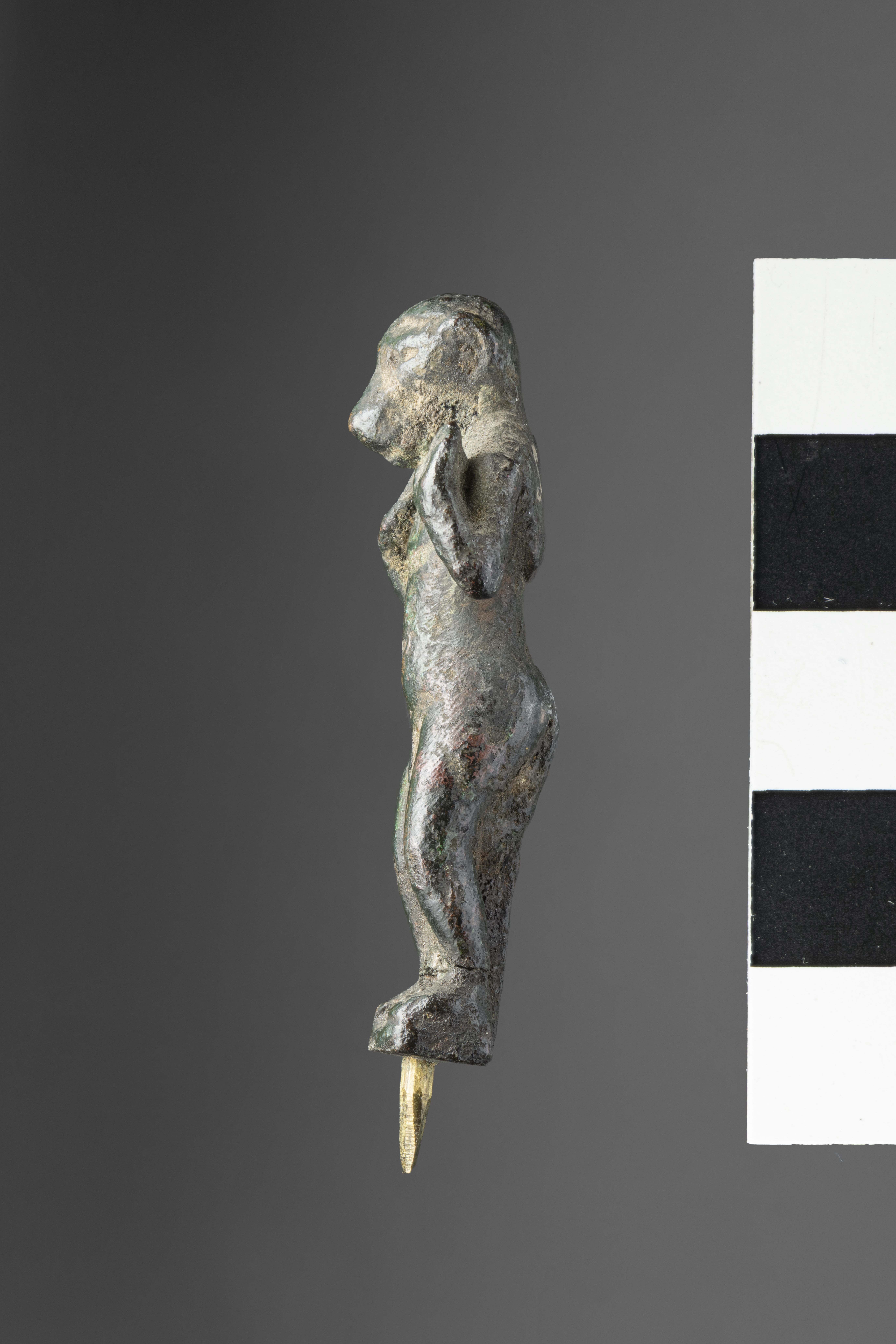 Figure of a standing cynocephalus in an attitude of worship. The head is round, the ears are modelled, and the eyes are barely visible. The muzzle protrudes downwards, the nose is slightly prominent, and the mouth is depicted as a horizontal line. The mantle is in relief both at the front and back compared to the rest of the torso. The arms are bent, with the hands raised in a sign of worship, The legs are slightly bent and separated by a groove, with the feet resting on a shaped base which connects them. A modern brass pin was inserted in the base. The object is made in the lost-wax technique for solid casts.