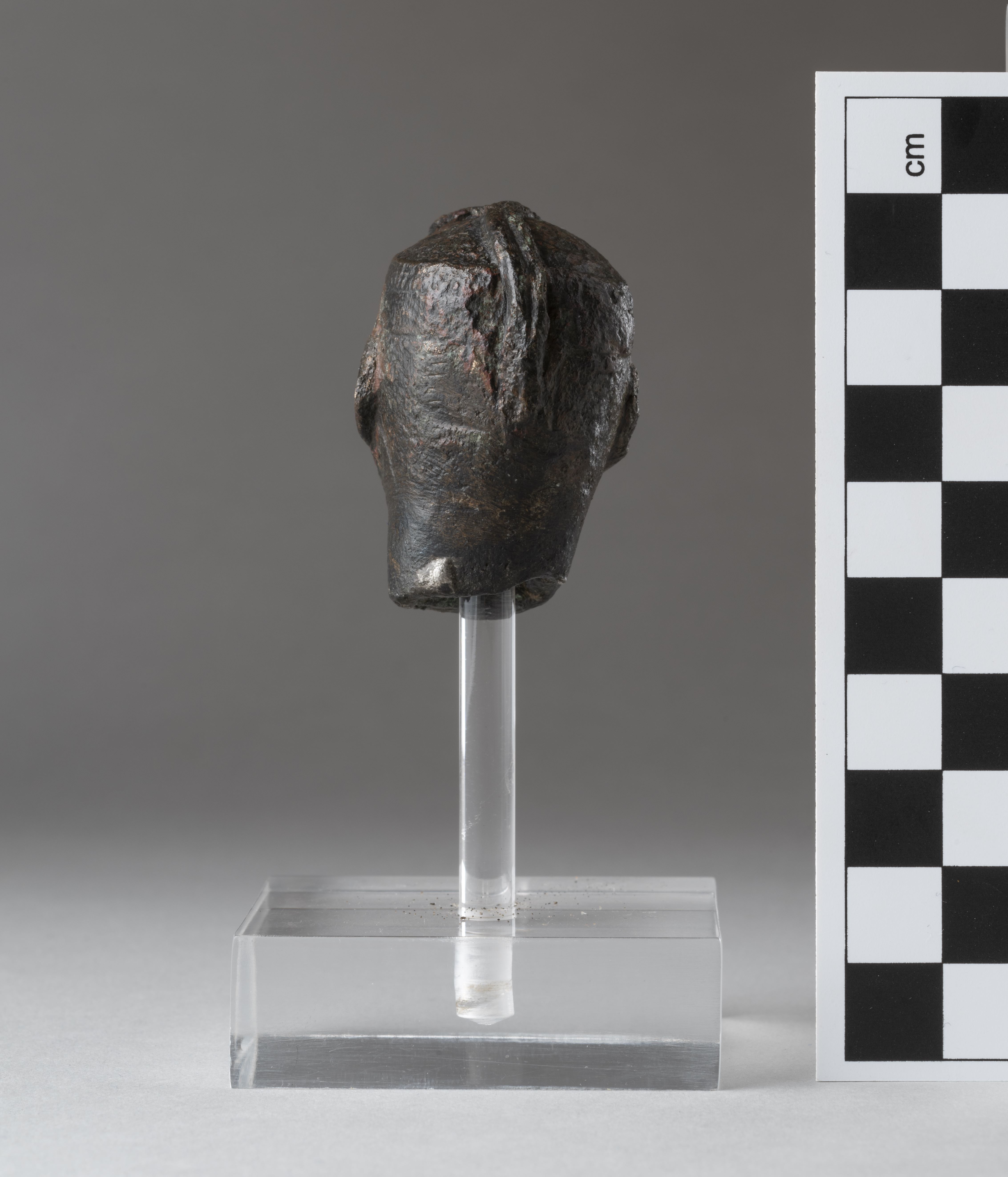 Testa di statuetta raffigurante il re nubiano Shabaka. Sulla testa indossa la takia, decorata dai tipici due urei, le cui teste sono mancanti. Il viso è tondo, gli occhi si intravedono perché la superficie è rovinata. Il naso è ampio e la bocca ha le labbra carnose. Le orecchie sono modellate. Il collo è massiccio, il bordo inferiore è irregolare. All’interno della testa si vedono i resti del nucleo di fusione. L'oggetto è realizzato con la tecnica della cera persa per la fusione cava.