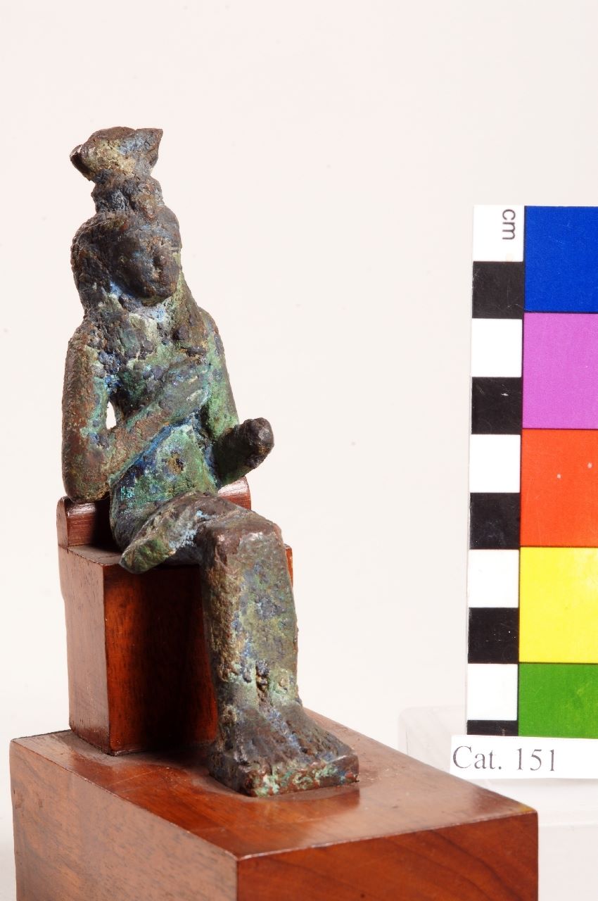 Figura di Iside seduta (identificabile con il motivo della cosiddetta ‘Isis lactans’). La dea porta una corona hathorica costituita da un disco solare, rotto, contornato da corna di vacca poste su un modio. La dea porta una parrucca tripartita decorata con la spoglia di avvoltoio. Iside porta la mano destra – con le dita modellate – verso il seno sinistro. Il braccio destro è piegato e l'avambraccio è rotto. Sulle gambe della dea siede la figura di Arpocrate, che manca per la maggior parte, solo una parte delle gambe è ancora presente. I piedi poggiano su una base, dalla quale sporge un tenone a sezione quadrata. L'oggetto è realizzato con la tecnica della cera persa per la fusione piena.