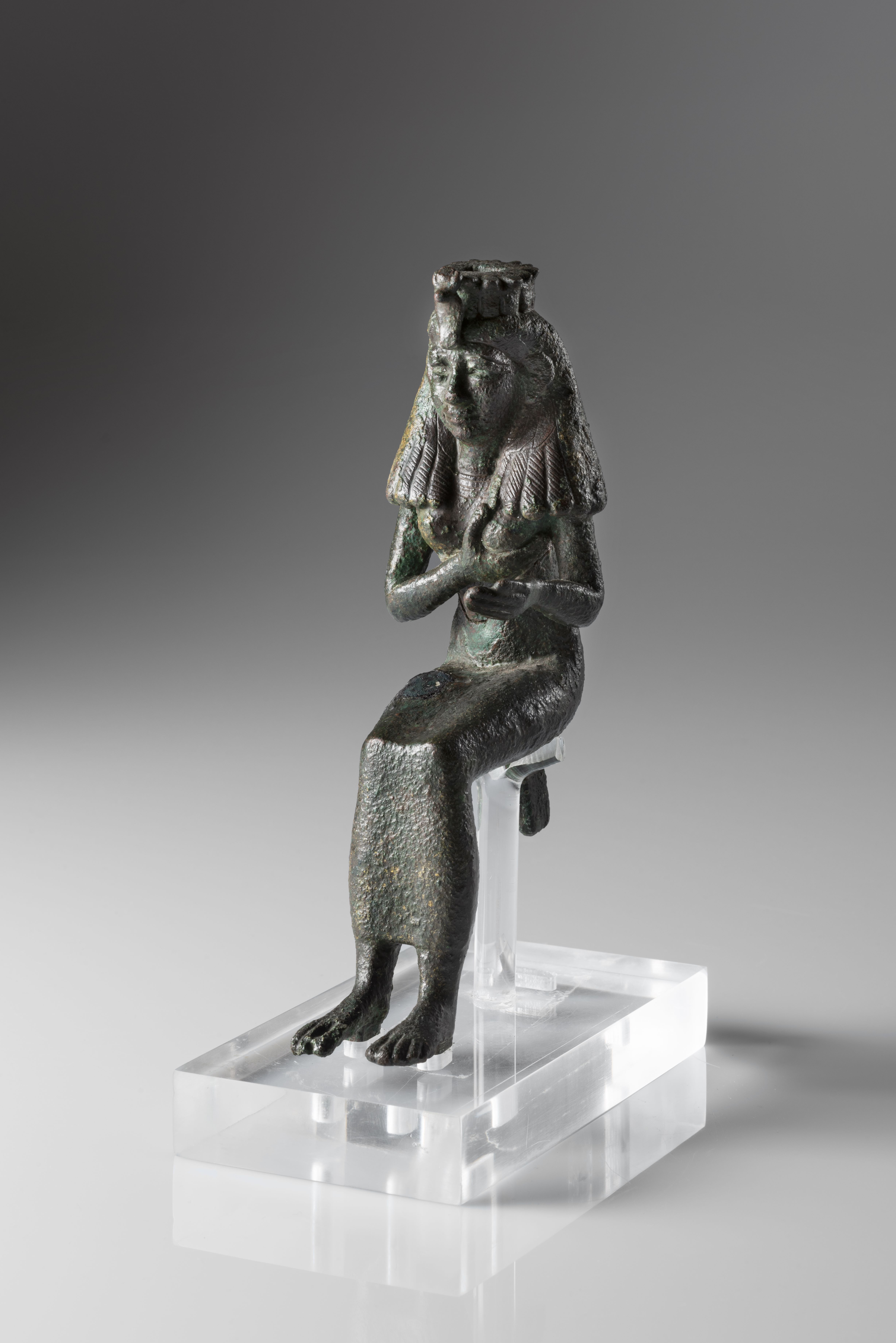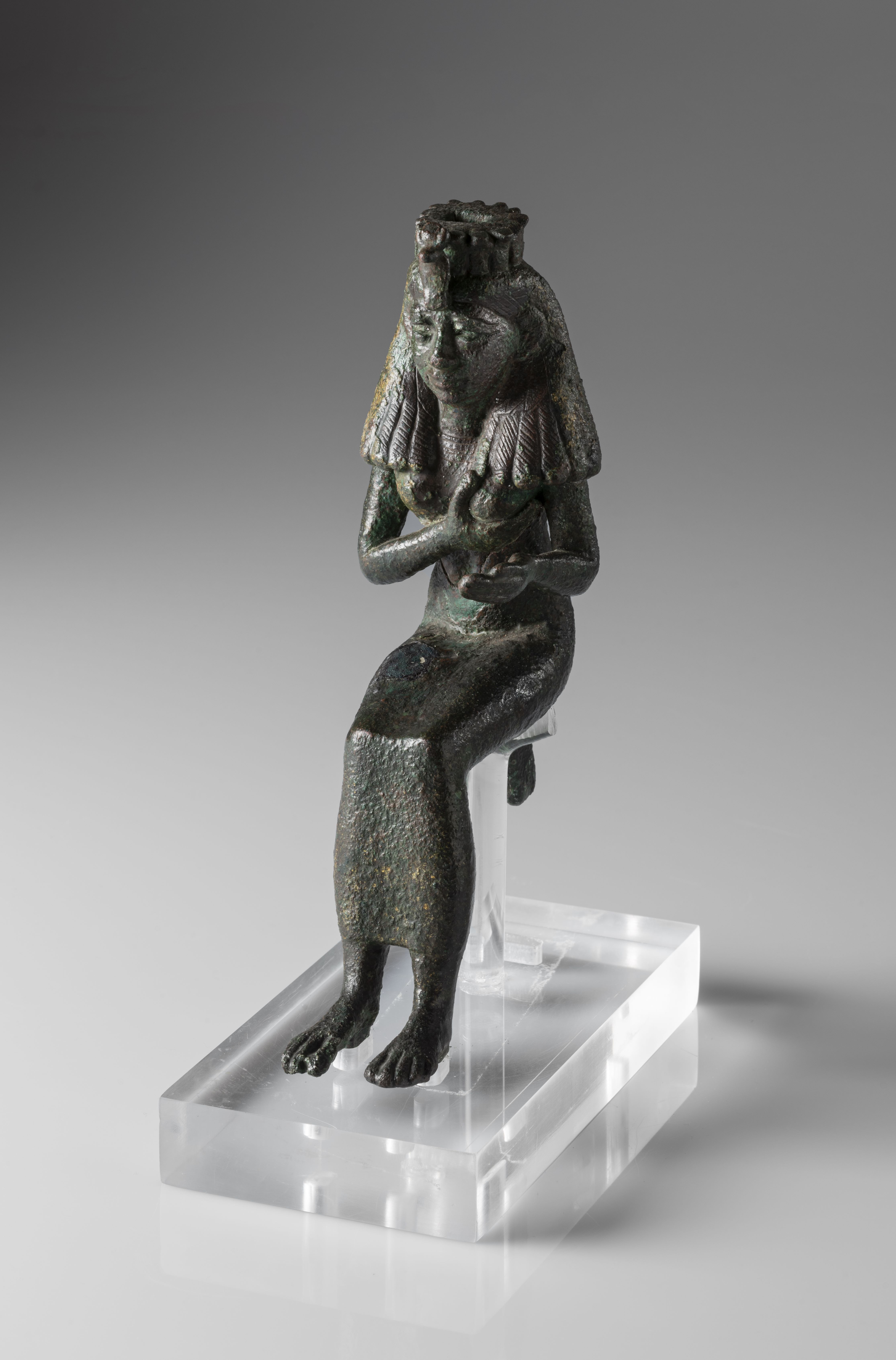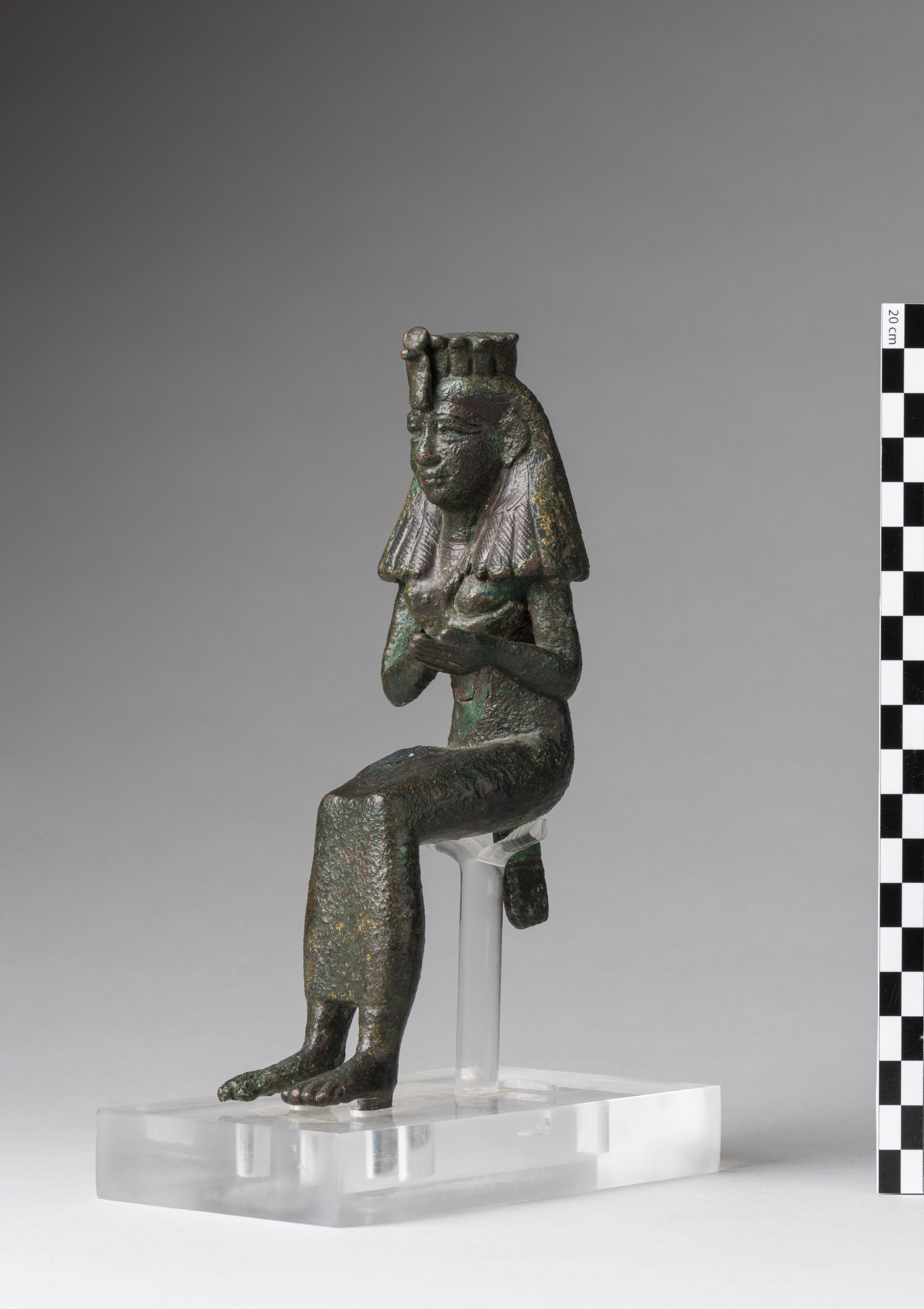 Figura di Iside assisa (identificabile con il motivo della cosiddetta ‘Isis lactans’). Sul capo ha un modio a giro di urei con un alloggiamento rettangolare per la parte superiore del copricapo, che ora manca. La dea porta una parrucca pari a ciocche decorata con la spoglia di avvoltoio. La parrucca presenta un ureo sporgente con un copricapo di corna e disco solare. Le sopracciglia e gli occhi della dea sono incavati per l'intarsio, che ora manca. La dea porta un collare formato da quattro fasce lisce e pendenti a goccia e indossa un vestito lungo fino alle caviglie. Iside porta la mano destra verso il seno sinistro, mentre con la mano destra probabilmente reggeva il capo di Arpocrate, ora mancante. Sotto la parrucca e sull'addome è visibile una crepa irregolare; infatti, l'oggetto probabilmente era rotto in due parti ed è stato riparato di recente. Sulla parte superiore della coscia destra era presente una lacuna, probabilmente dovuta al distacco della figura di Arpocrate. Questa lacuna è stata ridipinta in epoca moderna. Sotto il fondoschiena è presente un tenone rettangolare. Altri due tenoni rettangolari sporgono da sotto i piedi. L'oggetto è realizzato con la tecnica della cera persa per la fusione cava.