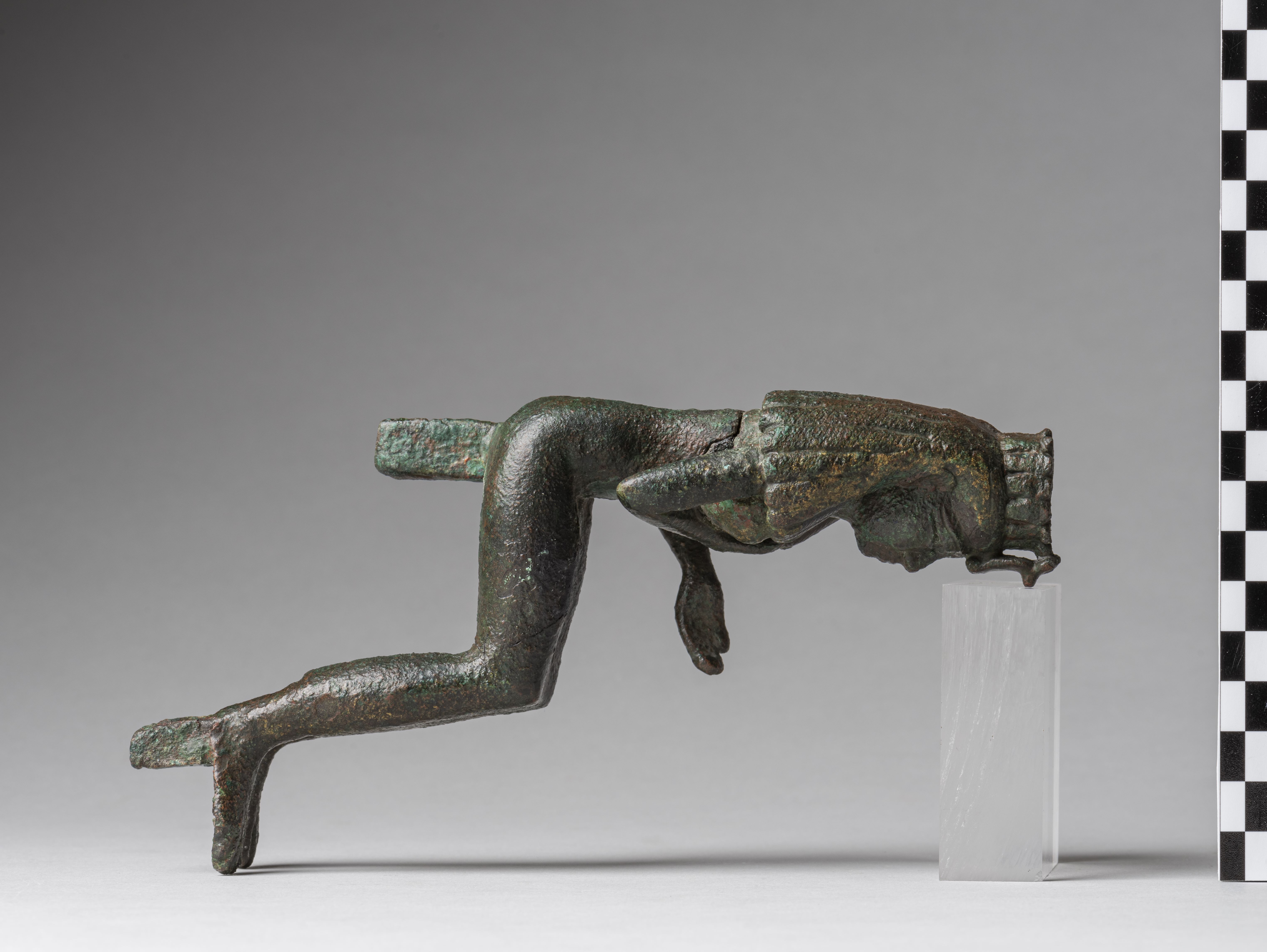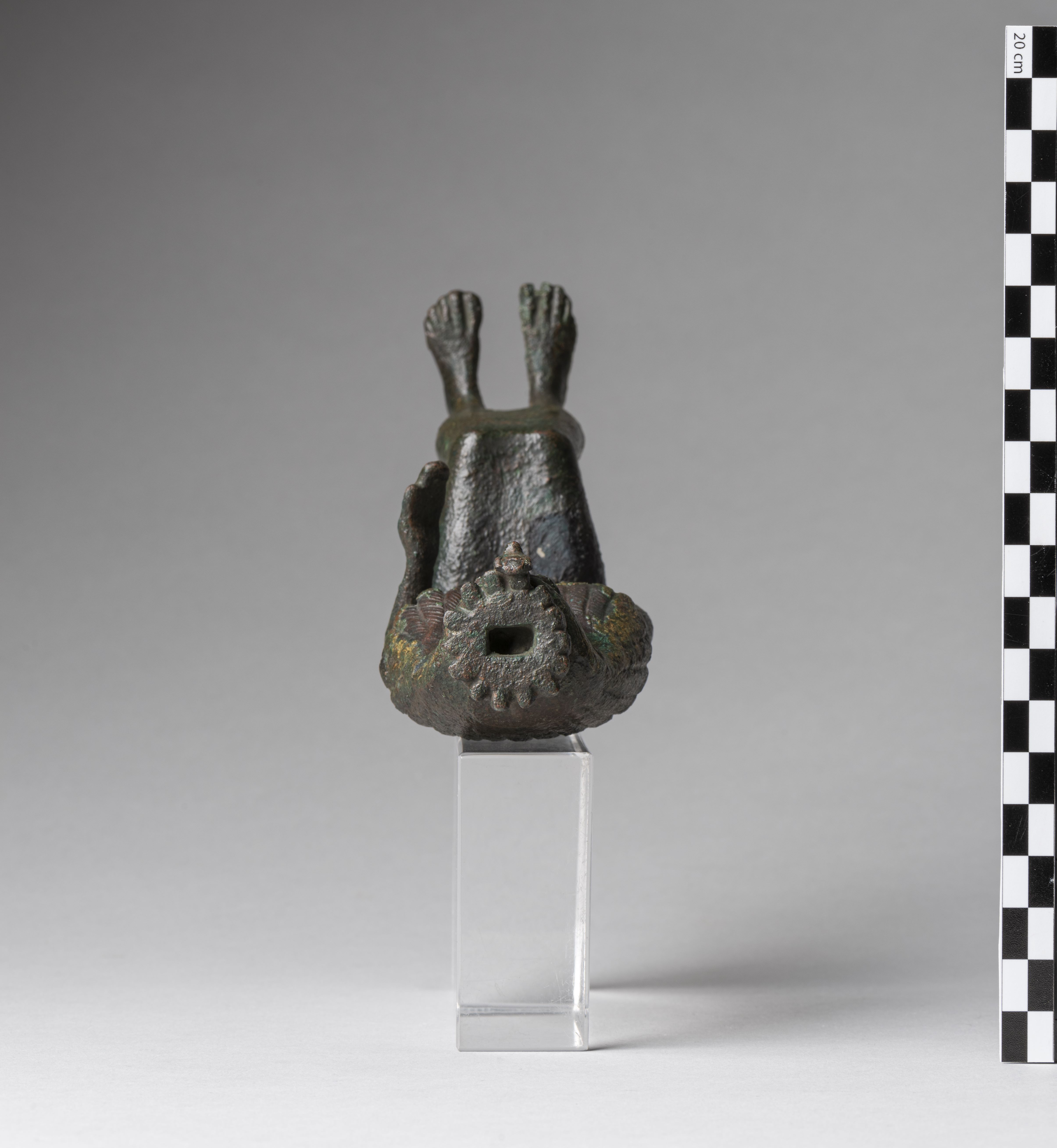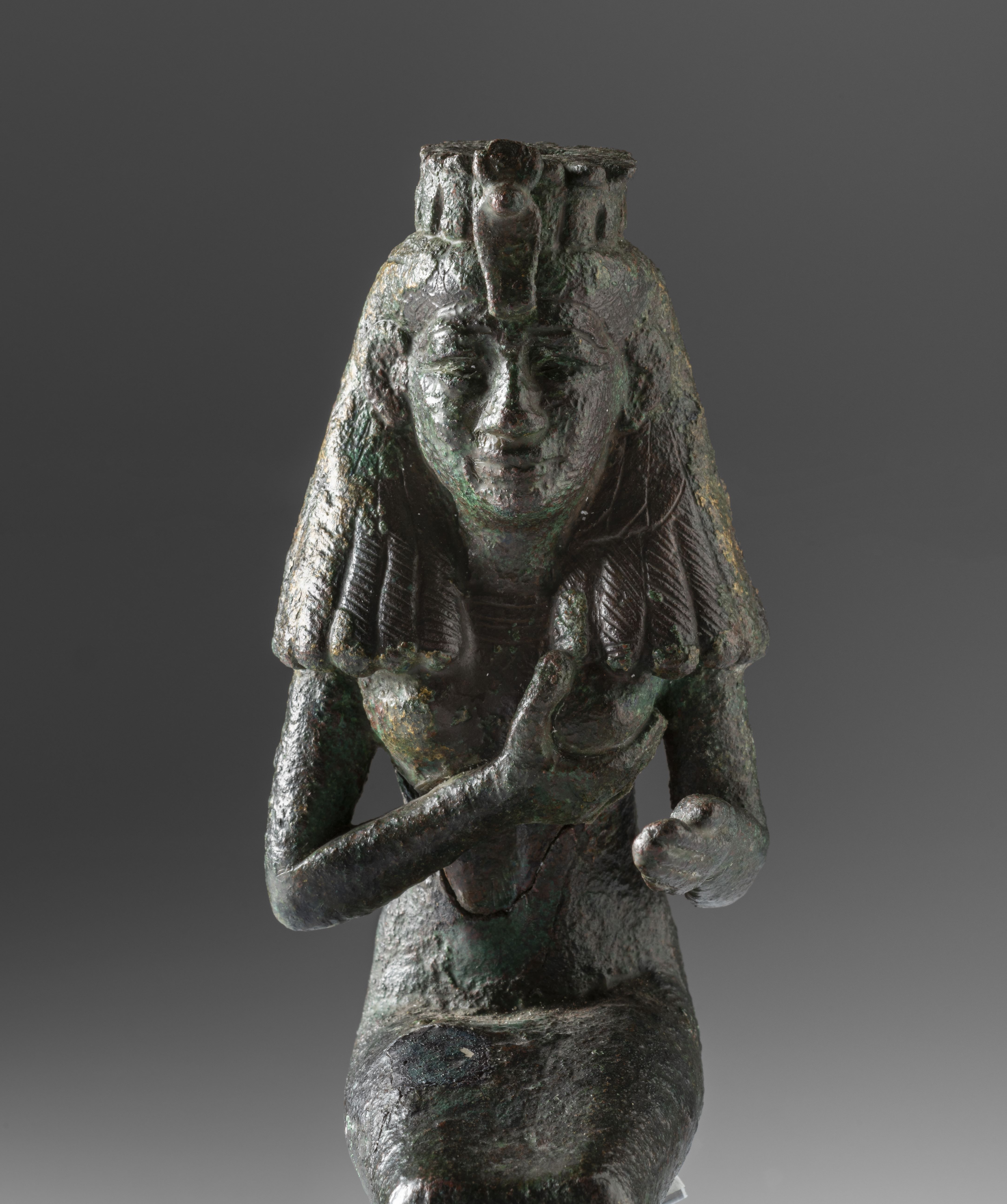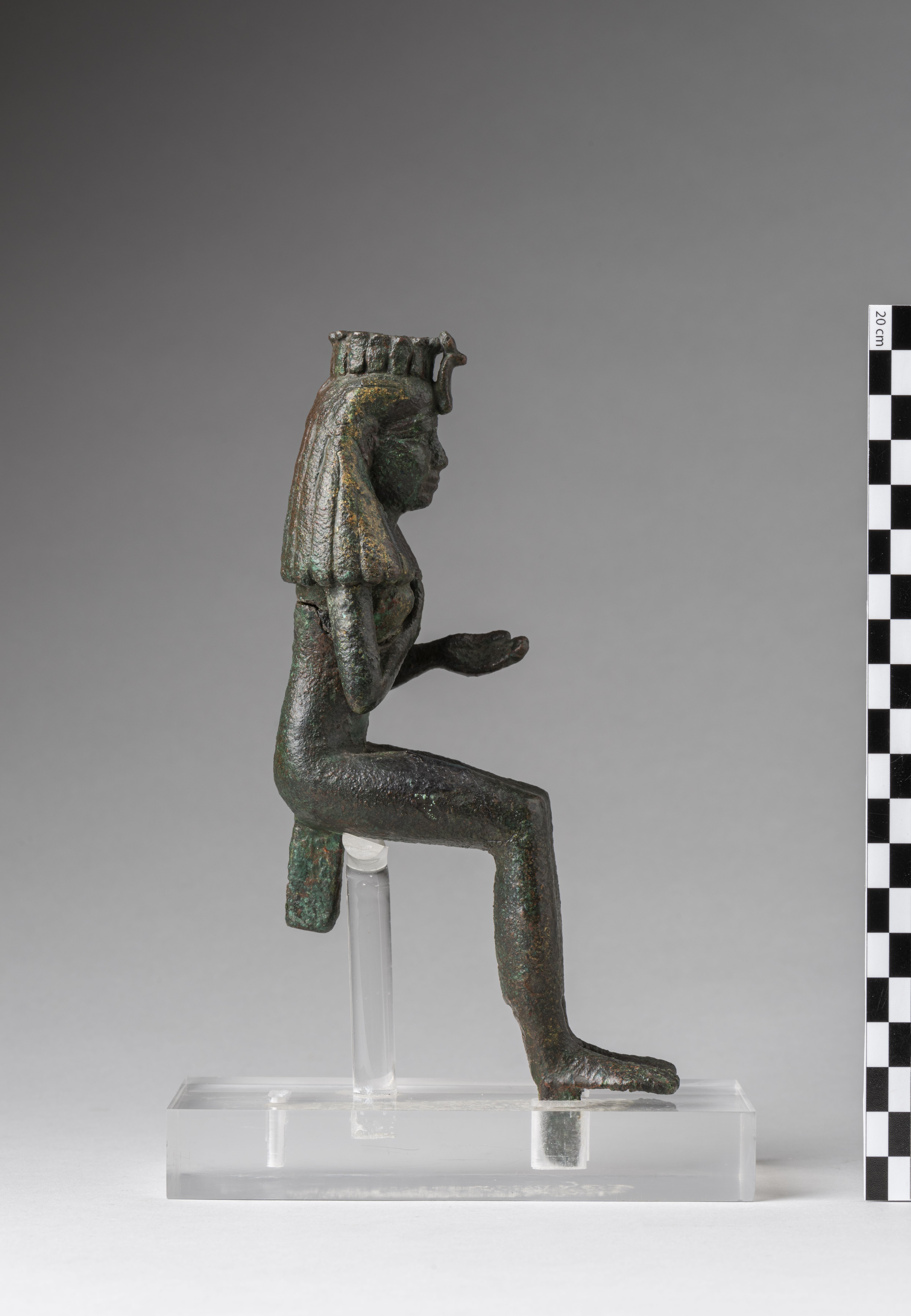 Figura di Iside assisa (identificabile con il motivo della cosiddetta ‘Isis lactans’). Sul capo ha un modio a giro di urei con un alloggiamento rettangolare per la parte superiore del copricapo, che ora manca. La dea porta una parrucca pari a ciocche decorata con la spoglia di avvoltoio. La parrucca presenta un ureo sporgente con un copricapo di corna e disco solare. Le sopracciglia e gli occhi della dea sono incavati per l'intarsio, che ora manca. La dea porta un collare formato da quattro fasce lisce e pendenti a goccia e indossa un vestito lungo fino alle caviglie. Iside porta la mano destra verso il seno sinistro, mentre con la mano destra probabilmente reggeva il capo di Arpocrate, ora mancante. Sotto la parrucca e sull'addome è visibile una crepa irregolare; infatti, l'oggetto probabilmente era rotto in due parti ed è stato riparato di recente. Sulla parte superiore della coscia destra era presente una lacuna, probabilmente dovuta al distacco della figura di Arpocrate. Questa lacuna è stata ridipinta in epoca moderna. Sotto il fondoschiena è presente un tenone rettangolare. Altri due tenoni rettangolari sporgono da sotto i piedi. L'oggetto è realizzato con la tecnica della cera persa per la fusione cava.
