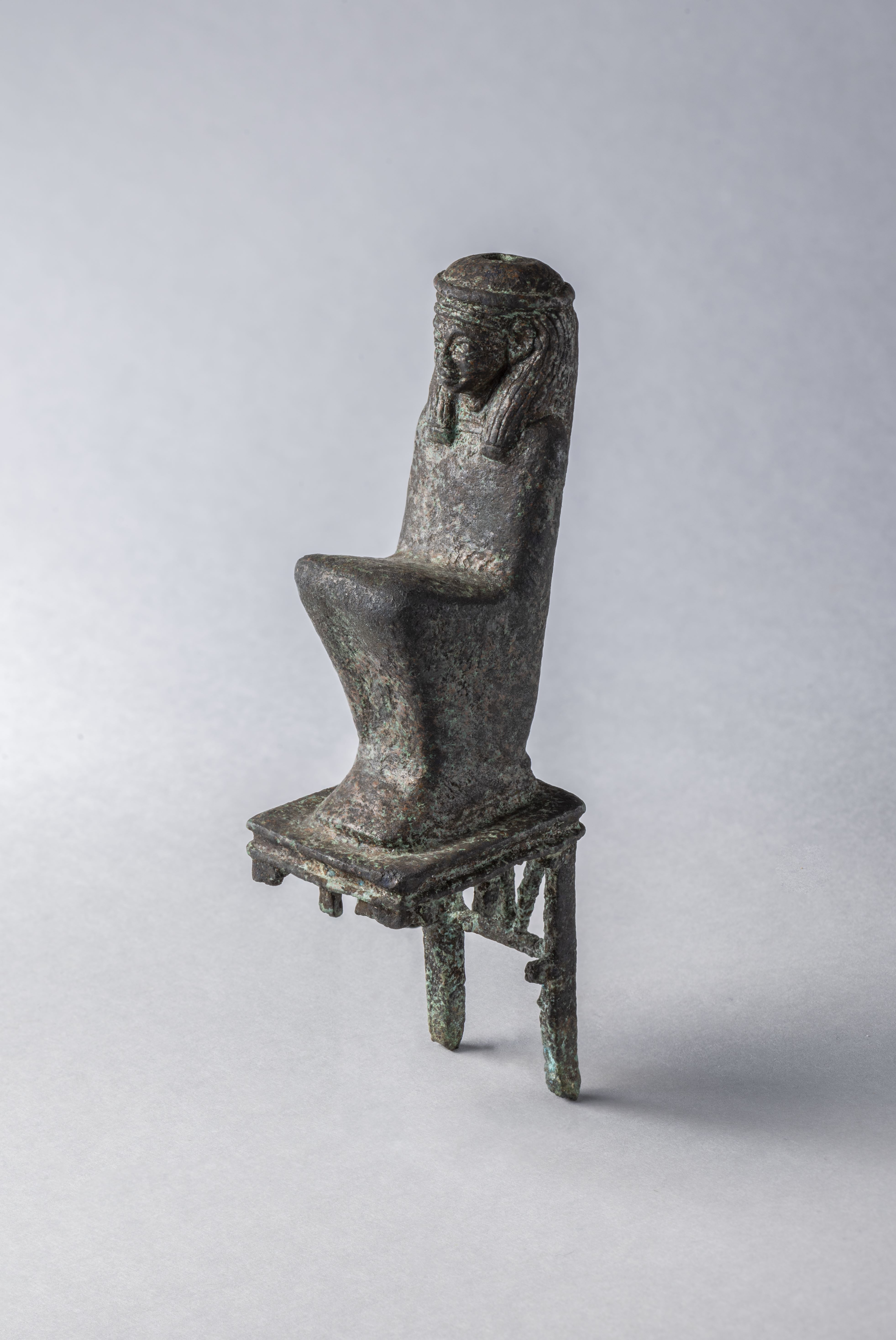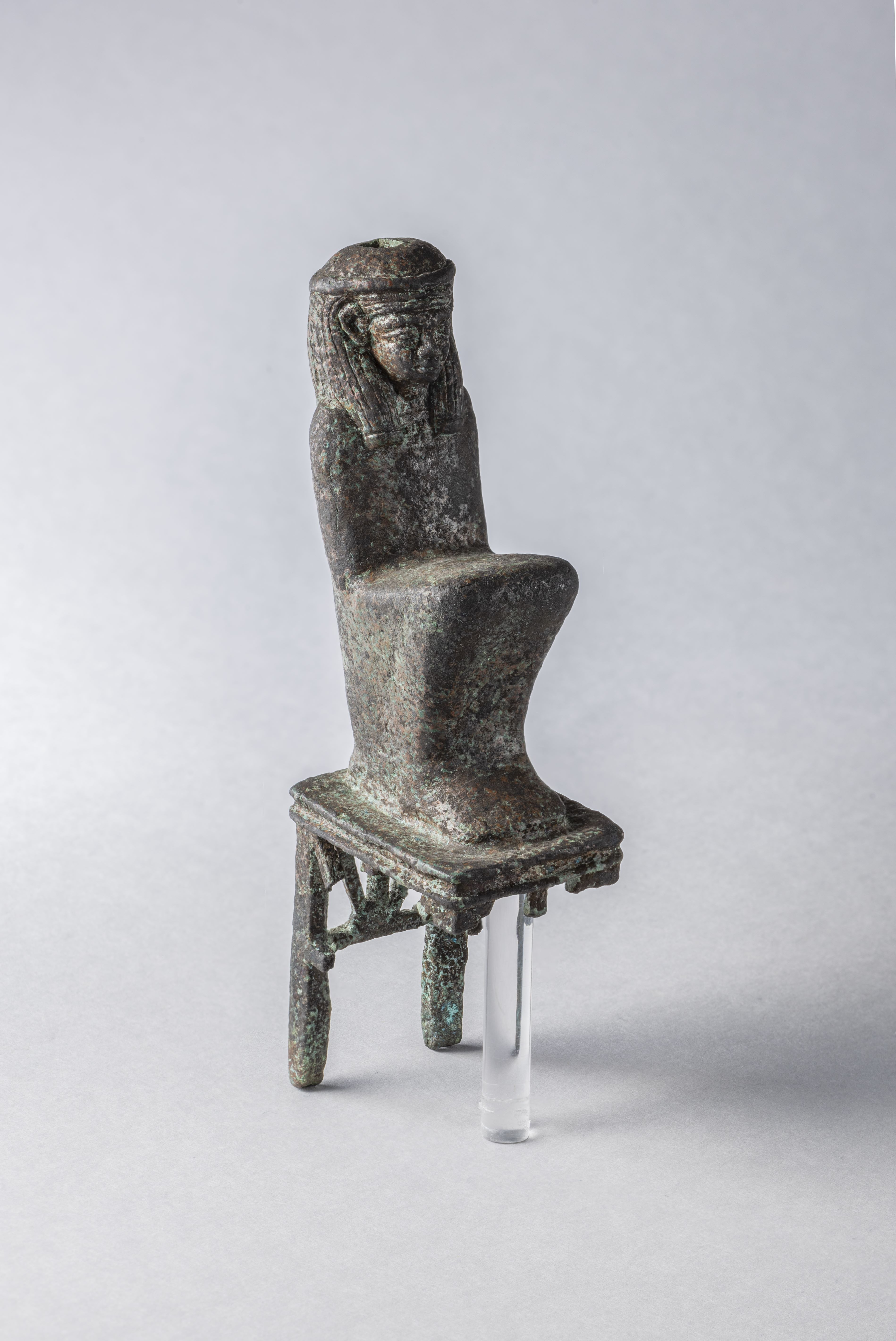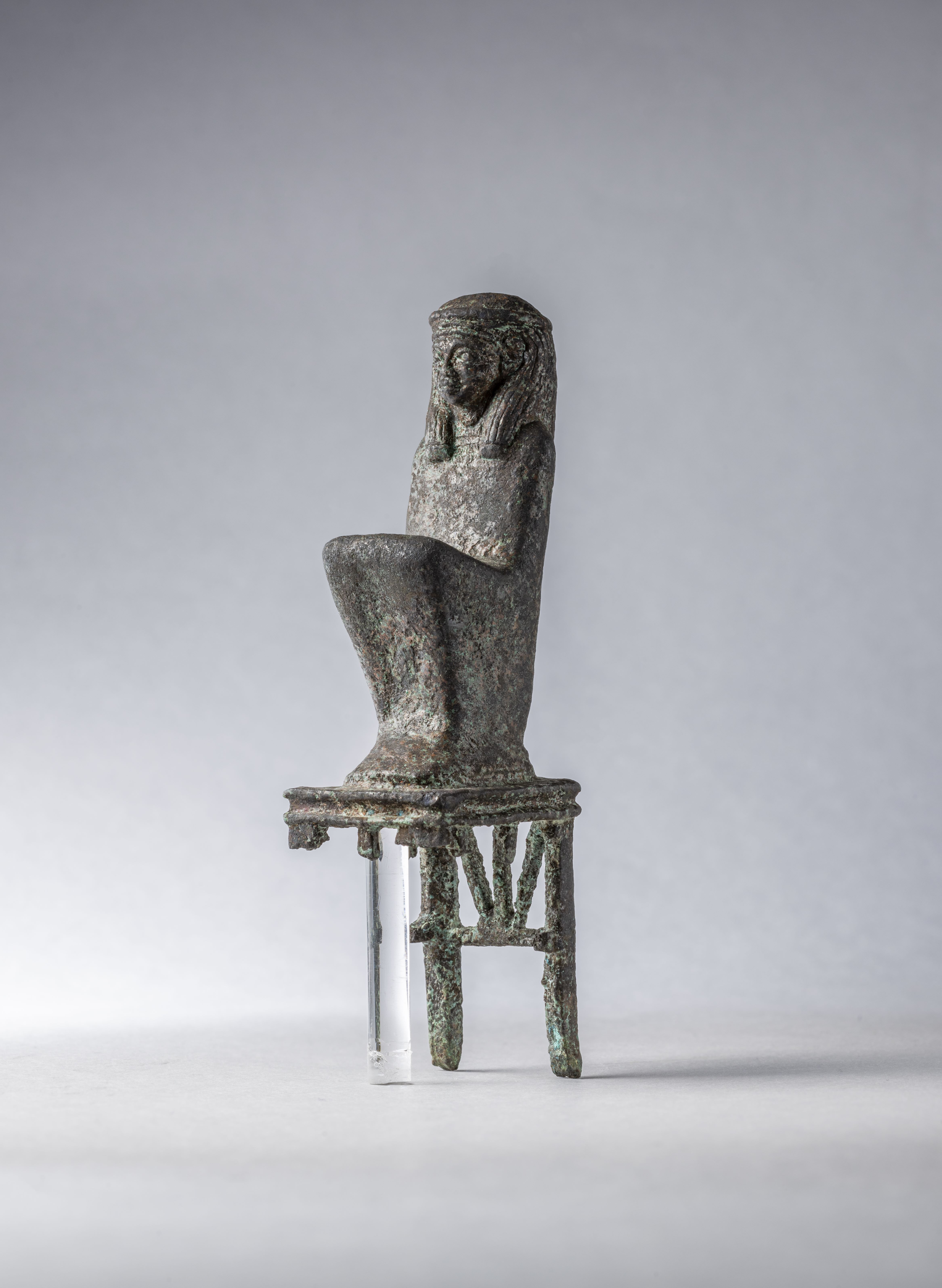 Figura di Maat accovacciata su un sedile decorato. Maat indossa una parrucca tripartita, che probabilmente era sormontata da una lunga piuma di struzzo, ora mancante. Sulla sommità della parrucca è presente un foro a sezione quadrata per inserire la piuma. La parrucca ha un laccio intorno alla testa. La dea indossa un abito che non permette di distinguere le membra, e poggia su un sedile con un basamento rettangolare con il profilo rientrante. Il sedile è fatto da 4 gambe a sezione quadrata e la parte superiore è chiusa e decorata con tre sbarre che si incontrano in un unico vertice in basso. Forse la figura faceva parte di un gruppo. L'oggetto sembra essere stato realizzato con la tecnica della cera persa per la fusione cava.