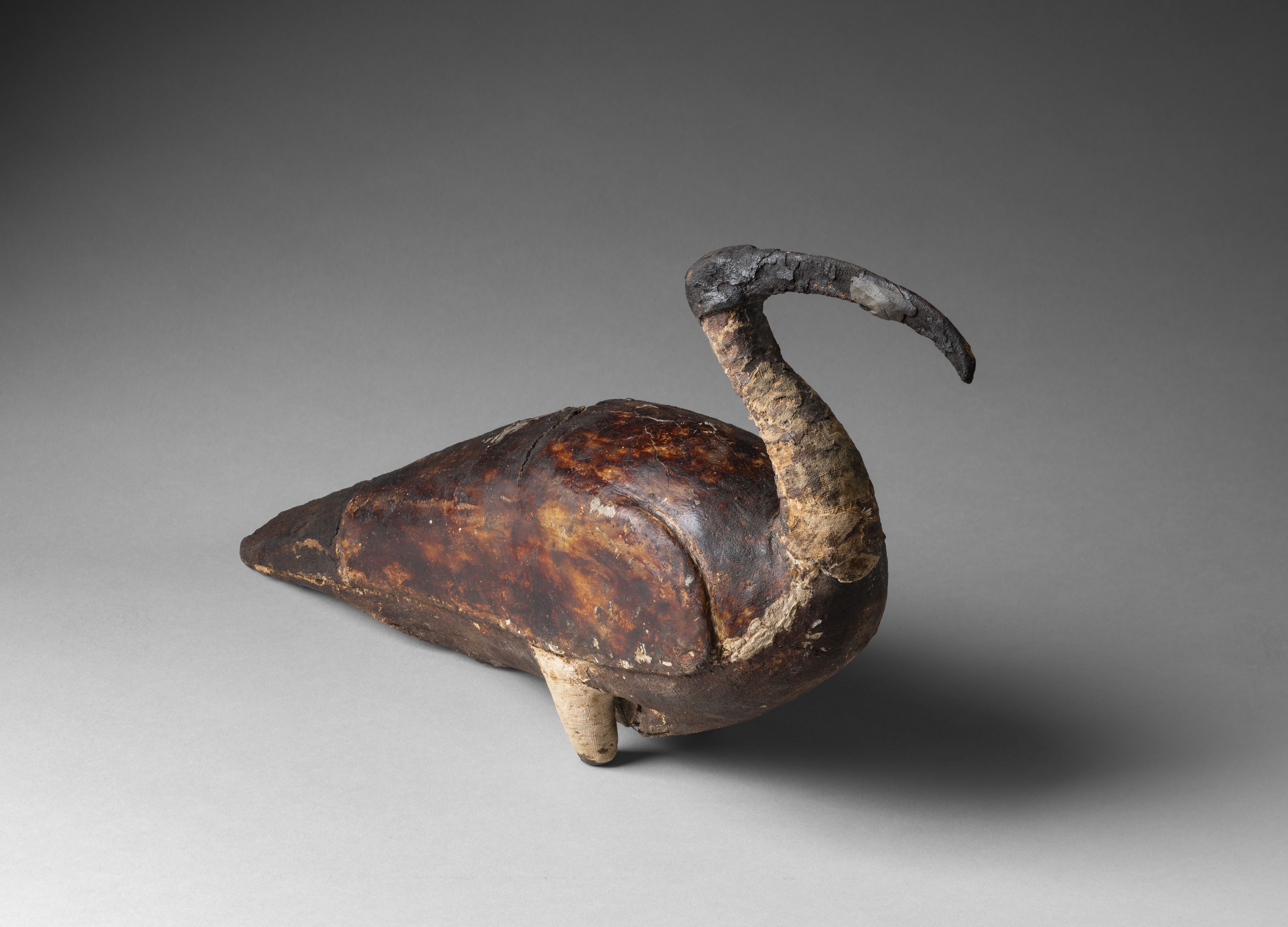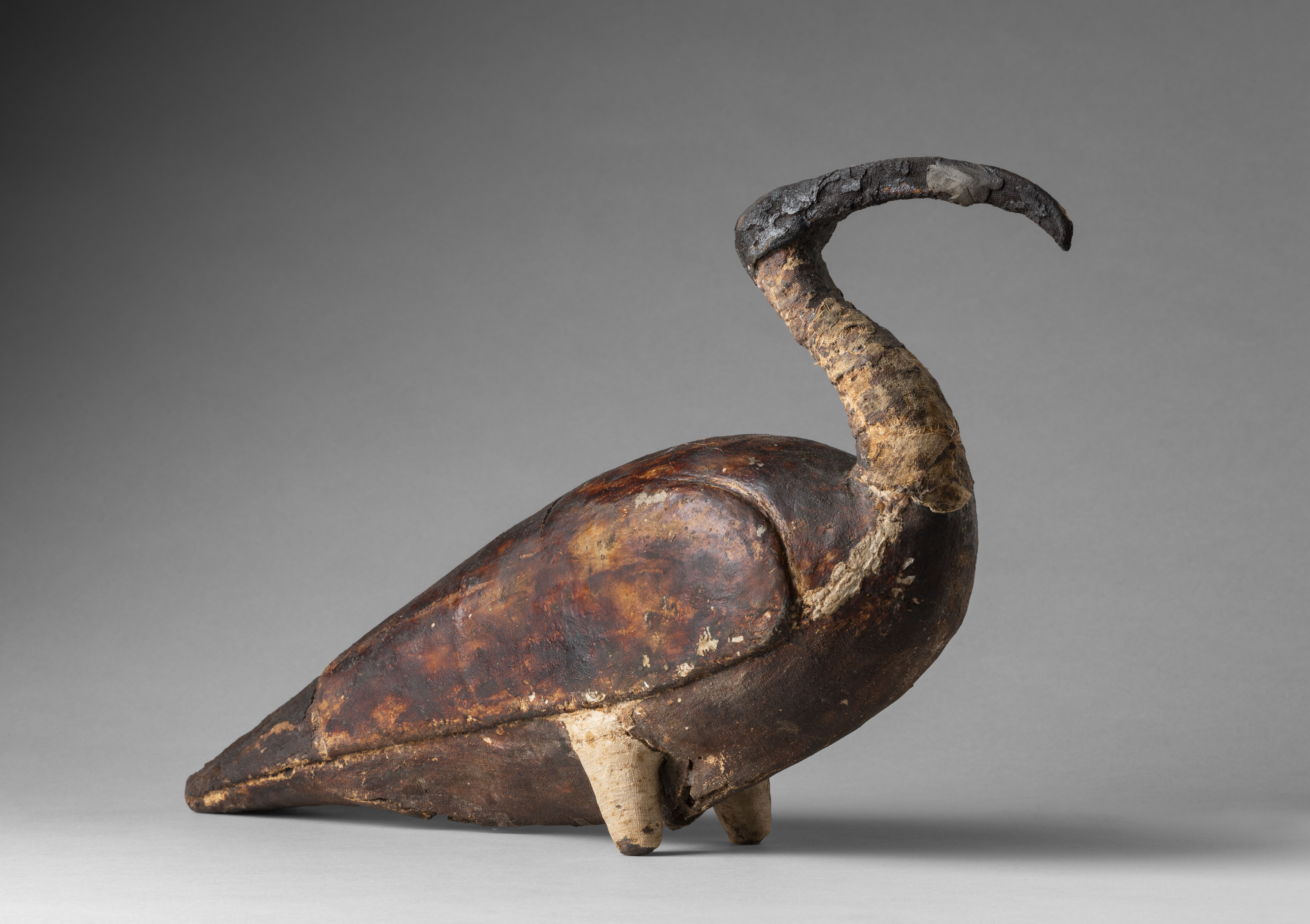 Sarcofago in cartonnage a forma di ibis. La testa, il becco e il collo sono in tessuto profondamente impregnato di una sostanza nera simile alla resina. Il lato dorsale, che comprende le ali e il dorso, è costituito da un unico pezzo accuratamente modellato di lino e gesso e poi dipinto. La coda, che è squadrata, è stata modellata in modo che siano visibili le linee indicative delle piume. Il lato ventrale è ricoperto da almeno otto strati di lino, tirati in modo da coprire il contenuto. All'interno sono presenti solo tessuti.