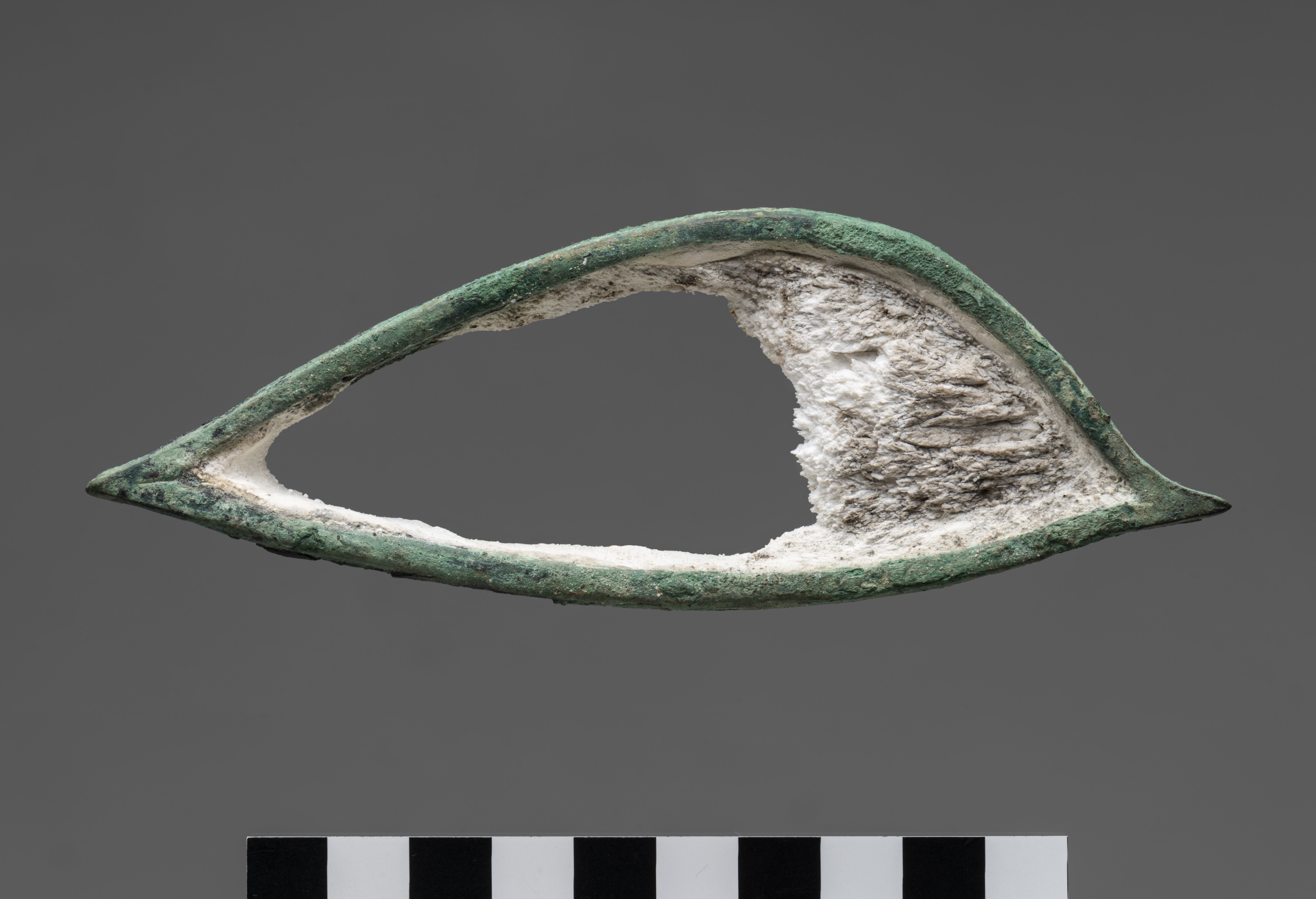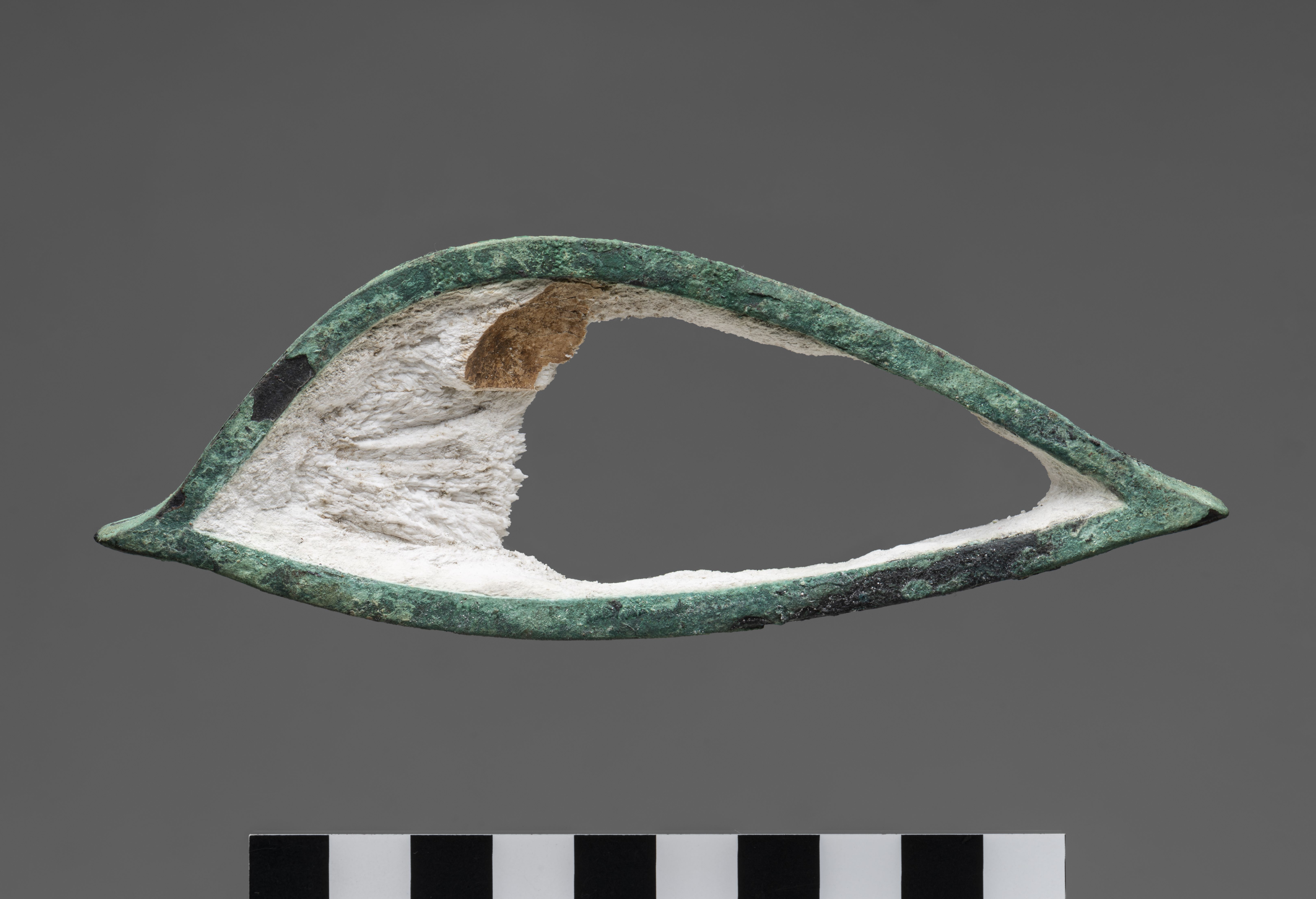 Intarsio per occhio sinistro di statua. La parte esterna è in bronzo. All’interno si conservano residui di pietra, probabilmente calcite o travertino. L'oggetto è realizzato con la tecnica della cera persa per la fusione piena.