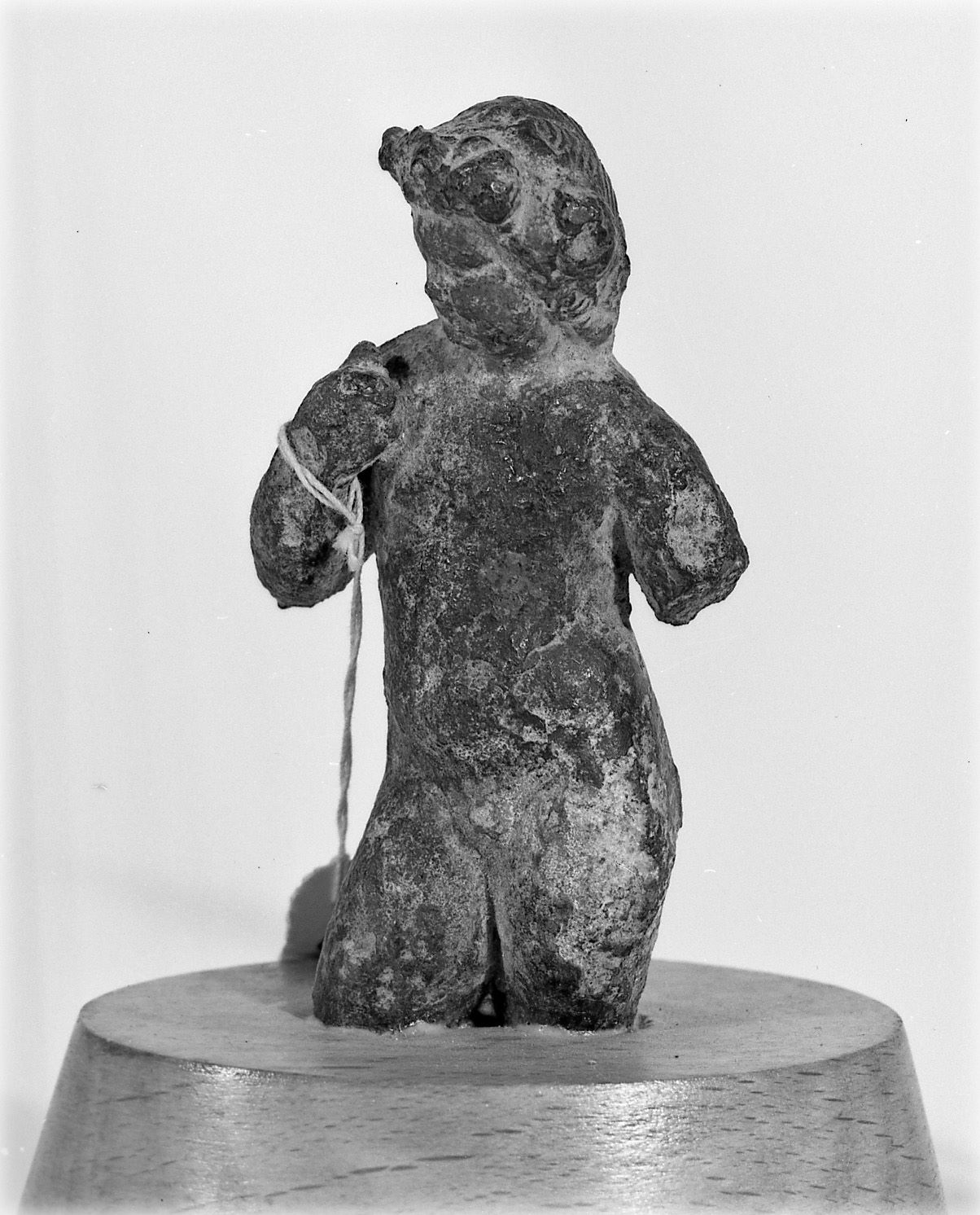 Figura di Arpocrate in stile ellenistico, raffigurato come un fanciullo nudo e stante. Ha una capigliatura a riccioli che gli incorniciano il viso e un berretto a punta inciso sulla parte posteriore della testa. Il viso è paffuto e i lineamenti sono appena visibili a causa della corrosione. La figura è nel complesso paffuta, la posizione è plastica e forma una sorta di S, la testa rivolta verso destra insieme al torso. Apocrate porta il dito indice, mancante, della mano destra verso la bocca. Il braccio sinistro è mancante. La parte inferiore delle gambe è mancante. La figura è montata su una moderna base in legno. L'oggetto è realizzato con la tecnica della cera persa per la fusione piena.