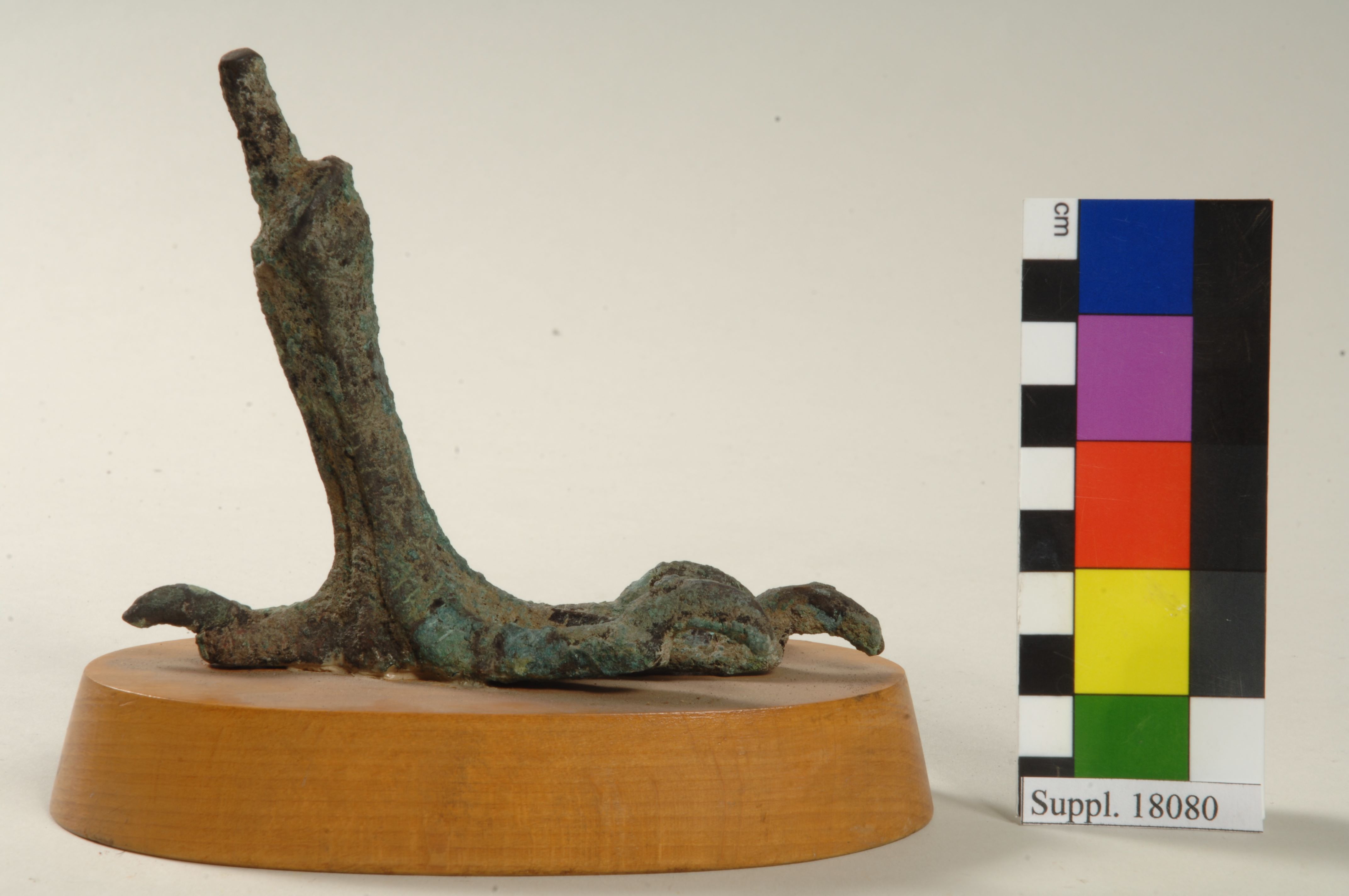 Zampa di un falco probabilmente parte di una statuetta in legno. Le incisioni sulla zampa indicano il pattern della pelle. Gli artigli sono ricurvi. Dalla sommità della zampa sporge un tenone a sezione circolare per l’inserimento nel corpo della statuetta. Un secondo tenone circolare sporge da sotto la zampa. L'oggetto è realizzato con la tecnica della cera persa per la fusione piena.